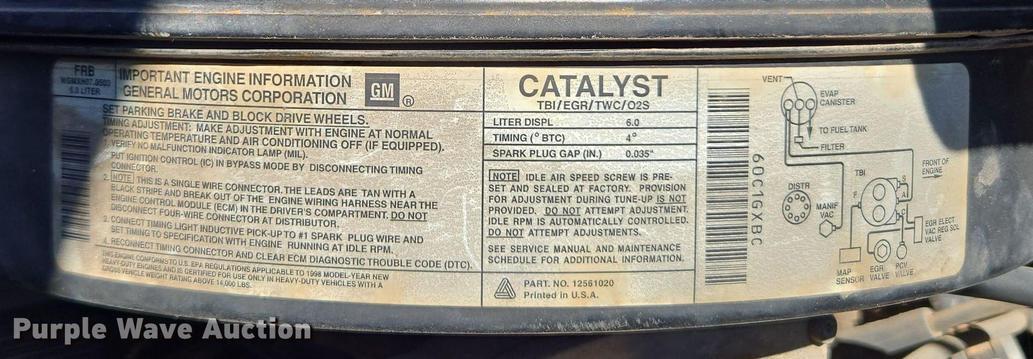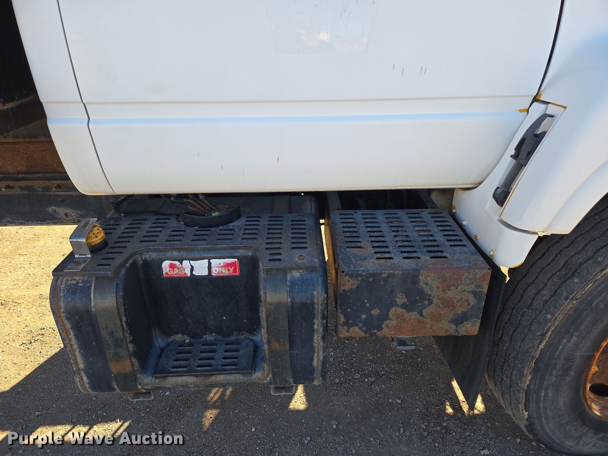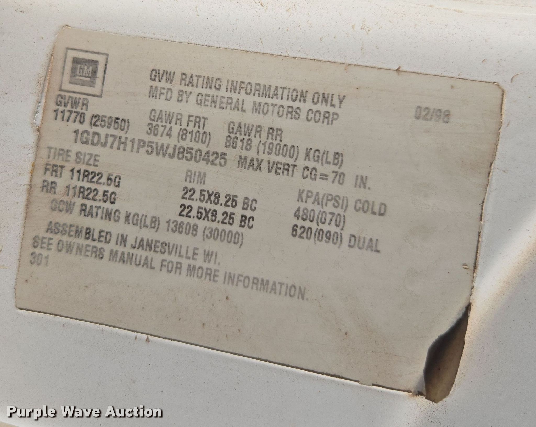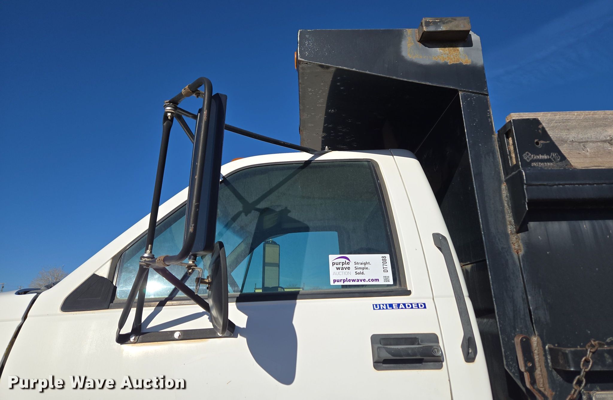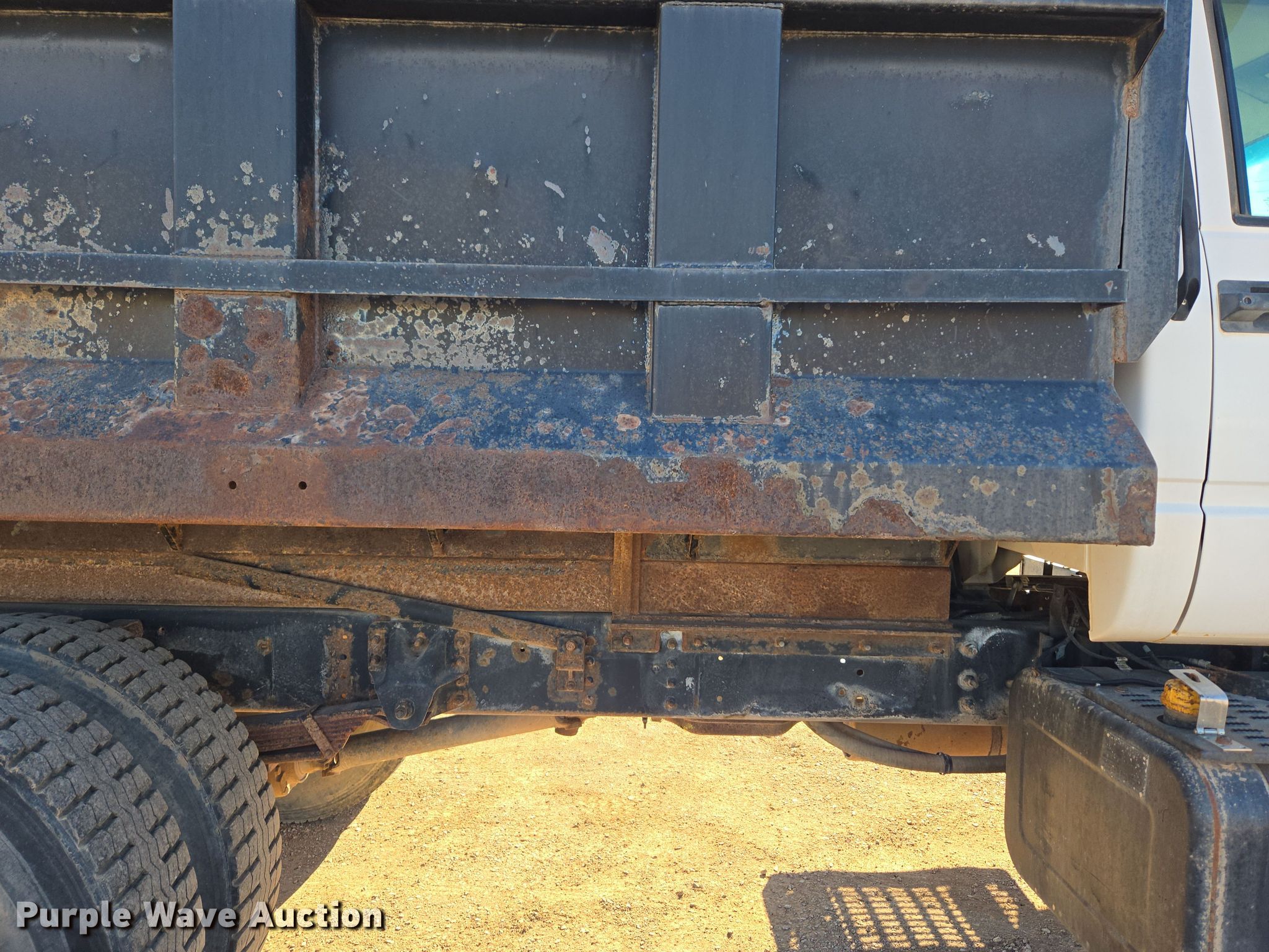1998 GMC C7H042 dump truck. Miles: 150,308 on odometer, VIN: 1GDJ7H1P5WJ850425. Engine Displacement: 6.0L, Cylinders: 8, Fuel type: Gas. Transmission Automatic. Chassis Axles: Single, Suspension: Spring, PTO, Brakes: Hydraulic, GVWR: 25,950 lbs FAWR: 8,100 lbs, RAWR: 19,000 lbs. Interior AC, Heat, Brake controller. Features Dump bed Godwin 300T, 10' L x 95" W, Side height: 45", Side board height: 7", Bed type: Steel, Ram: Single, End gate: Manual. Tires Size: 11R22.5. South Dakota title. Beka Corporation. Rapid City, SD 57702