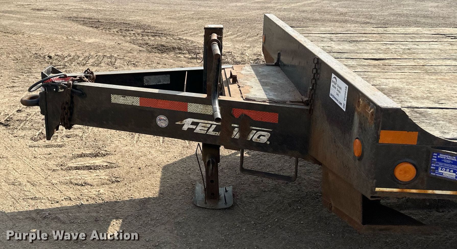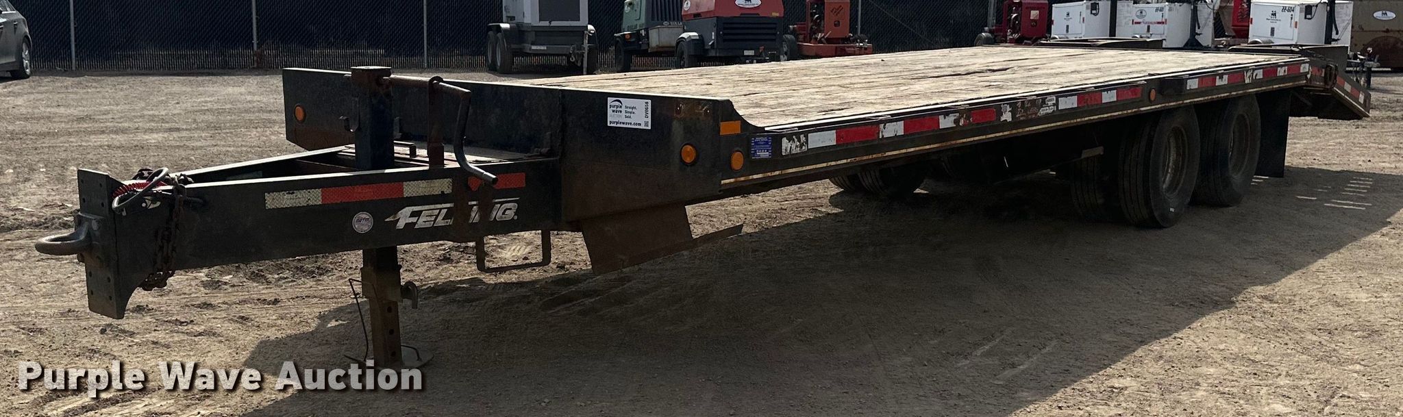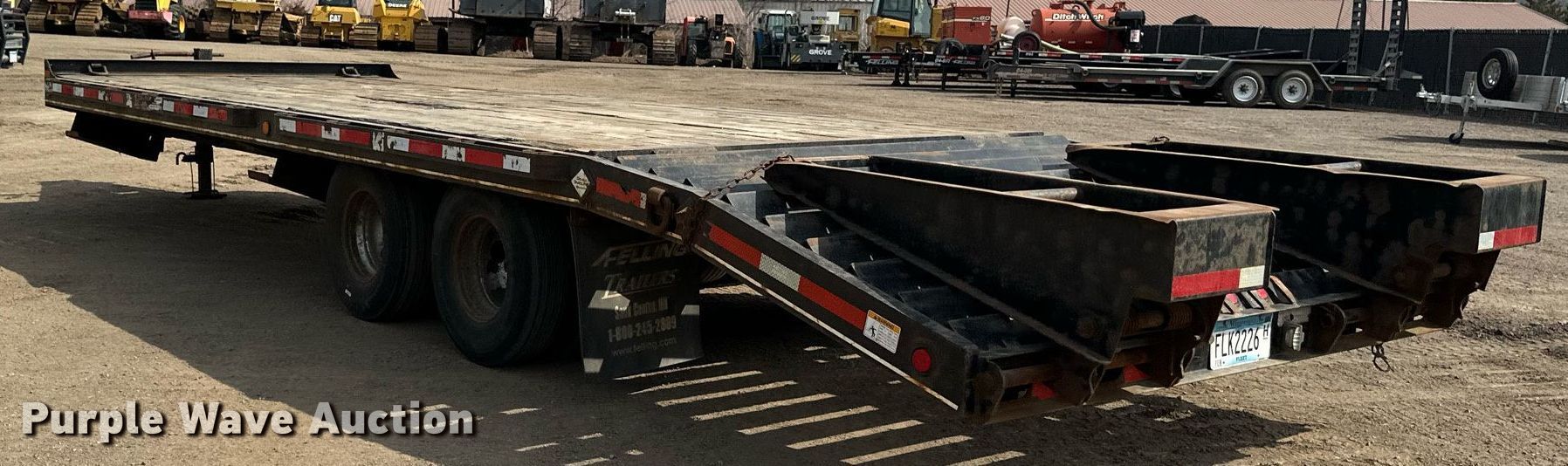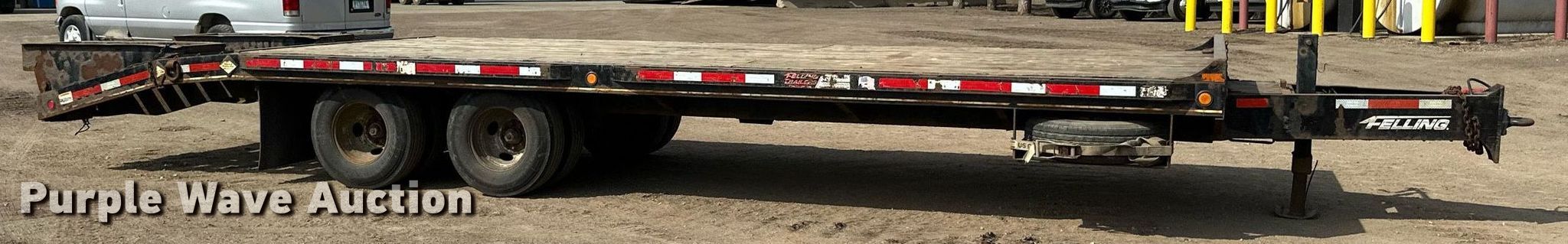 2012 Felling FT18 equipment trailer. VIN: 5FTDE2721C1038735. Dimensions Overall: 33' 5" L x 102" W, Deck: 21' L x 102" W, Deck height: 3', Tail length: 6', Ramps: Manual Length: 4' 8". Features Deck type: Wood. Chassis Hitch: Pintle, Landing gear: Single, Suspension: Spring, Brakes: Electric, Axles: Tandem, GVWR: 23,800 lbs. Tires Steel wheels, Size: ST235/85R16. Minnesota title. Title distribution may be delayed up to 14 days from verification of funds. Minger Construction Co., Inc.. Jordan, MN 55352