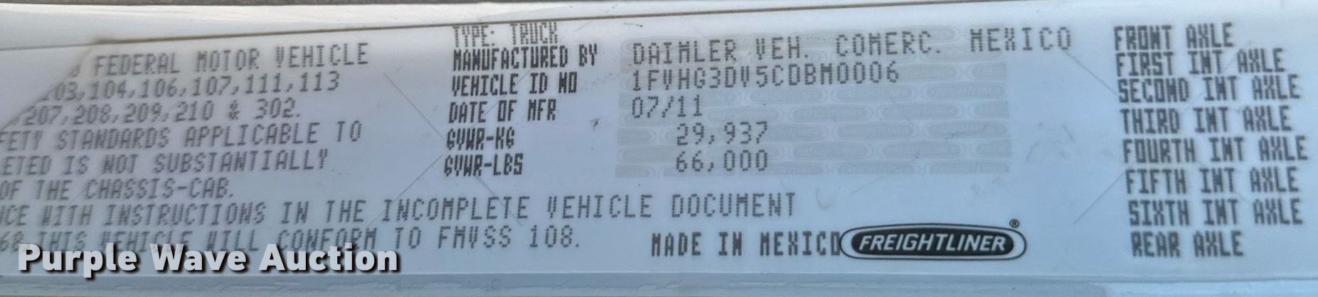 2012 Freightliner 114SD sewer jetter truck. Miles: 207,564 on odometer, Hours: 9,979 on meter, VIN: 1FVHG3DV5CDBM0006. Engine Detroit Diesel DD13, Displacement: 12.8L, Cylinders: 6, Fuel type: Diesel. Transmission Eaton Fuller, Manual, Speed: 10. Chassis Axles: Tandem, Differential lock: Inter-axle, Suspension: Spring over walking beam, Brakes: Air, PTO, GVWR: 66,000 lbs. Interior AC, Heat, Cruise control. Features Tank bed Vactor 2100P PD, Serial: 11-11V-12839, Rear manway, Rear outlet: 8", Vacuum pump Whisper Air, Hose reel Front, Diameter: 1.5", Telescopic boom, Remote control. Tires Front: 425/65R22.5, Rear: 11R22.5. Notes Non-operational vacuum system, electrical issues. Minnesota title. Title distribution may be delayed up to 14 days from verification of funds. Northwest Asphalt inc.. Shakopee, MN 55379