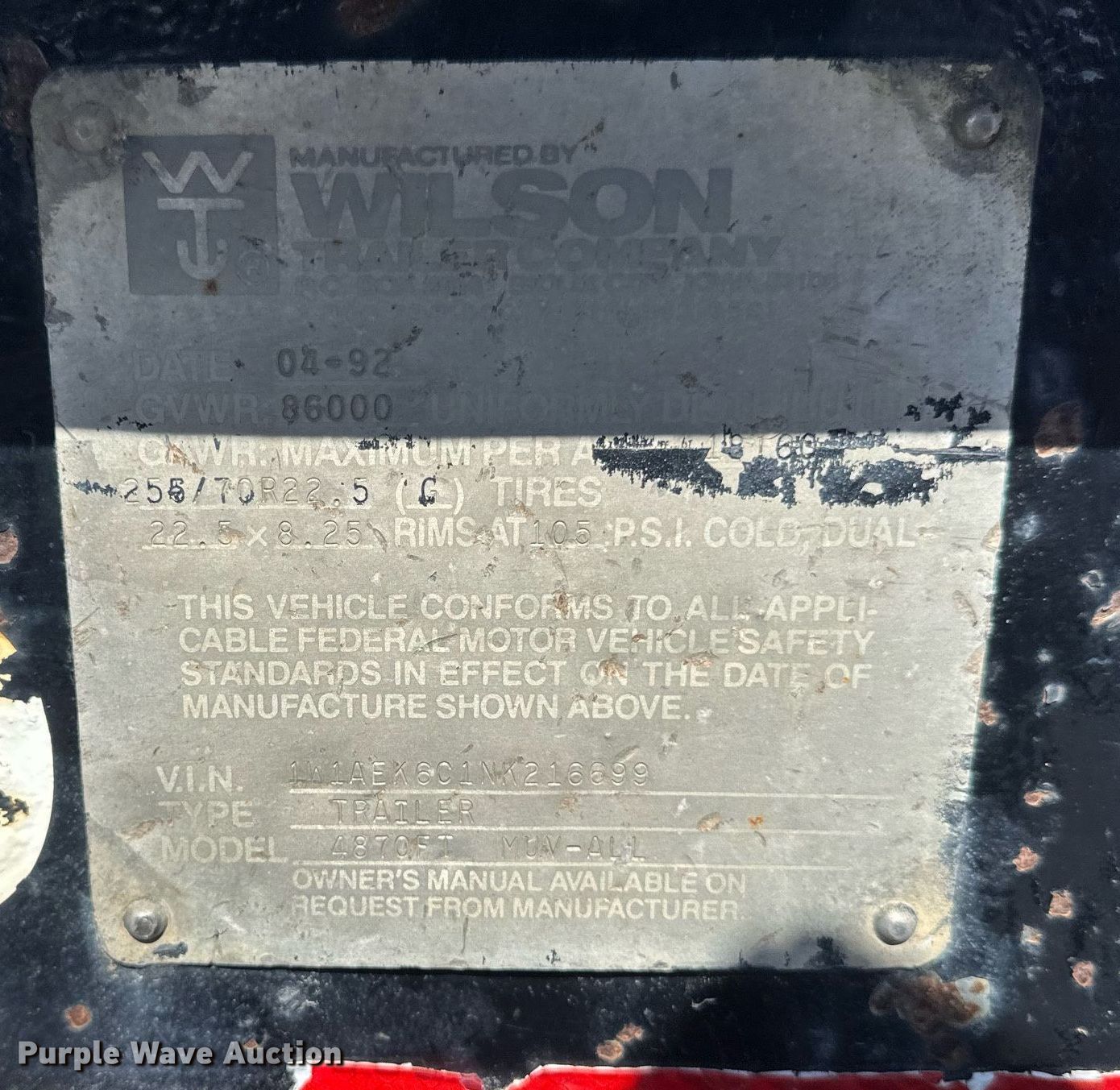 Purple Wave is selling a used Equip. Trailer in Minnesota. This item is a 1992 Muv-All 4870FT drop deck hydraulic tail equipment trailer with the following: VIN: 1W1AEK6C1NK216699