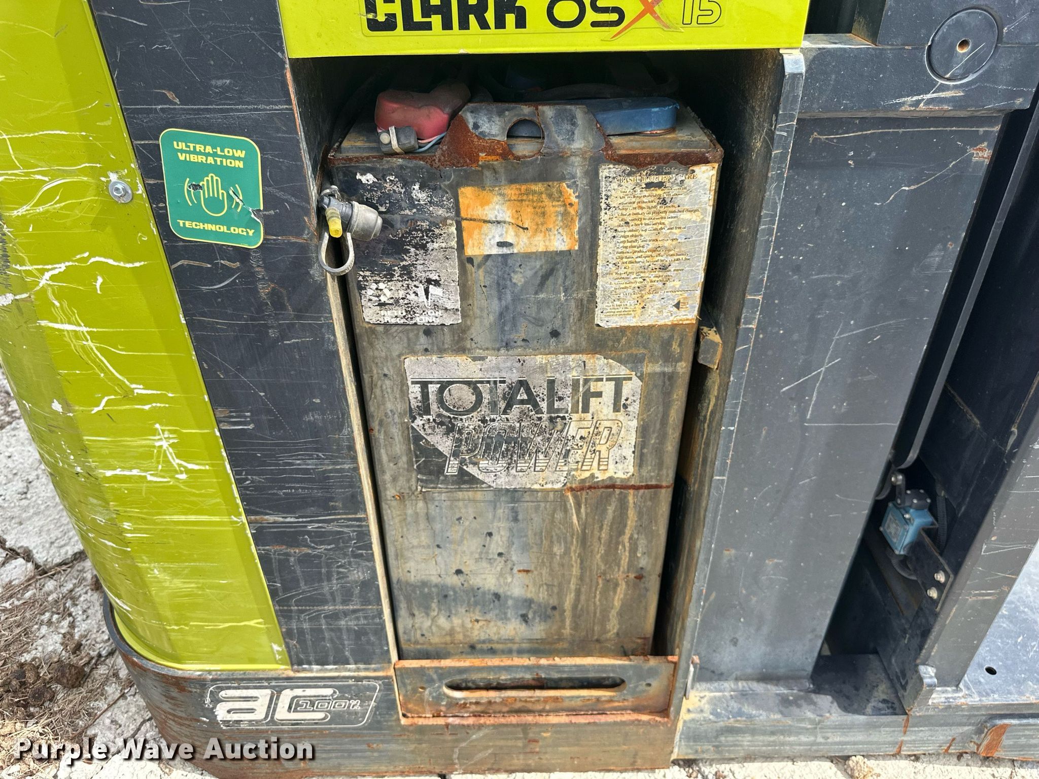 Clark OSX15 order picker. Hours: Unknown, Serial: 0SX15-0393-9798-KP. Electric Motor Serial: 256761, Volts: 36, Charger: Three phase Total lift TL36 Volts: 36.. Transmission Hydrostatic. Features Maximum lift capacity: 3,000 lbs, Maximum lift height: 240", Mast stages: 2, Fork length: 42". Tires Solid. Notes Unknown operating condition of mast, Non-operational unit Unit must be towed or hauled. Ennis, TX 75119