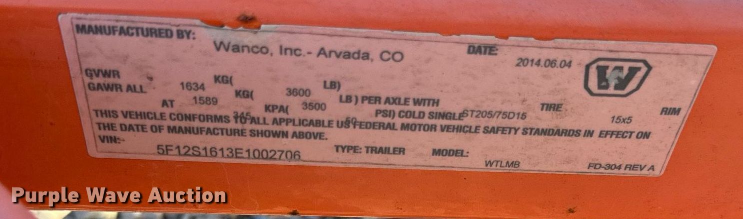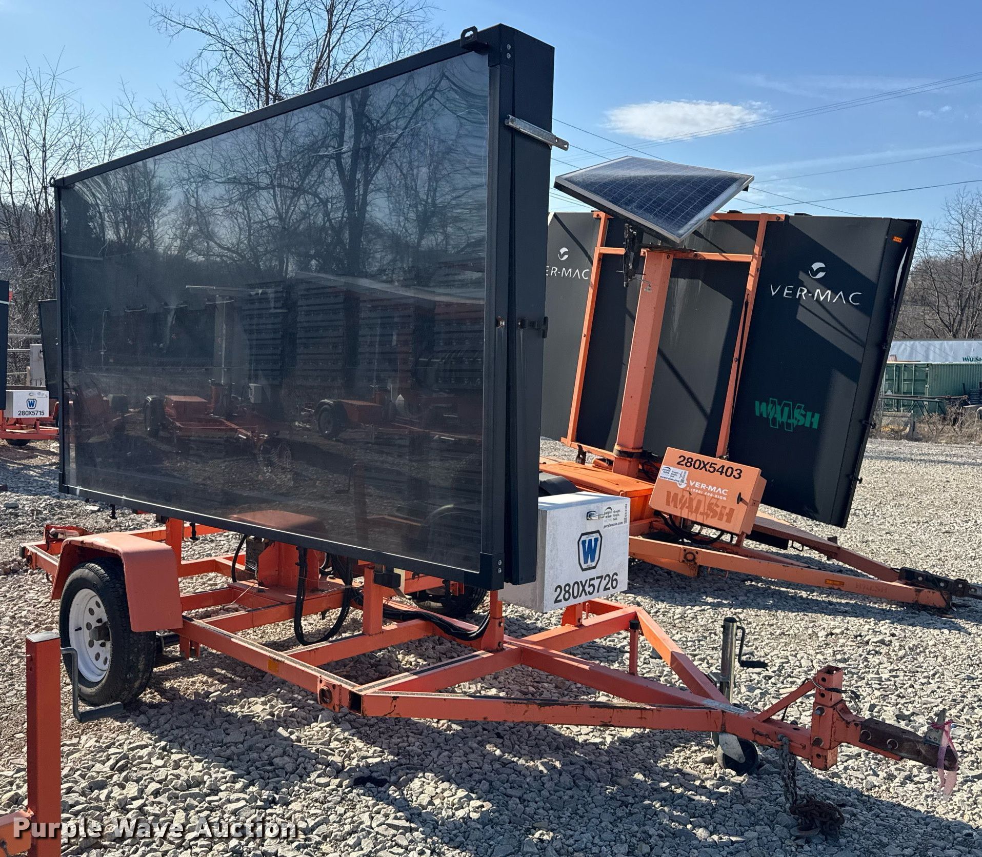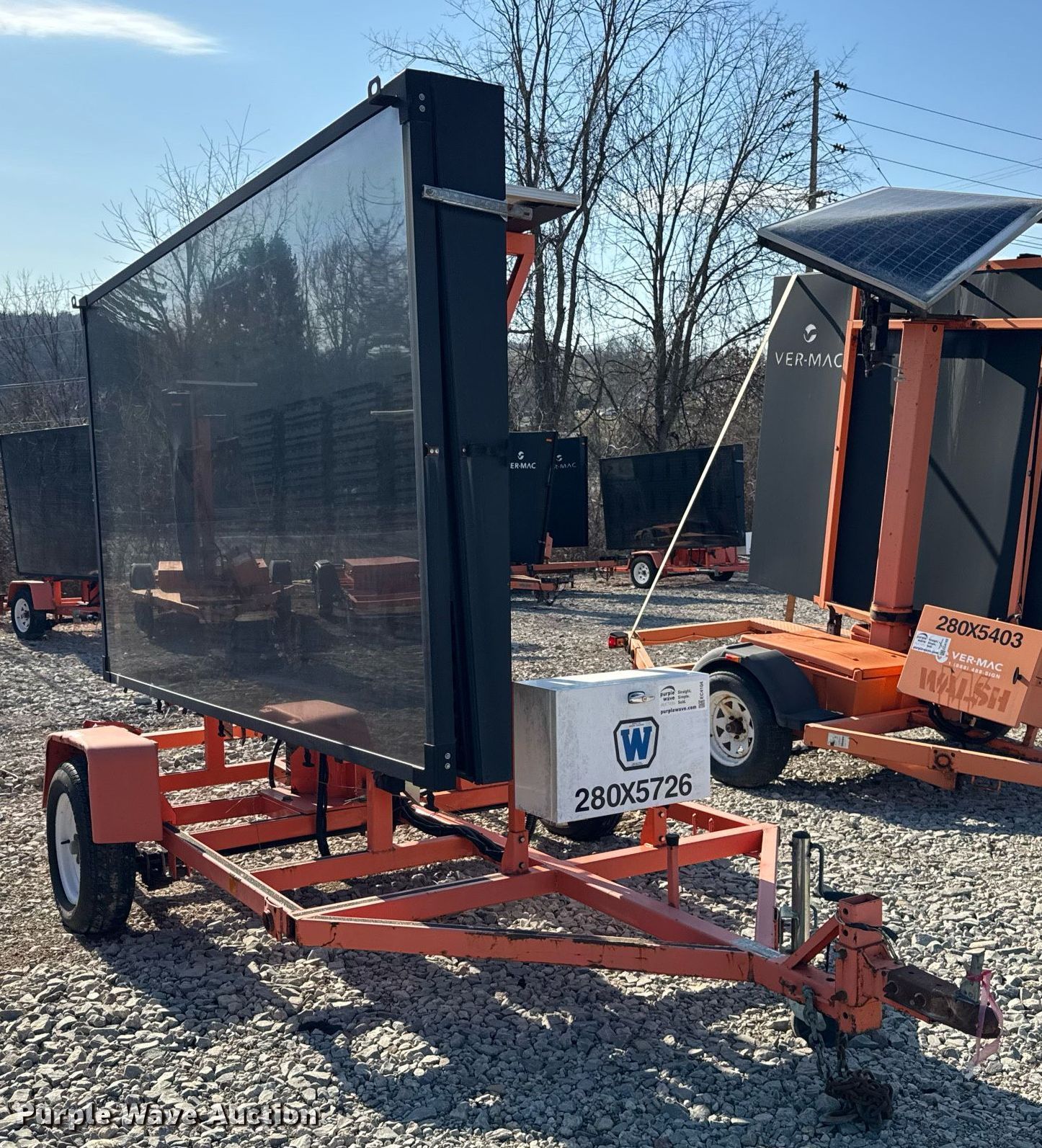 2014 Wanco WTLMB message board trailer. VIN: 5F12S1613E1002706. Dimensions Overall: 15' 6" L x 95" W. Features Hydraulic lift, Solar panel. Chassis Ball hitch: 2", Landing gear: Single, Suspension: Spring, GVWR: 3,600 lbs, GAWR: 3,500 lbs. Tires Steel wheels, Size: 205/75R15. Notes Control screen missing, Unknown operating condition. This is worksite support equipment and will not come with a title. Transfer of ownership documentation will be a bill of sale. Mount Pleasant, PA 15666