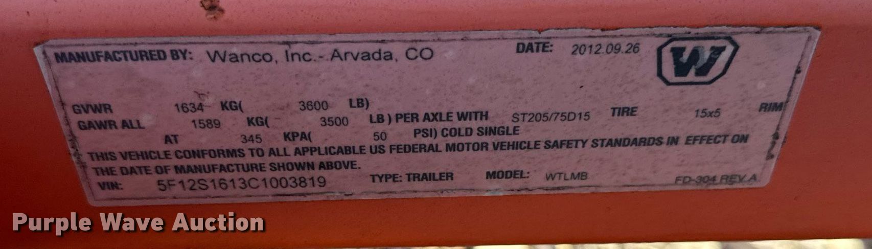 2012 Wanco WTLMB message board trailer. VIN: 5F12S1613C1003819, Unit #: 280x5717. Dimensions Overall: 15' 6" L x 95" W. Features Hydraulic lift, Solar panel. Chassis Ball hitch: 2", Landing gear: Single, Suspension: Spring, GVWR: 3,600 lbs, GAWR: 3,500 lbs. Tires Steel wheels, Size: 205/75D15. Notes Unknown operating condition. This is worksite support equipment and will not come with a title. Transfer of ownership documentation will be a bill of sale. Mount Pleasant, PA 15666