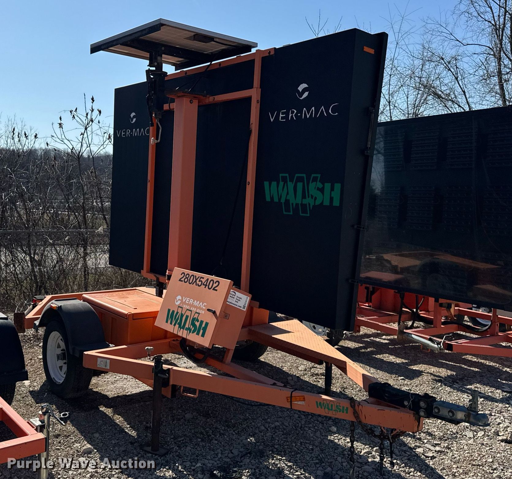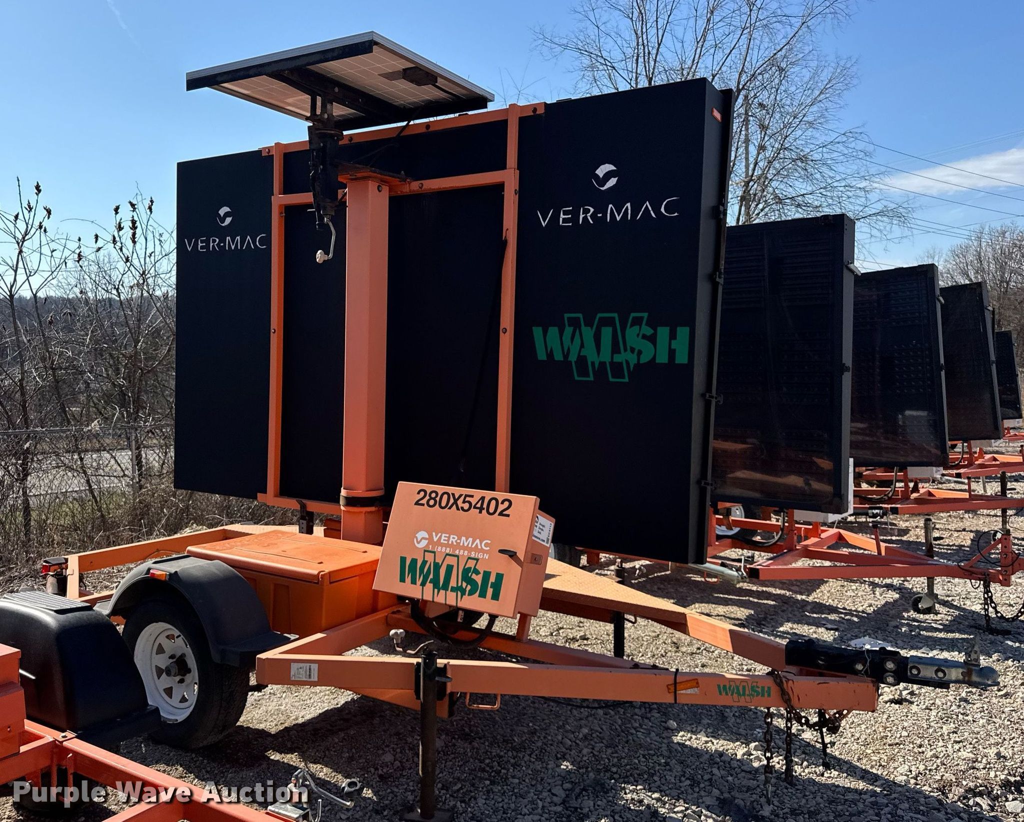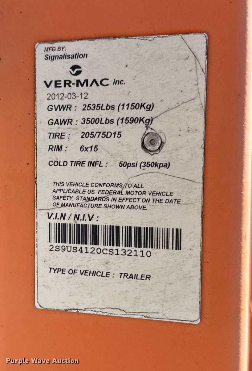 2012 Ver-Mac PCMS 1500 message board trailer. VIN: 2S9US4120CS132110, Unit #: 280x5402. Dimensions Overall: 14' 6" L x 85" W. Features Hydraulic lift, Solar panel. Chassis Ball hitch: 2", Landing gear: Dual, Suspension: Spring, GVWR: 2,535 lbs, GAWR: 3,500 lbs. Tires Steel wheels, Size: 205/75D15. This is worksite support equipment and will not come with a title. Transfer of ownership documentation will be a bill of sale. Mount Pleasant, PA 15666