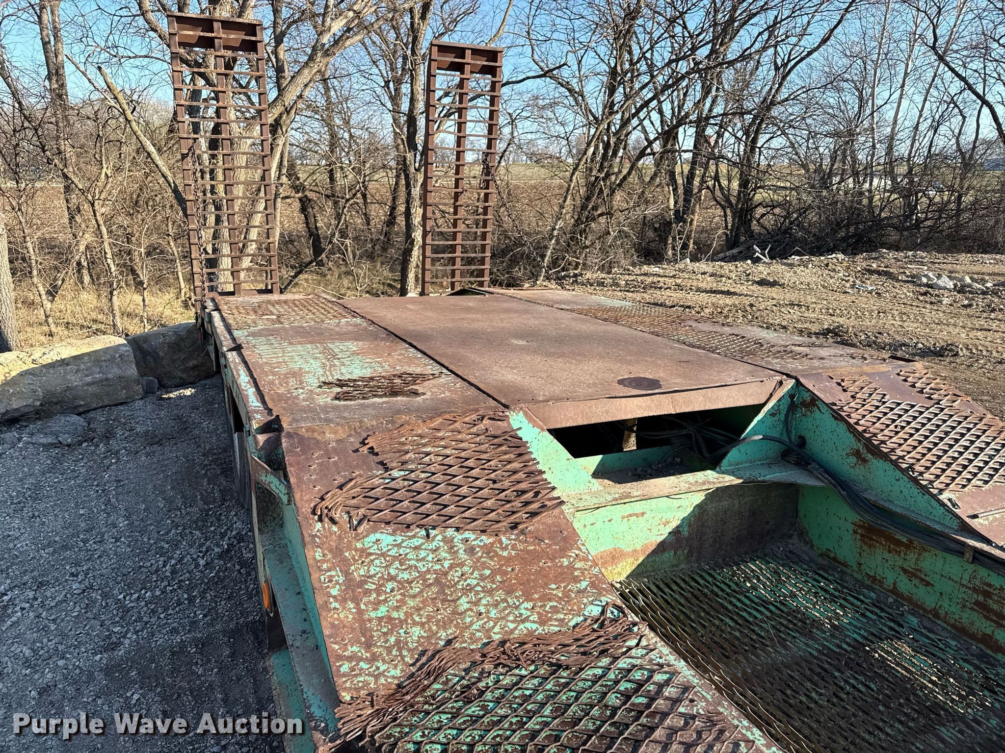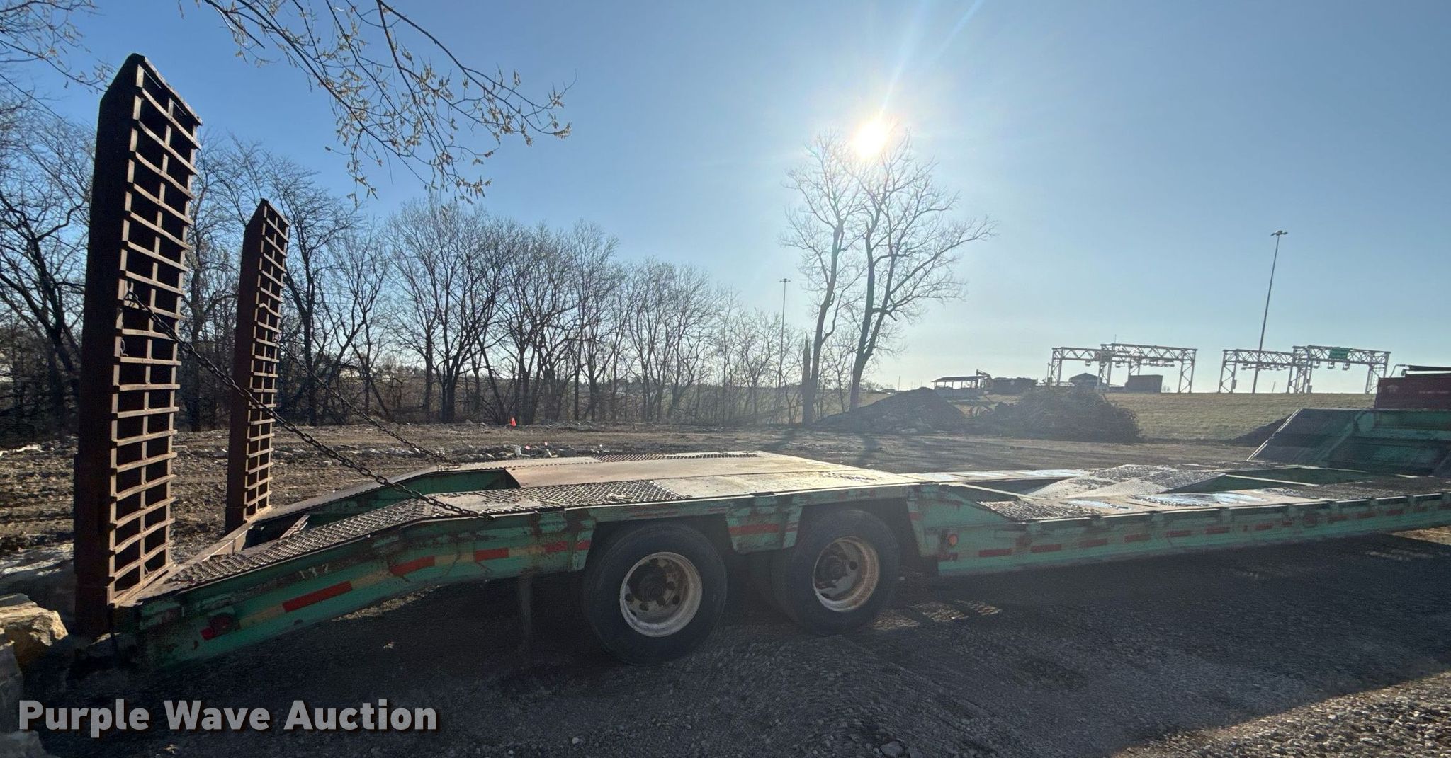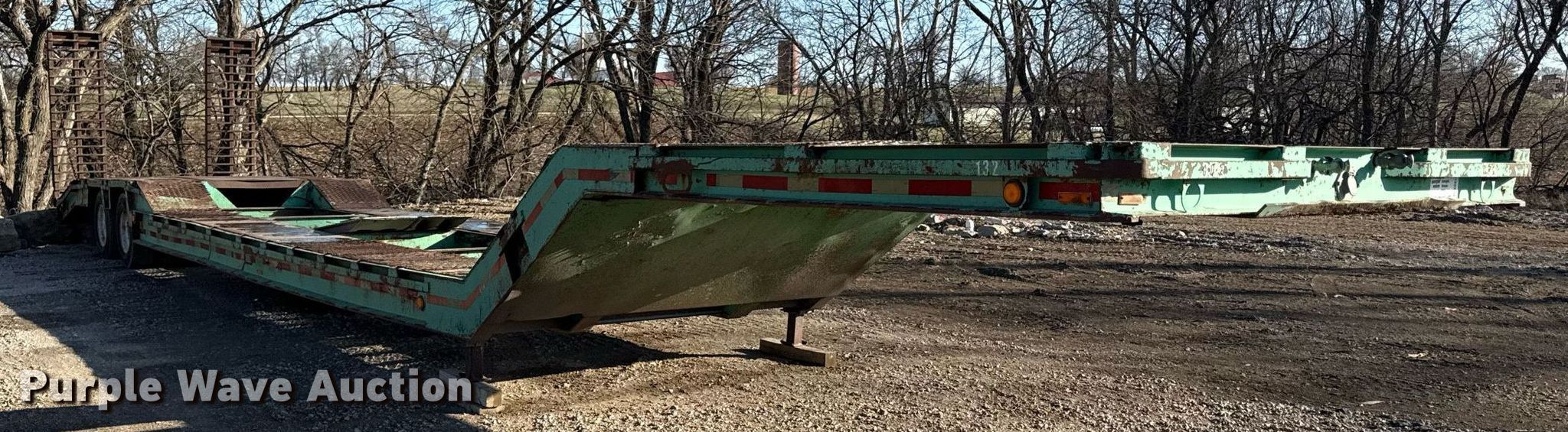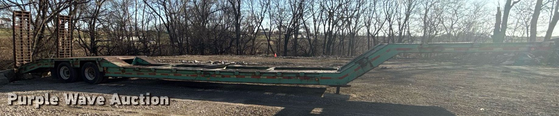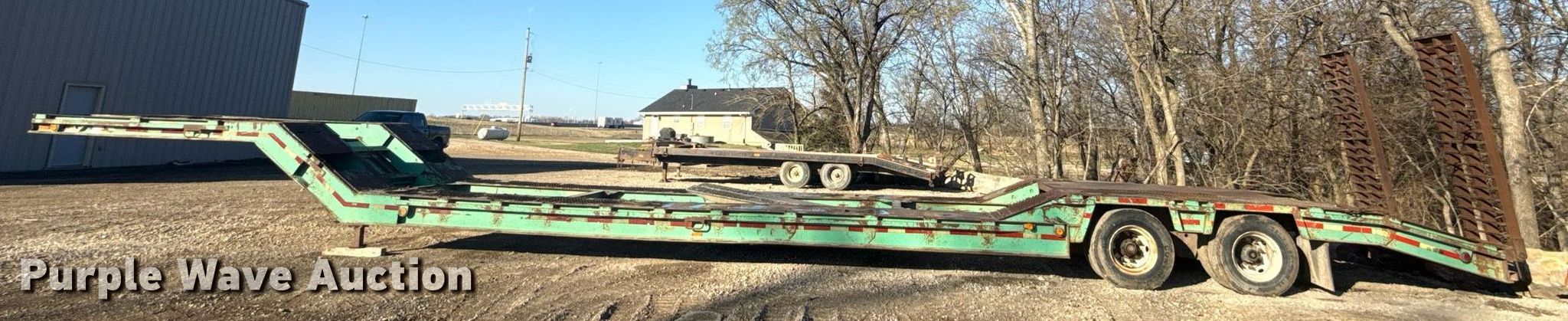 1987 Shop built drop deck equipment trailer. VIN: T064830. Dimensions Overall: 52' 8" L x 102" W, Deck: 23' L x 102" W, Top deck length: 10' 2", Rear deck length: 13' 5", Deck height: 23", Ramps: Manual Length: 82". Features Deck type: Steel. Chassis Landing gear: Dual, Suspension: Air, Brakes: Air, Axles: Tandem, GVWR: 50,000 lbs, GAWR: 25,000 lbs. Tires Steel wheels, Size: 235/75R17.5. Kansas title. Title distribution may be delayed up to 14 days from verification of funds. Ryan Theno Farms. Tonganoxie, KS 66086