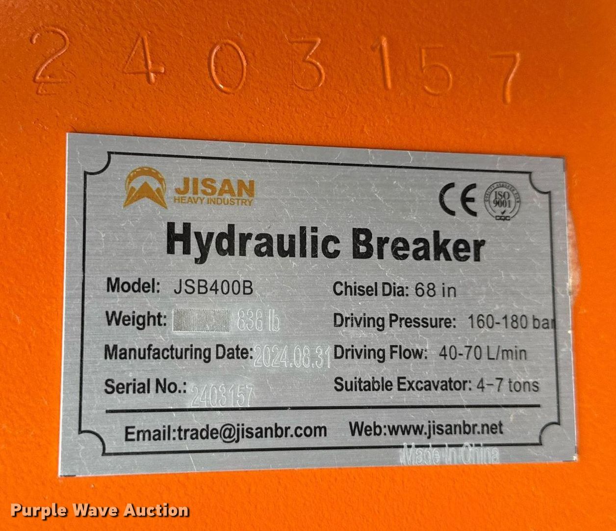 Purple Wave is selling a used Breaker or Hammer in Kansas. This item is a Jisan JSB400B breaker with the following: Serial: 2403157, Unused