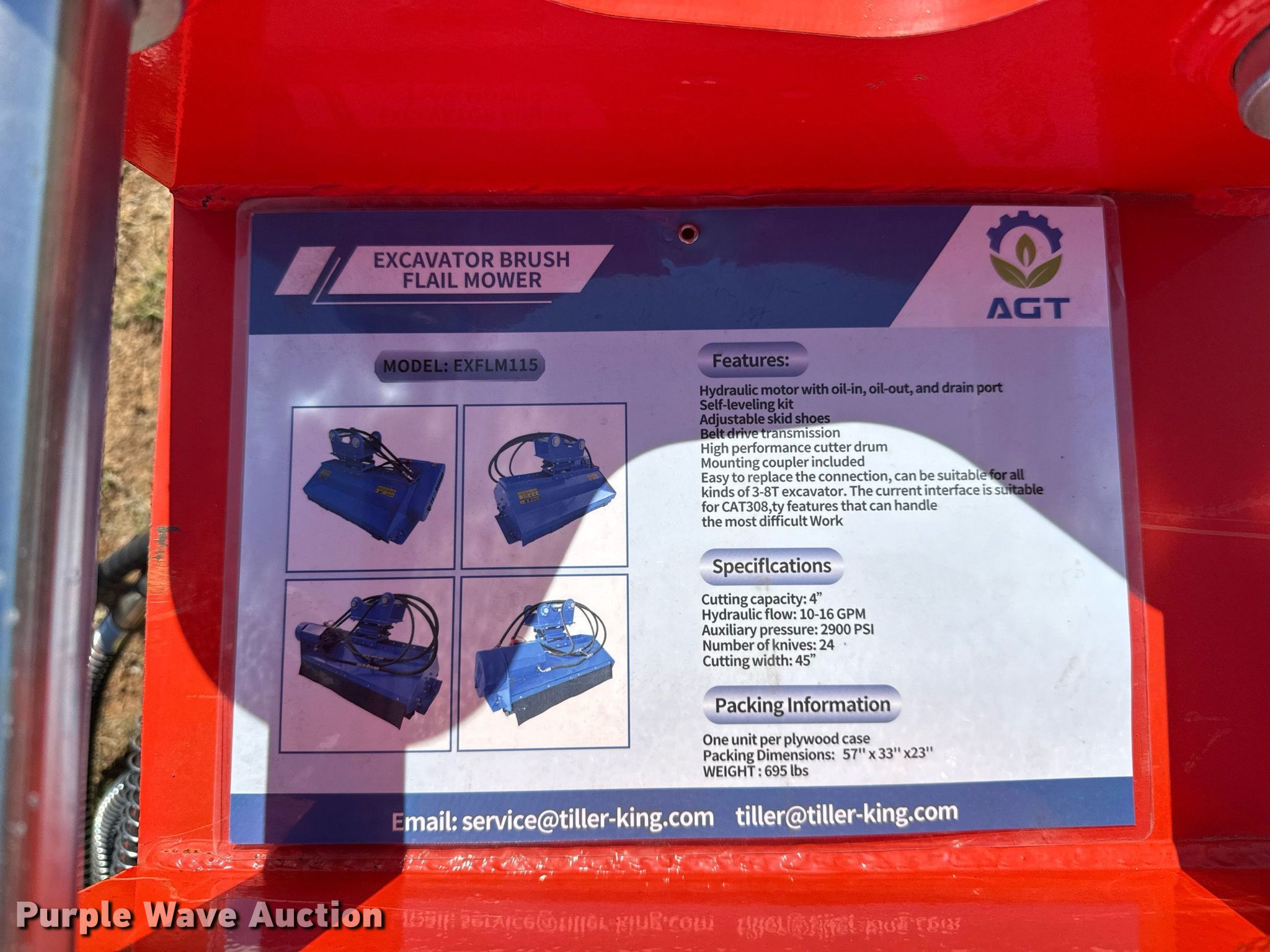 2023 Agrotk EXFLM115 excavator flail mower. Serial: EXFLM11523091701A. Features Cutting width: 45", Adapter plate. Notes Fits a Caterpillar 308. Mike Carpenter. Lampasas, TX 76550