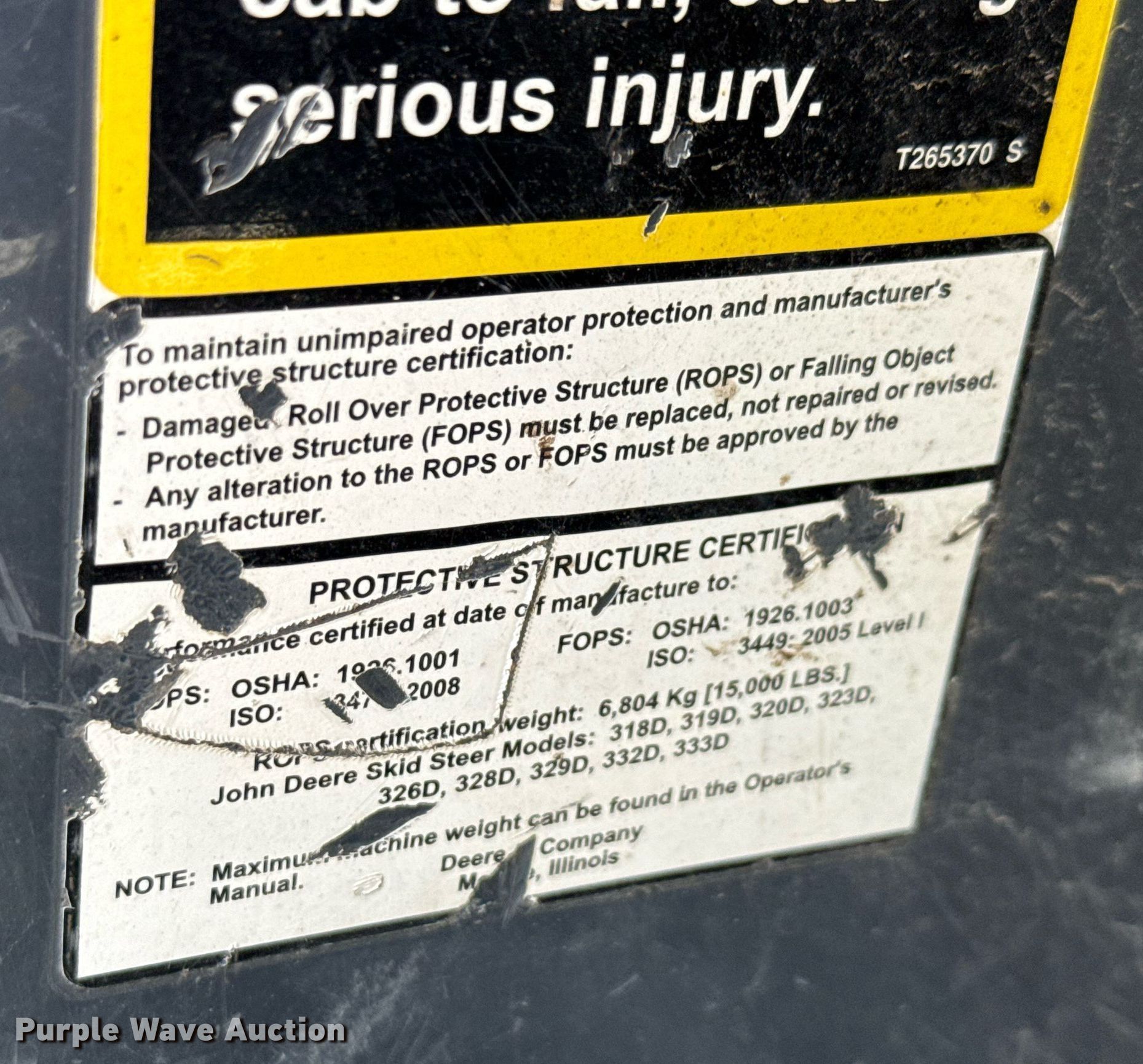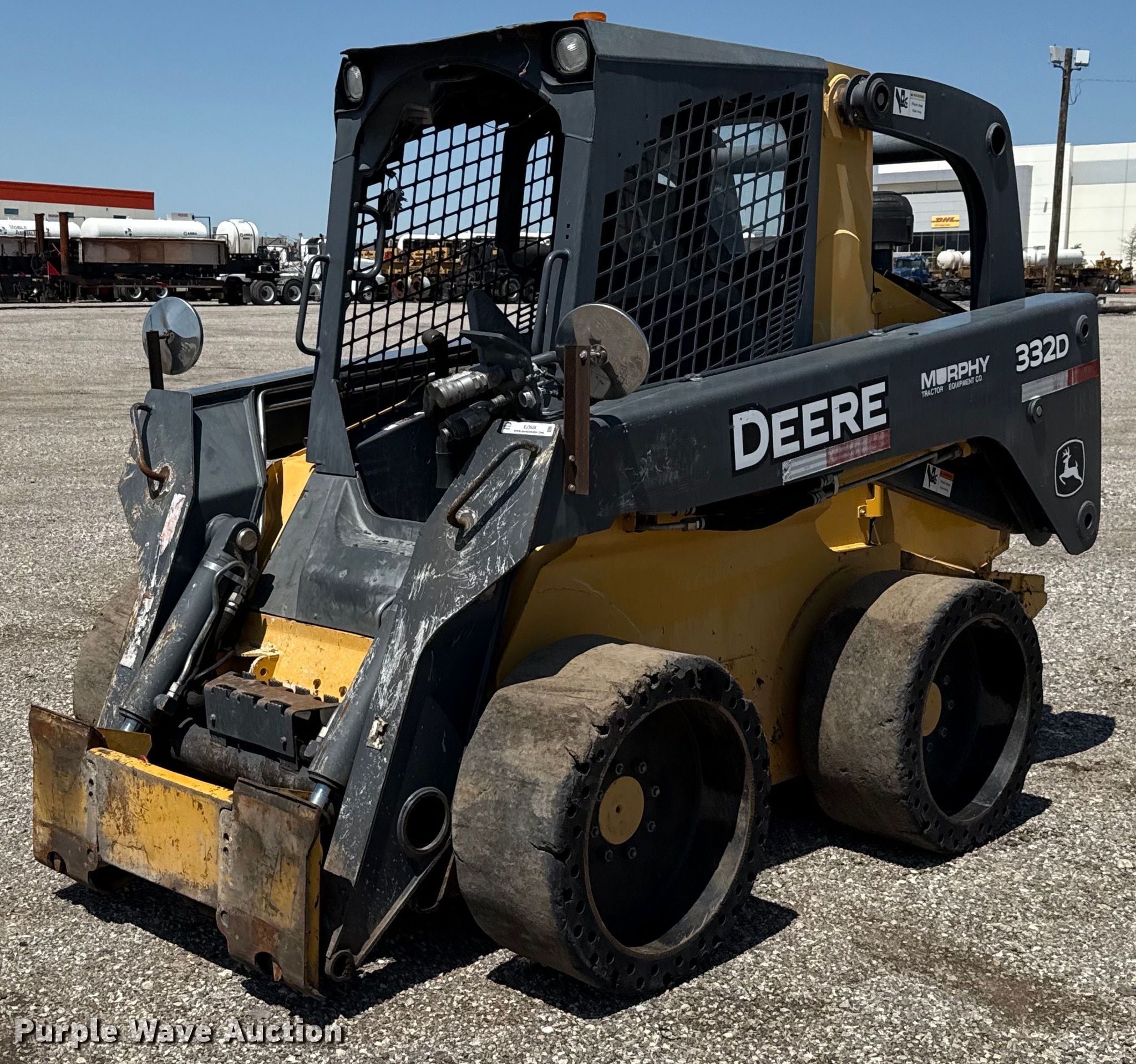 2013 John Deere 332D skid steer loader. Hours: 3,552 on meter, Serial: 1T0332DFJCD236417, Unit #: LR51. Engine John Deere 5030, Serial: PE5030L 111255, Cylinders: 4, Fuel type: Diesel. Transmission Hydrostatic, Two speed travel. Operators station OROPS, Bucket control: Foot. Features Auxiliary hydraulics, Auxiliary electrical outlet, Quick coupler: Hydraulic, Counter weights. Tires Size: 28x12, Solid. Notes Key missing, Quick coupler missing. Dustrol Inc.. Fort Worth, TX 76177