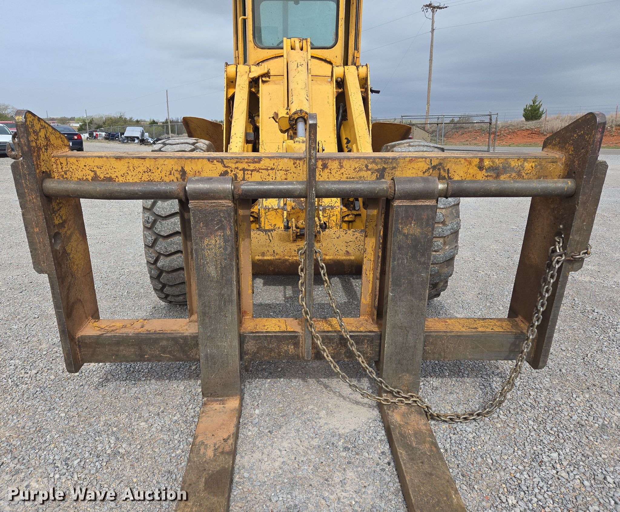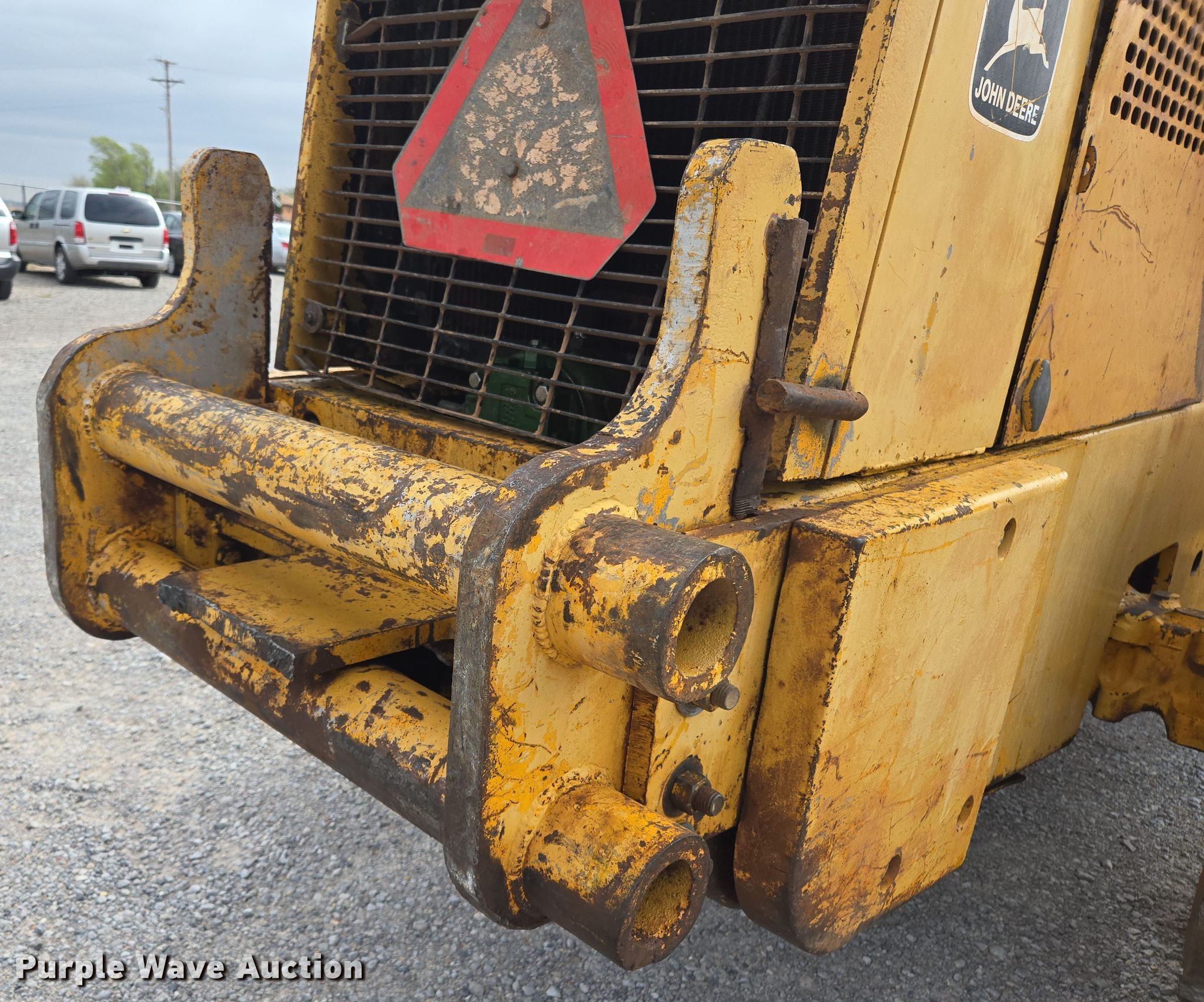 1974 John Deere 544B wheel loader. Hours: 5,459 on meter, Serial: 213788T. Engine John Deere, Cylinders: 6, Fuel type: Diesel. Transmission Powershift, 4F - 2R, Differential lock. Operators station Enclosed cab, Bucket controls: Joystick. Features Quick coupler: Manual, Bucket Width: 98", Cutting edge: Bolt-on, Forks Length: 110". Tires Size: 17.5-25. Notes Left fork extension issues, broken, Left side door issues, Lower door missing, Dead battery. D&D Used Cars. Clinton, OK 73601