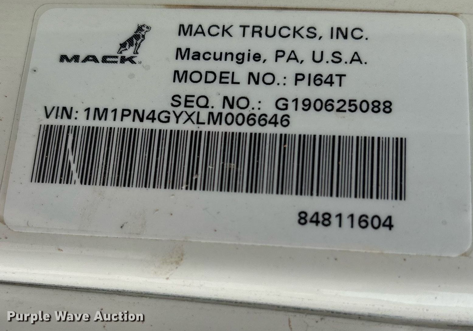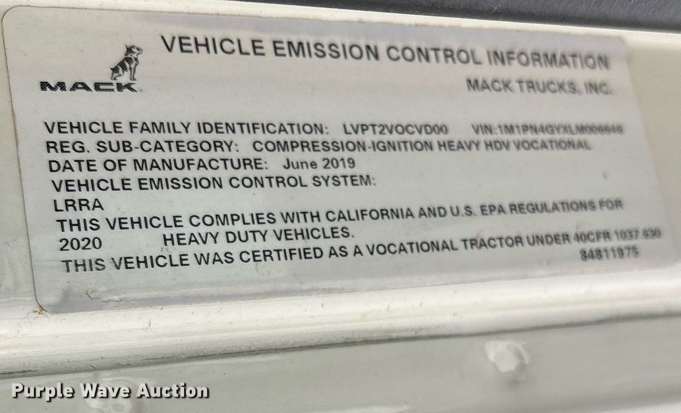 Purple Wave is selling a used Construction Dump Truck in Missouri. This item is a 2020 Mack Pinnacle dump truck with the following: Miles: 44,184 on odometer, VIN: 1M1PN4GYXLM006646