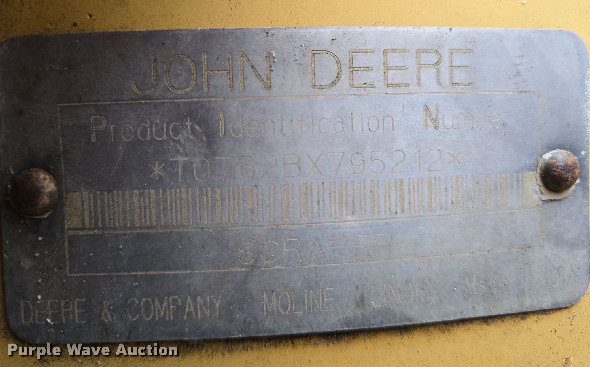 Purple Wave is selling a used Elevating Scraper in Kansas. This item is a 1994 John Deere 762B elevating scraper with the following: Hours: 10,965 on meter, Serial: T0762BX795212