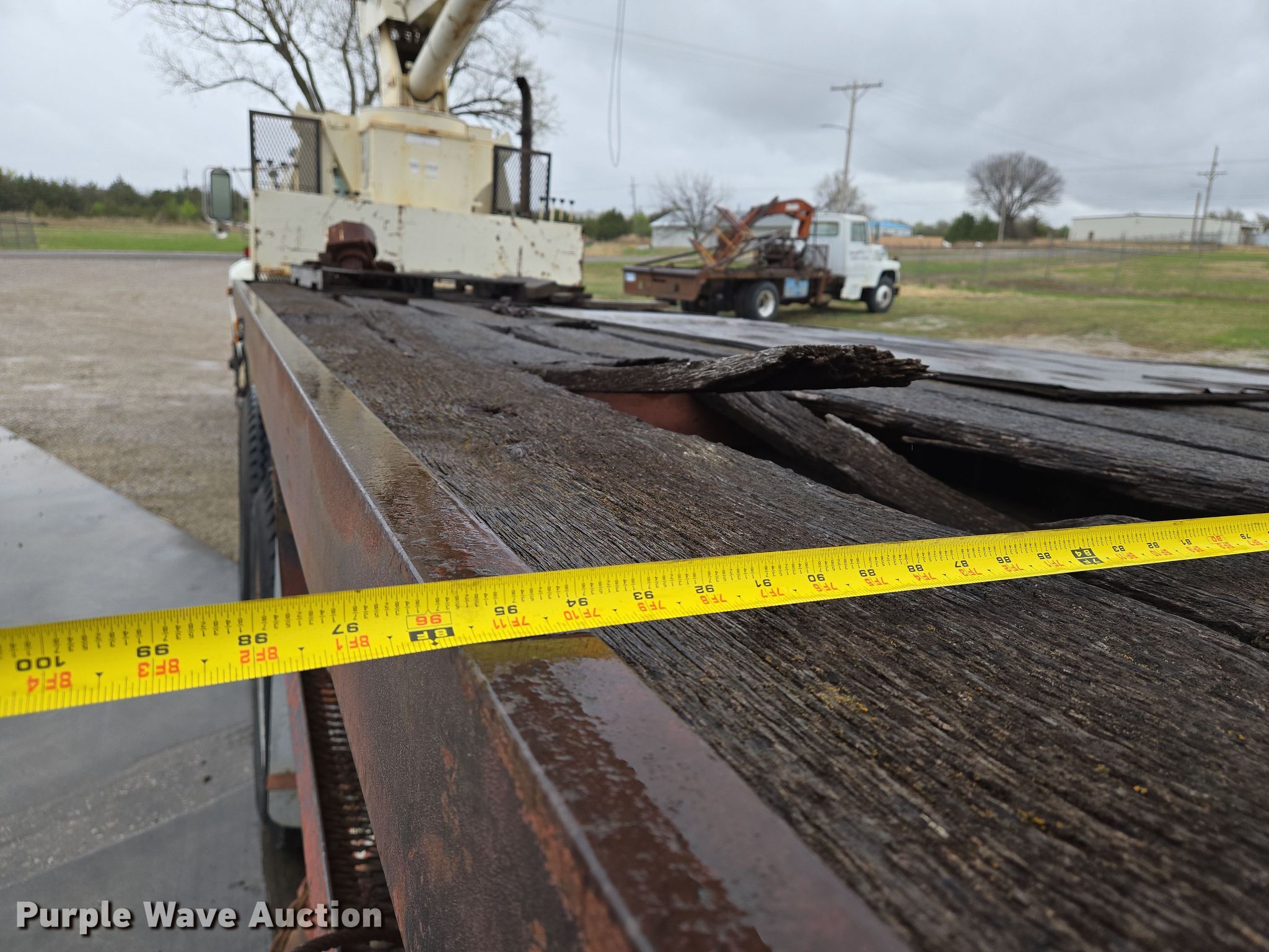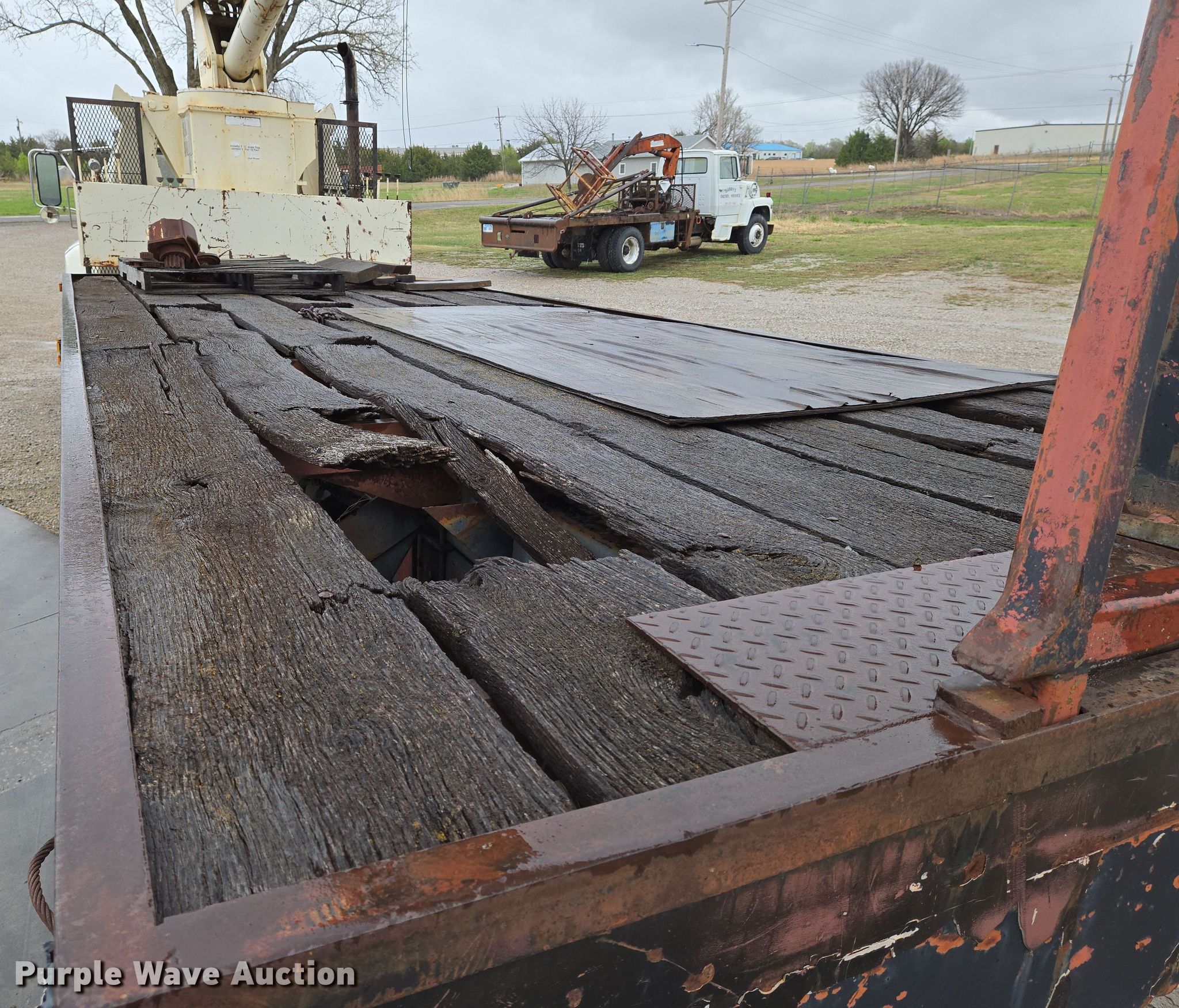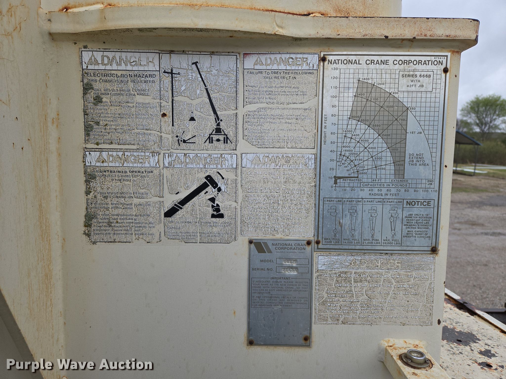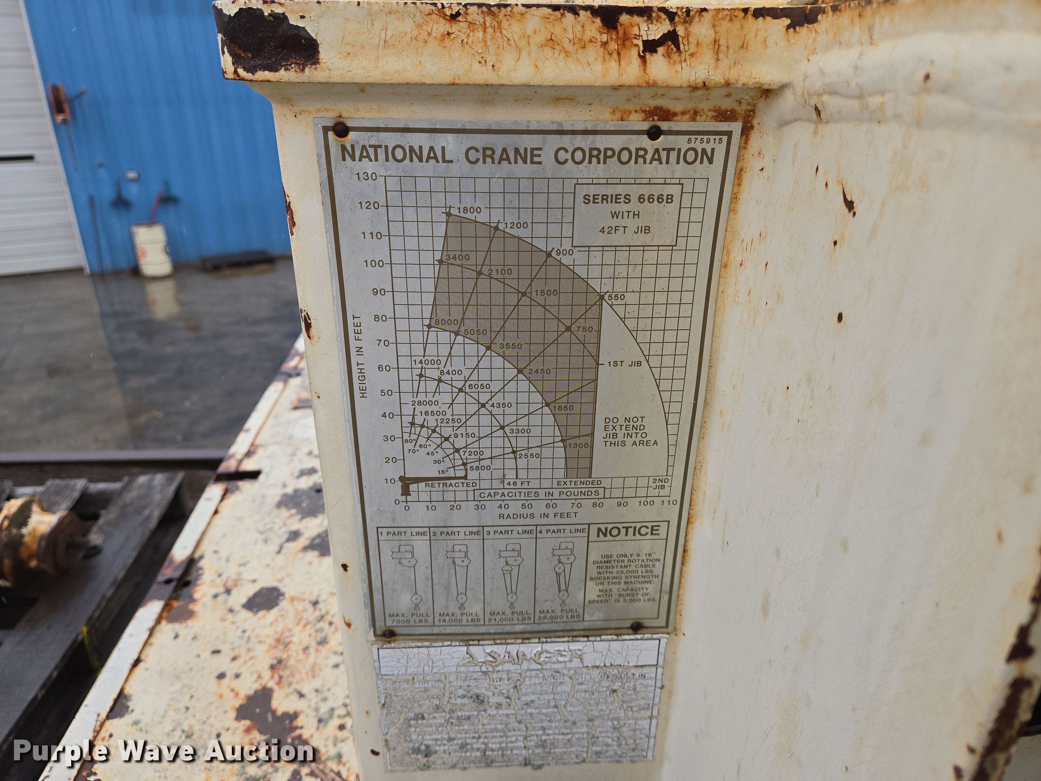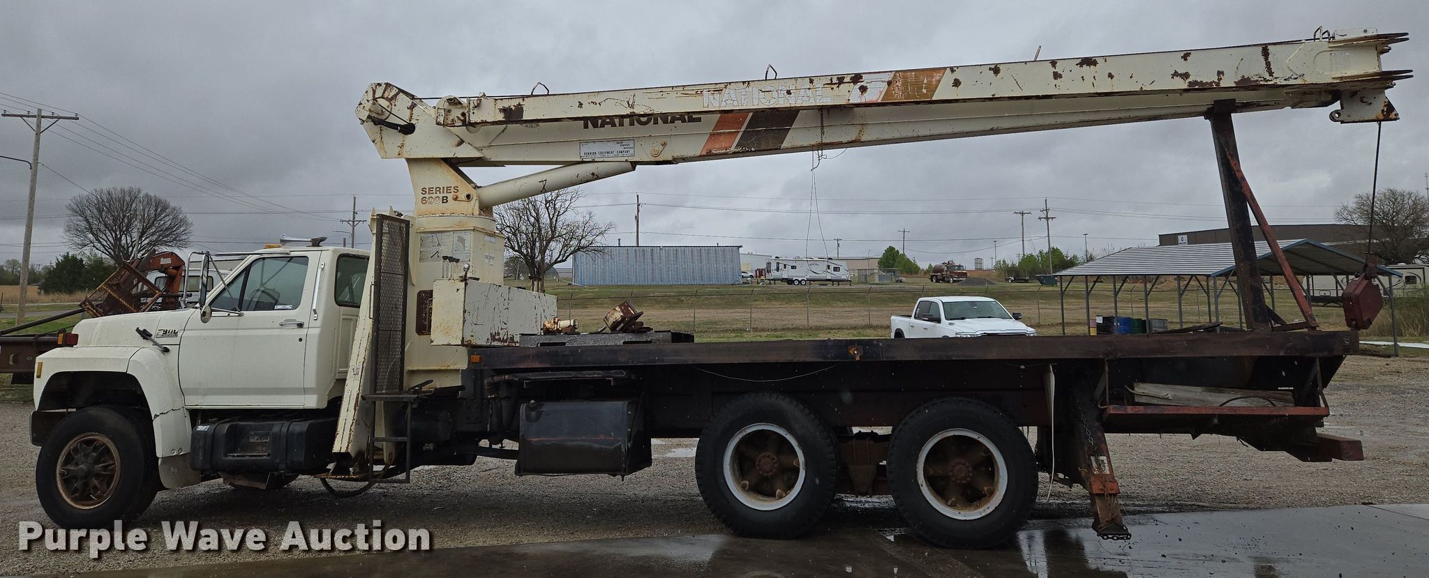 1990 Ford F900 crane truck. Miles: 24,623 on odometer, Hours: 5,581 on meter, VIN: KS115682. Engine Ford, Cylinders: 6, Fuel type: Diesel. Transmission Manual, Speed: 6. Chassis Axles: Tandem, Suspension: Spring over walking beam, Brakes: Air. Interior Heat. Features Flatbed 20' L x 96" W, Crane National 666B, Serial: 21434, Boom Telescopic, Maximum boom length: 66' Sections: 3, Maximum lift capacity: 28,000 lbs, Jib: 42', Boom controls Ground, Crane block. Tires Size: 10.00-20. Notes Flatbed boards damaged, Ignition issues, does not shut off Requires clutch to stop engine, Crane issues, gearbox needs rebuilt. Kansas title. Title distribution may be delayed up to 14 days from verification of funds. Winfield, KS 67156