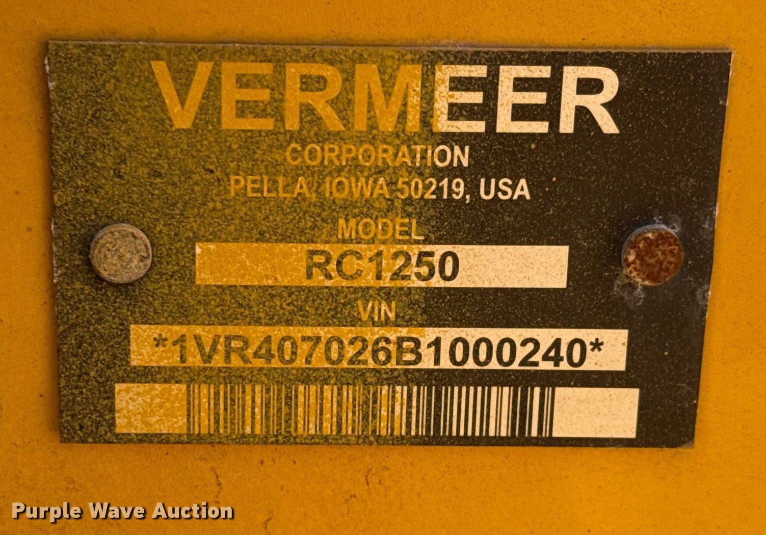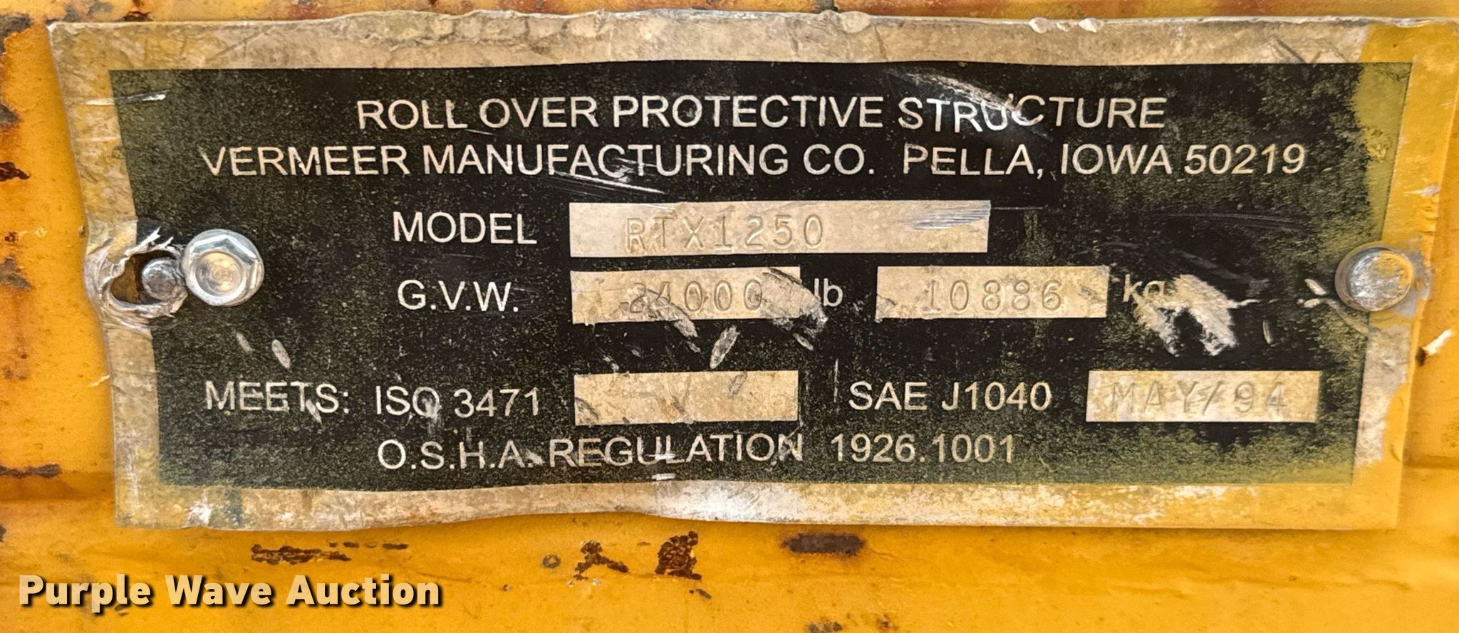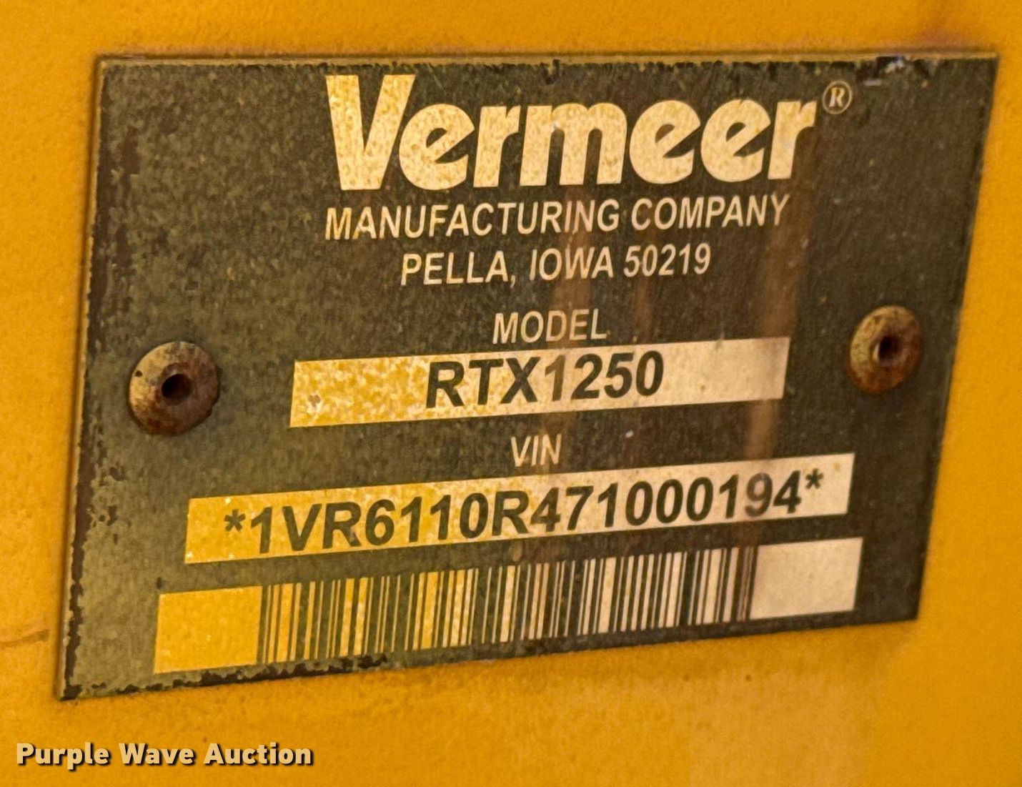 2007 Vermeer RTX1250 cable plow. Hours: 2,535 on meter, Serial: 1VR6110R471000194. Engine Cummins QSB4.5, Serial: 46785458, Displacement: 4.5L, Cylinders: 4, Fuel type: Diesel, HP: 130. Transmission Hydrostatic, Two speed travel, Four wheel drive, Differential lock, Four wheel steer. Operators station OROPS. Features Vibratory plow Model: VPX1250, Serial: 1VR6110Y3B1000221, Depth: 40", Reel carrier Model: RC1250, Serial: 1VR407026B1000240, Maximum reel width: 58", Maximum reel diameter: 100", Backfill blade Width: 80". Tracks Width: 17.5", Rubber. Notes Dead battery, Unknown operating condition of reel carrier, cable plow swivel cylinder. United Underground LLC. Jay, OK 74346