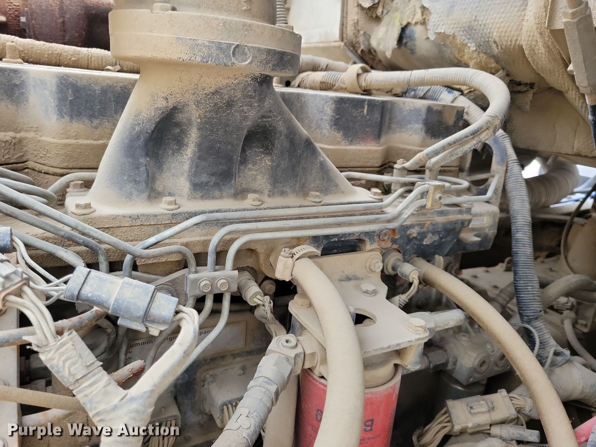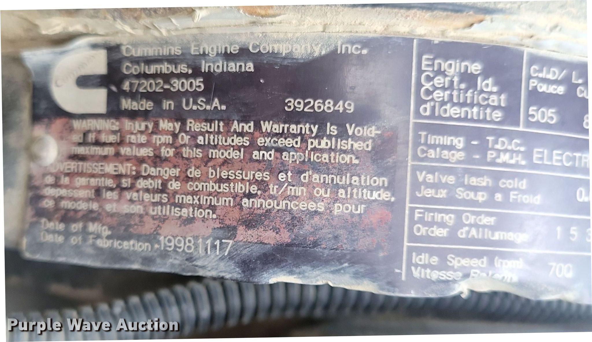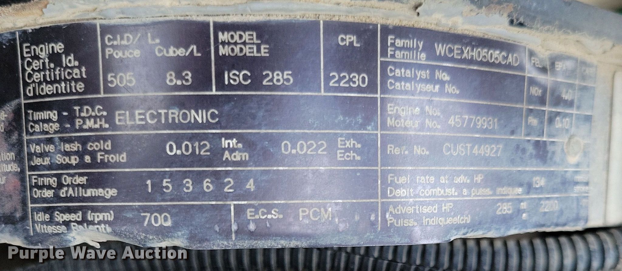 1999 Sterling LT8513 ready mix truck. Miles: 219,974 on odometer, Hours: 20,278 on meter, VIN: 2FZXMLCB5XAB08040. Engine Cummins ISC, Serial: 45779931, Displacement: 8.3L, Cylinders: 6, Fuel type: Diesel, HP: 285. Transmission Eaton Fuller RTO-9MLL, Manual, Speed: 11. Chassis Axles: Tandem, Suspension: Spring over walking beam, Brakes: Air, Front mount PTO, GVWR: 60,000 lbs FAWR: 20,000 lbs, IAWR: 20,000 lbs, RAWR: 20,000 lbs. Interior Heat, Heated mirrors, Cruise control. Features Mixer McNeilus, Capacity: 9 cu.yd., Discharge: Rear, In-cab controls, Rear drum controls, Chute Extensions: 3, Chute type: Steel.. Tires Front: 425/65R22.5, Rear: 11R22.5. South Dakota title. Buffalo Ridge Concrete. Madison, SD 57042
