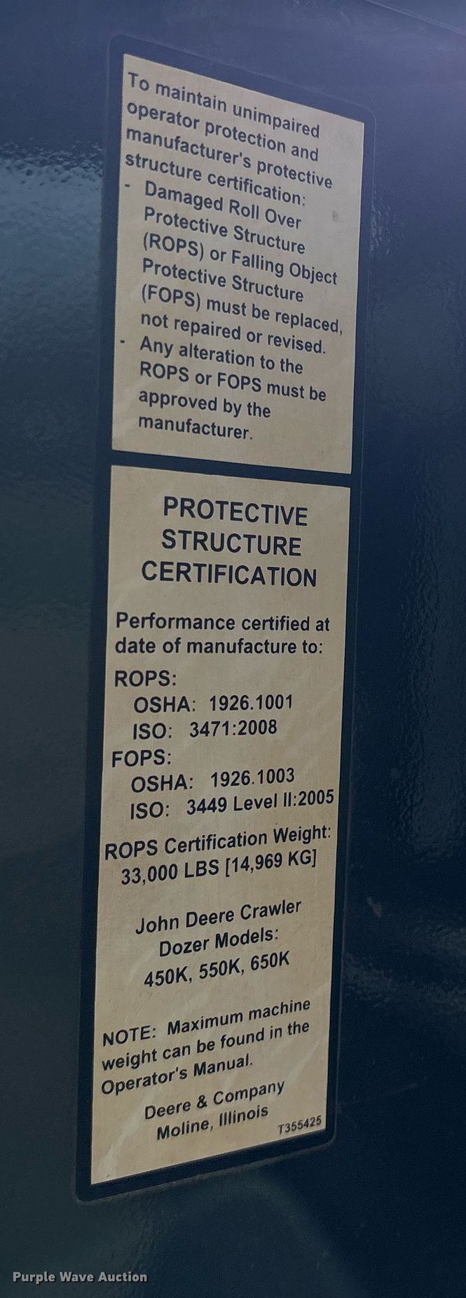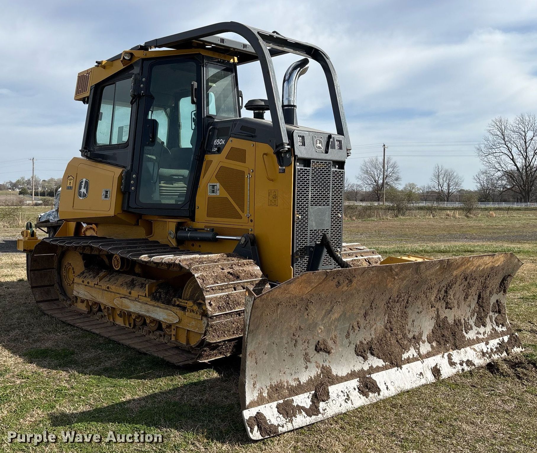 2019 John Deere 650K LGP dozer. Hours: 1,953 on meter, Miles or hours may vary, unit still in use, Serial: 1T0650KKEKF361344. Engine John Deere, Serial: PE4045U198156, Cylinders: 4, Fuel type: Diesel, Engine replaced at 1,940 hours on meter. Transmission Hydrostatic. Operators station Enclosed cab, AC, Heat, Steering: Joystick. Features Auxiliary hydraulics, Sweeps, Dozer blade Blade type: 6-way, Blade shape: Straight, Width: 11', Attachments Ripper Vail, Shanks: 3.. Tracks Width: 27.5", Grouser pads: Single, Bottom rollers: 7, Track guards. Notes John Deere remanufactured engine warranty valid until November 2026 or 3,940 hours, Repair documentation accessible at below repairs link. View repairs. Park Hill, OK 74451