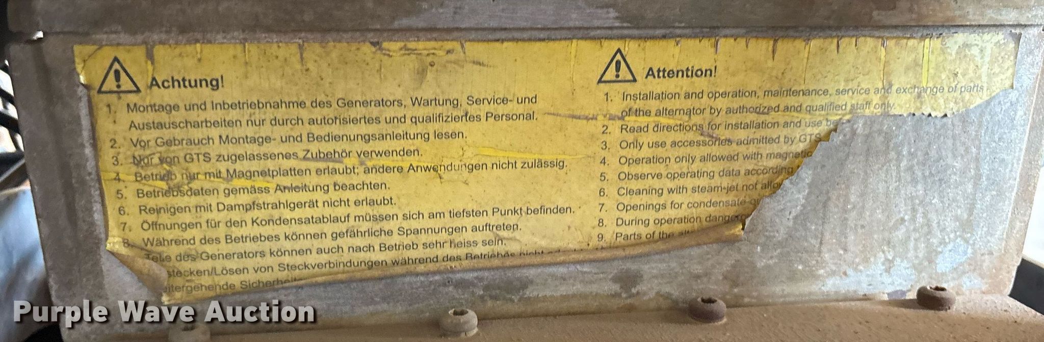 MagGen 13KW generator. Hours: 3,800 on meter, Miles or hours may vary, unit still in use. Engine Cylinders: 4, Fuel type: Diesel. Features Generator MagGen, kW: 13, Phase: Single, Electric start, Fuel tank. Magnet Diameter: 42". CSI Recycling. Checotah, OK 74426