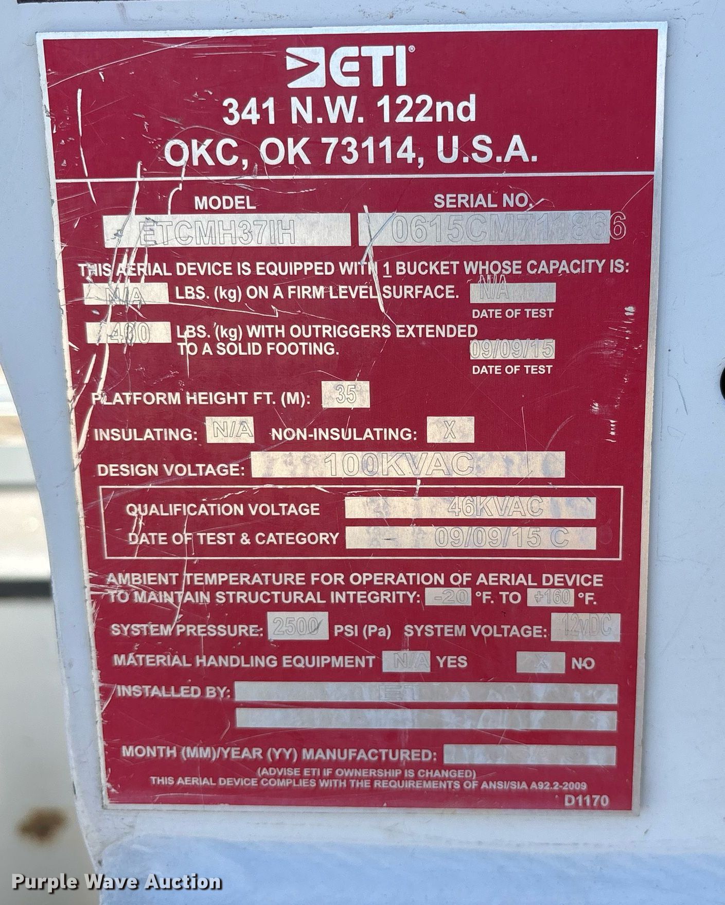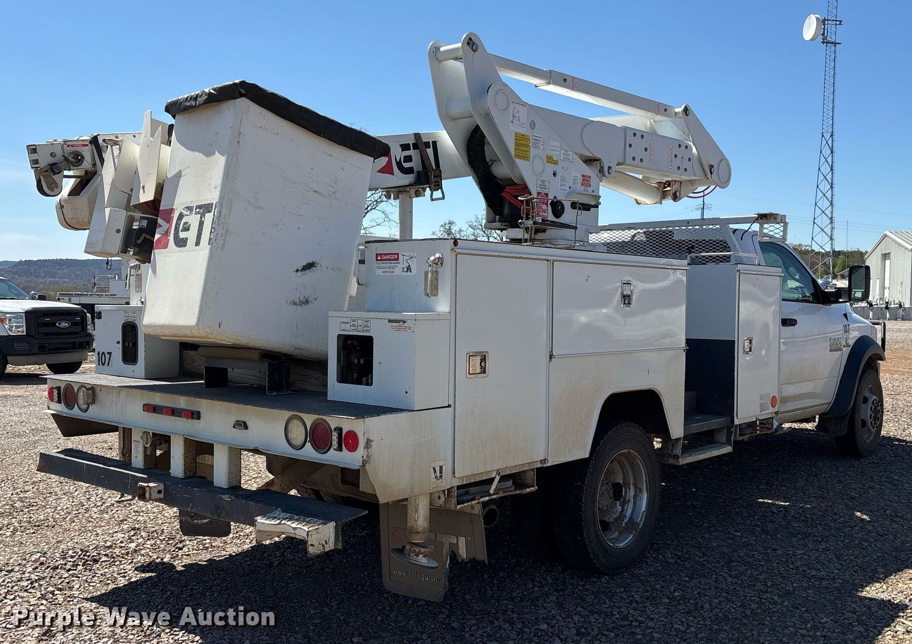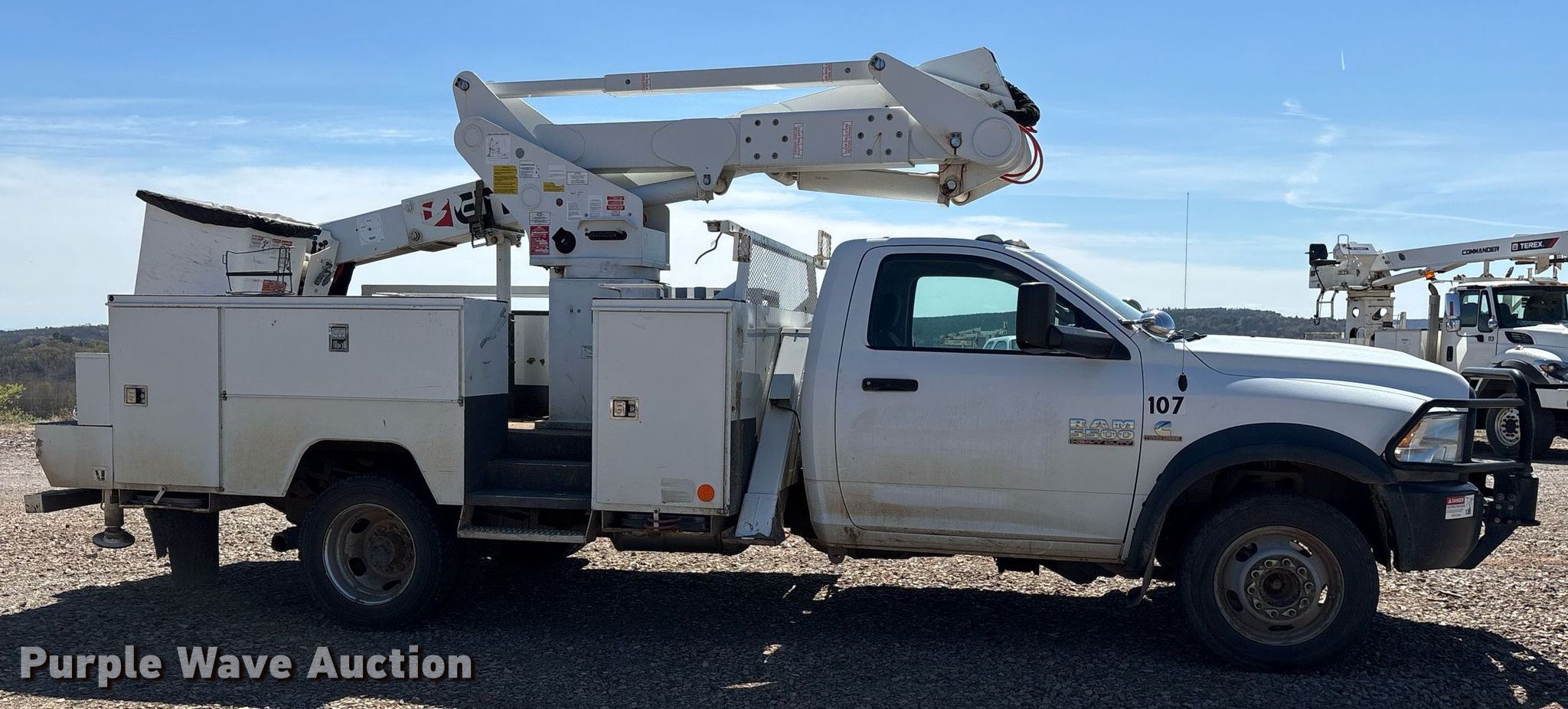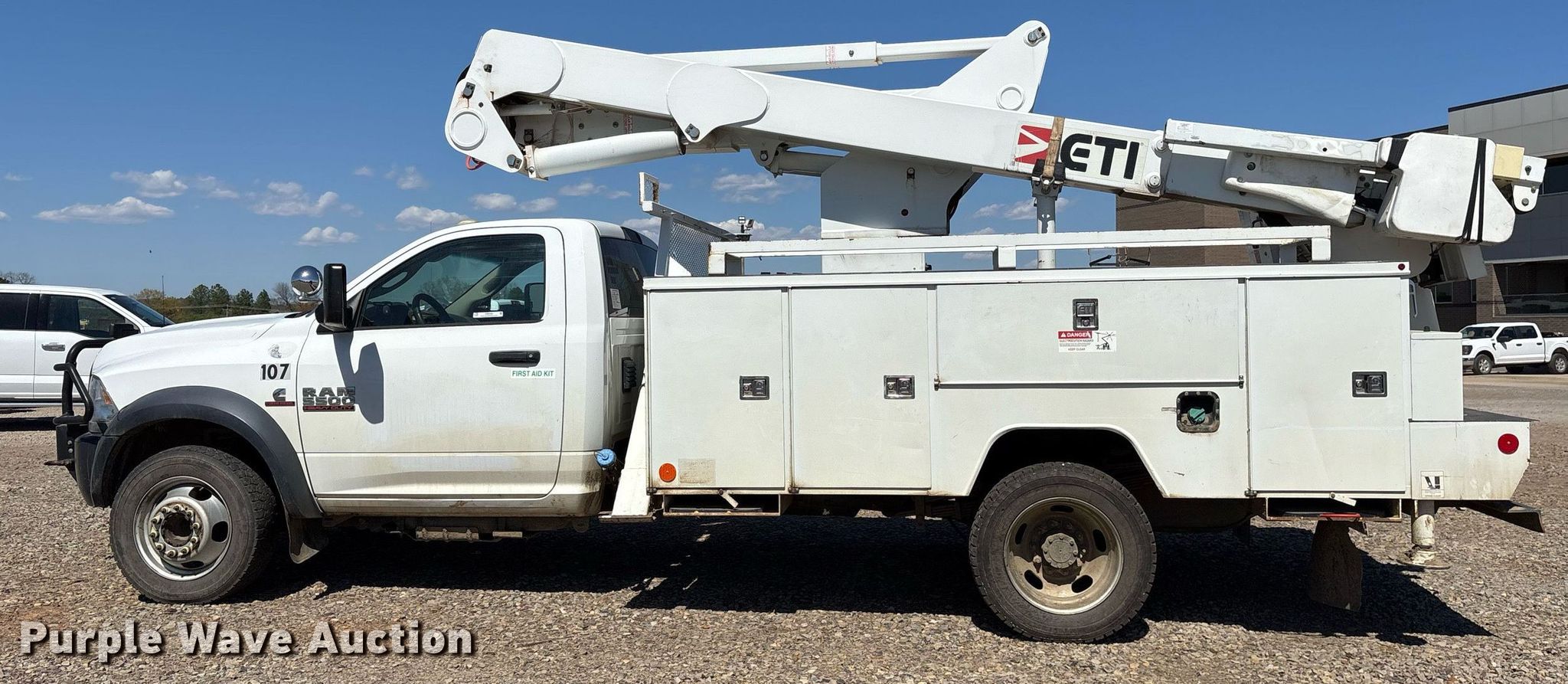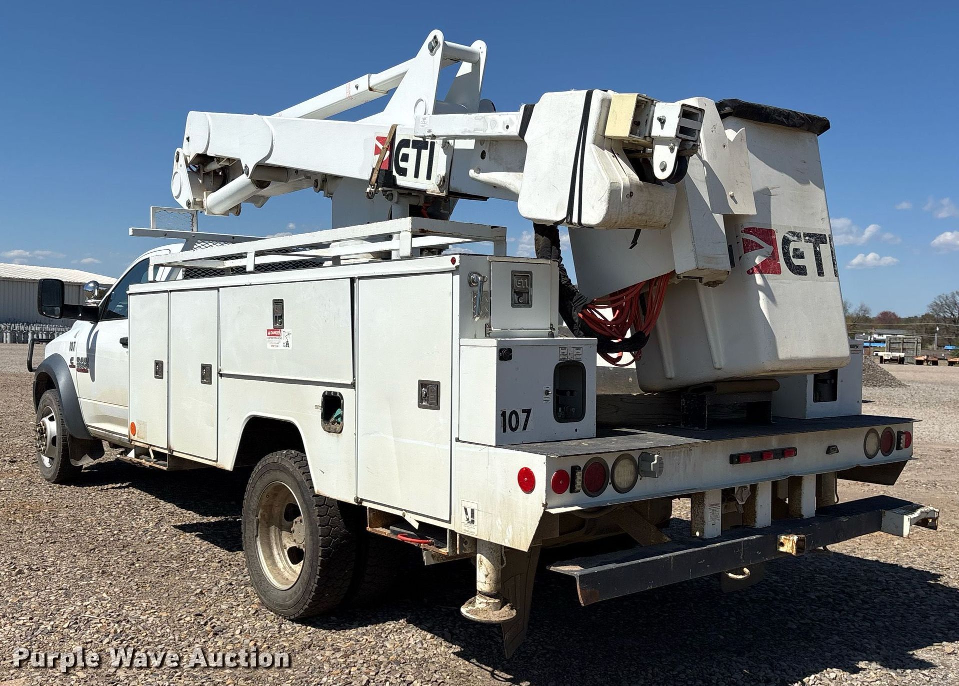 2015 Dodge Ram 5500 bucket truck. Miles: 153,828 on odometer, VIN: 3C7WRNBL5FG594760, Unit #: 107. Engine Cummins, Displacement: 6.7L, Cylinders: 6, Fuel type: Diesel. Transmission Automatic. Chassis Four wheel drive, Axles: Single, Suspension: Spring, Brakes: Hydraulic, PTO, GVWR: 19,500 lbs. Interior AC, Heat, Cruise control, Auxiliary controls. Features Bed ETI SB132DD96B20Q, Serial: 18073, 13' L x 8' W, Boom 2015 ETI ETCMH37IH, Serial: 0615CM71186, Boom length: 37', Mast height: 42', Maximum lift capacity: 400 lbs, Boom type: Articulating, Insulated, Telescopic, Man basket, Boom controls Ground, Platform/ basket, Material handler. Tires Size: 225/70R19.5. Notes Dash warning indicator: Check engine, Brake, Dash warning indicator: DEF. Arkansas title. Title distribution may be delayed up to 14 days from verification of funds. Arkansas Valley Electric Cooperative Corp.. Ozark, AR 72949