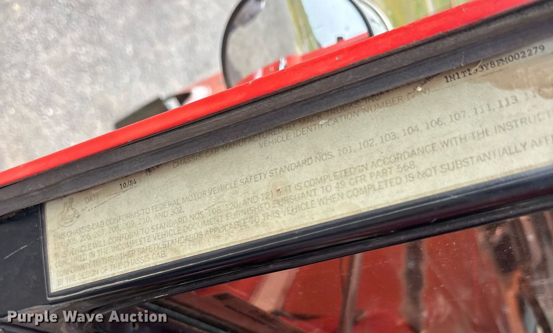 1985 Mack RS686LST dump truck. Miles: 307,933 on odometer, Engine hours: 2,848 on meter, Miles or hours may vary, unit still in use, VIN: 1M1T153Y8FM002279. Engine Mack EM6300, Cylinders: 6, Fuel type: Diesel. Transmission Mack Maxitorque, Manual, Speed: 12. Chassis Axles: Triple, Pusher axle, Suspension: Camelback, Brakes: Air, PTO. Interior AC, Heat. Features Dump bed Davis HPT-12-14.6, 14' 6" L x 8' W, Side height: 42", Side board height: 12", Bed type: Steel, Roll tarp, Ram: Single, End gate: Air operated. Tires Size: 11R24.5, Lift axle: 275/70R22.5. Notes Unknown operating condition of AC. Cherokee Nation title. Title distribution may be delayed up to 14 days from verification of funds. Secratt Farms. Tahlequah, OK 74464