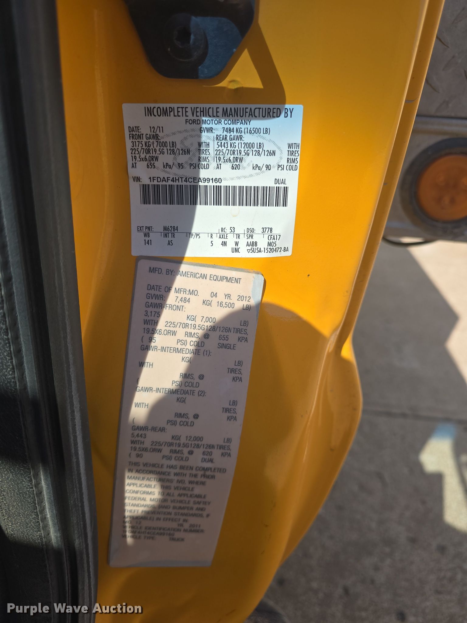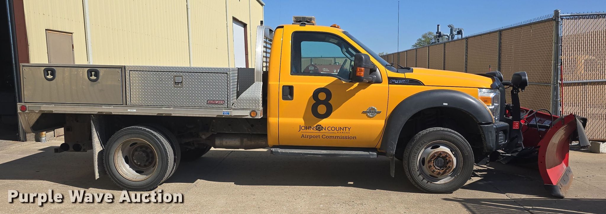 2012 Ford F450 Super Duty XL flatbed truck. Miles: 104,232 on odometer, VIN: 1FDAF4HT4CEA99160, Unit #: 1108. Engine Displacement: 6.7L, Cylinders: 8, Fuel type: Diesel. Transmission Automatic. Chassis Four wheel drive, Axles: Single, Suspension: Spring. Interior AC, Heat, Heated mirrors, Power windows, Power locks, Cruise control. Features Flatbed Hillsboro, 9' 6" L x 8' W, Boss snow plow Width: 9' 2". Tires Size: 225/70R19.5. Notes Decals will be removed prior to auction. Kansas title. Title distribution may be delayed up to 14 days from verification of funds. New Century Airport. Gardner, KS 66030