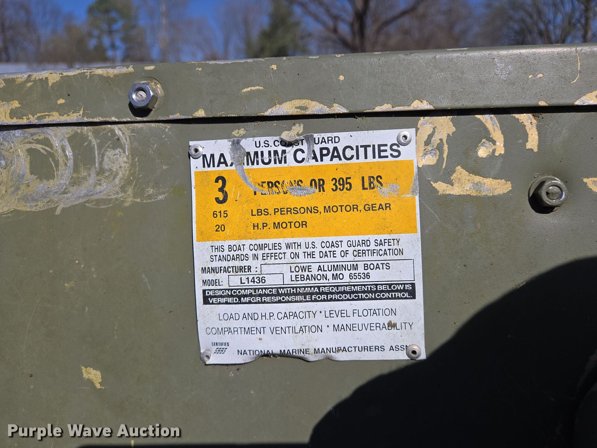2000 Lowe L1436 boat. Length: 13' 9", Hull ID: OMCL0614J900, Unit #: WAFB 1. Engine No Engine. Operators station Capacity Person: 3, 615 lbs. Trailer Lowe, Overall length: 16', Overall width: 4", Ball hitch size: 2", Axles: Single, Tire size: 4.80-12. Missouri municipality owned asset. No title will be provided. Transfer of ownership documentation will be a notarized bill of sale in accordance with MSR 301.260. Bidders are responsible for verifying if this is sufficient to obtain title in their jurisdiction prior to bidding. Transfer of ownership documentation will be a bill of sale. City of Saint Mary, MO. Saint Mary, MO 63673