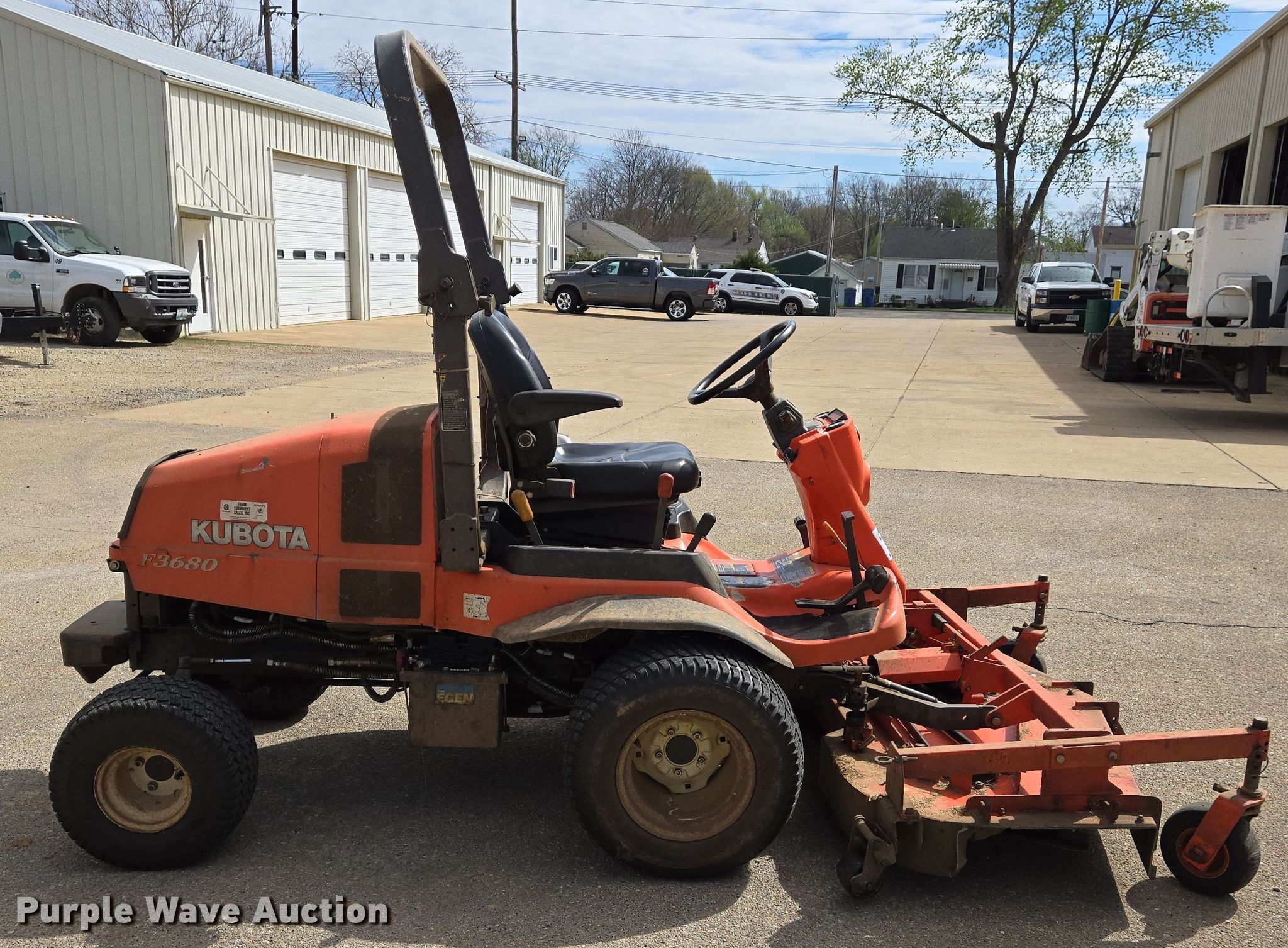 Kubota F3680 lawn mower. Hours: 2,098 on meter, Cutting width: 72". Engine Kubota V1505-ET05, Displacement: 1.5L, Cylinders: 4, Fuel type: Diesel. Transmission Hydrostatic. Operators station OROPS. Features Counter weights, Hydraulic front deck lift. Tires Front: 24x12.00-12, Rear: 18x9.50-8. City of Farmington. Farmington, MO 63640