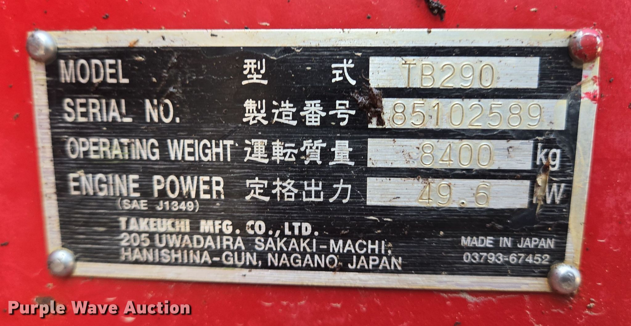 Purple Wave is selling a used Mini Excavator in Texas. This item is a 2016 Takeuchi TB290 mini excavator with the following: Hours: 5,620 on meter, Serial: 185102589