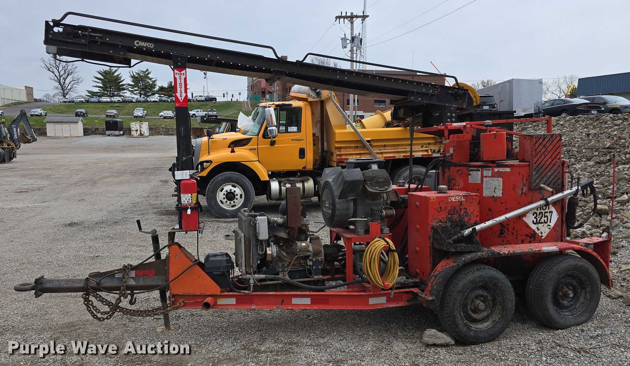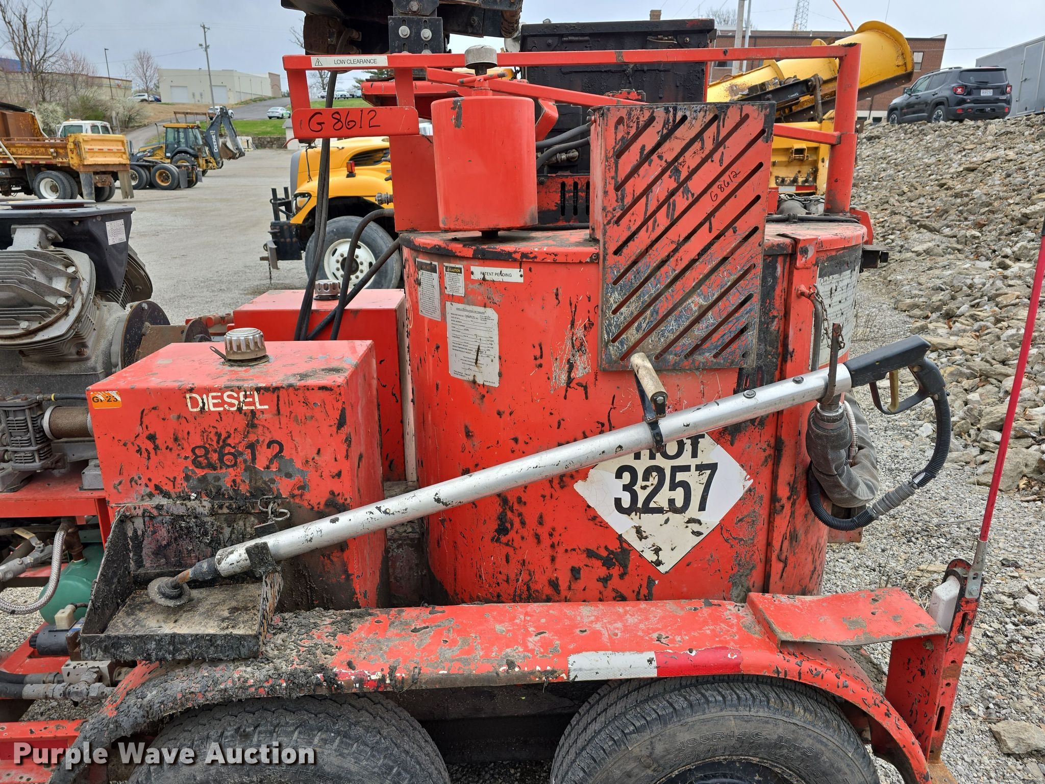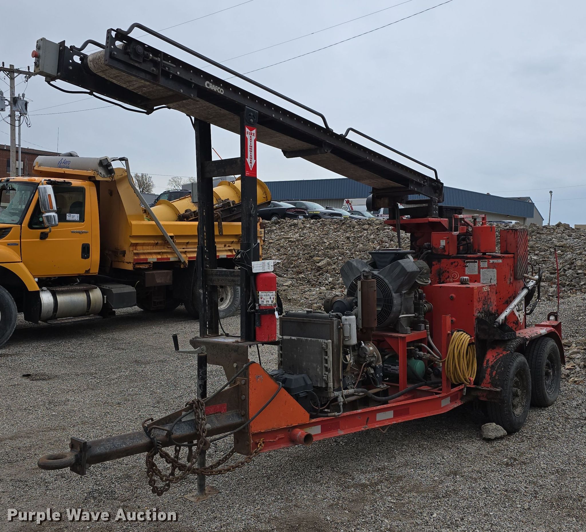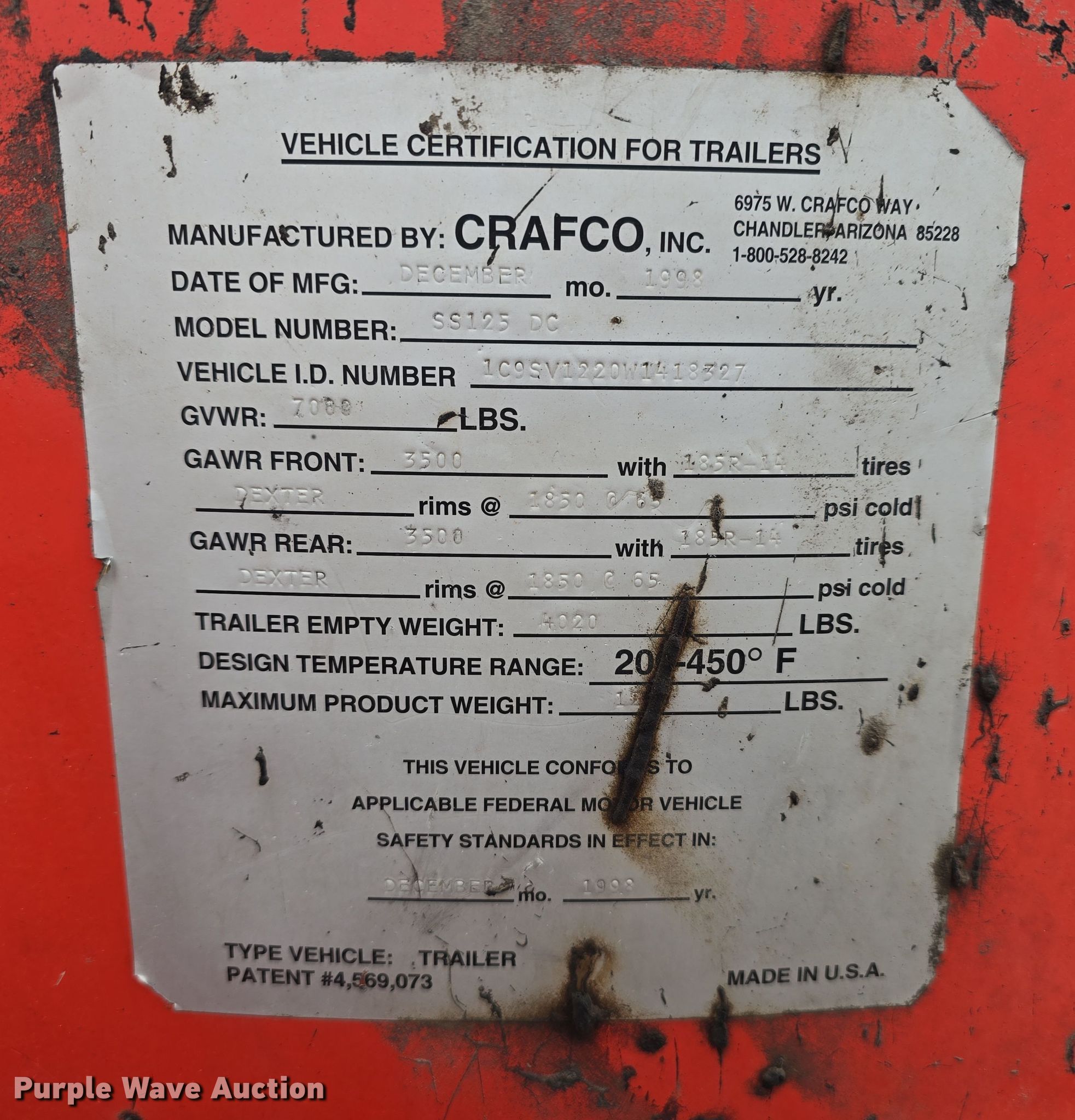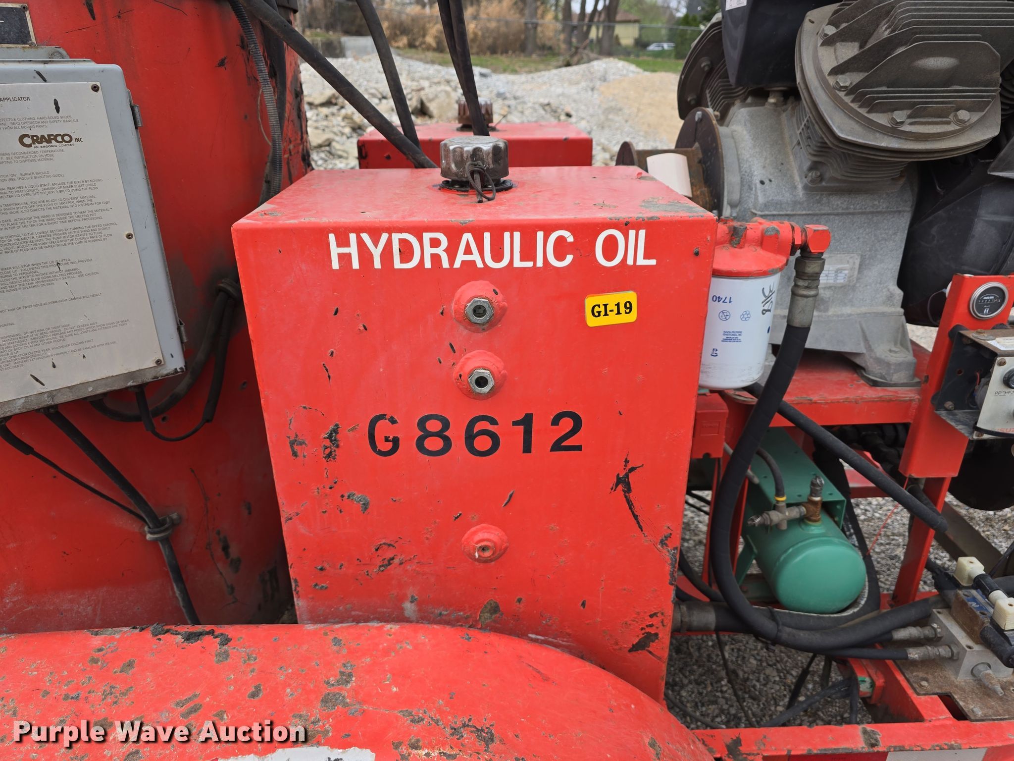 1998 Crafco SS125 DC melter applicator. Hours: 851 on meter, VIN: 1C9SV1220W1418327, Unit #: G8612. Engine Isuzu, Cylinders: 3, Fuel type: Diesel. Chassis Overall: 16' L x 65" W, Hitch: Pintle, Suspension: Spring, Brakes: Electric. Features Conveyor: 11' 5" L x 12" W, Atlas Copco air compressor Hose, Hose, Wand. Tires Front: ST205/75R14, Rear: 185R14C. Notes Unknown operating condition of air compressor. This is worksite support equipment and will not come with a title. Transfer of ownership documentation will be a bill of sale. Missouri Department of Transportation-Northwest District. Saint Joseph, MO 64506