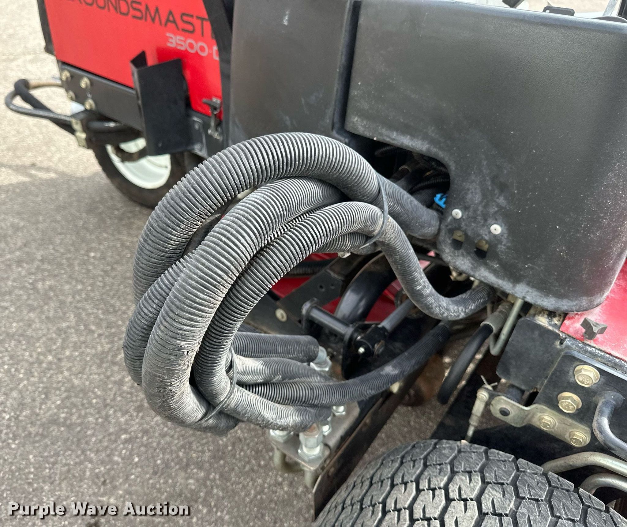 Toro Groundsmaster 3500D Sidewinder lawn mower. Hours: 3,327 on meter, Cutting width: 68". Engine Kubota D1105, Cylinders: 3, Fuel type: Diesel. Transmission Hydrostatic. Operators station OROPS. Features Hydraulic front deck lift. Tires Front: 305/40-10, Rear: 20x10.00-10. Three Rivers Parks. Maple Plain, MN 55359