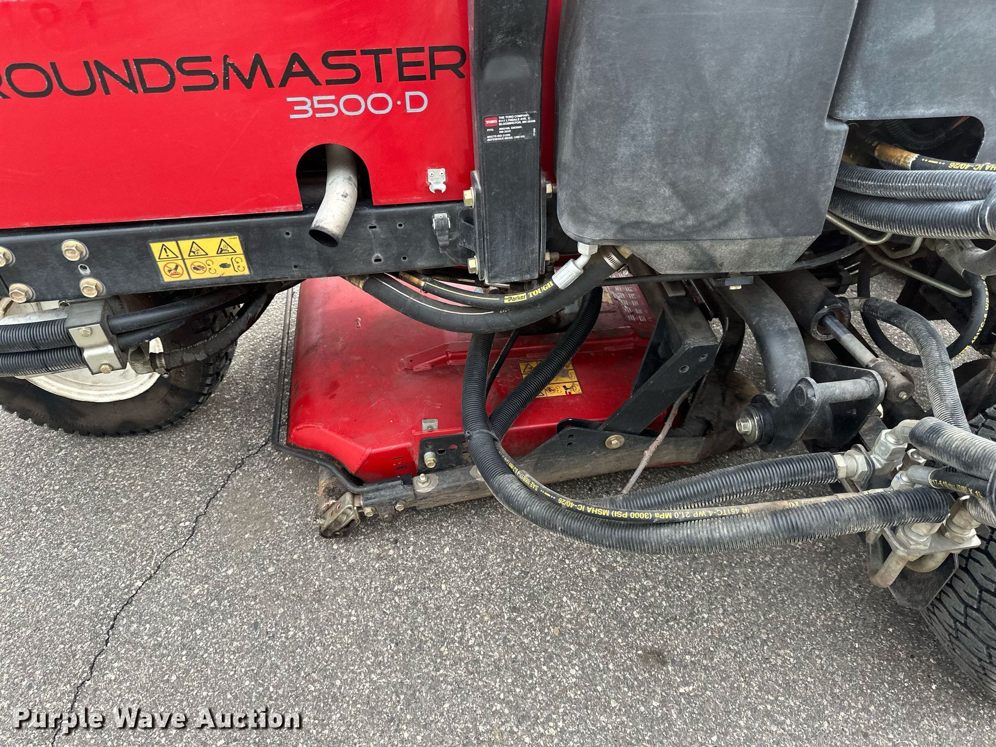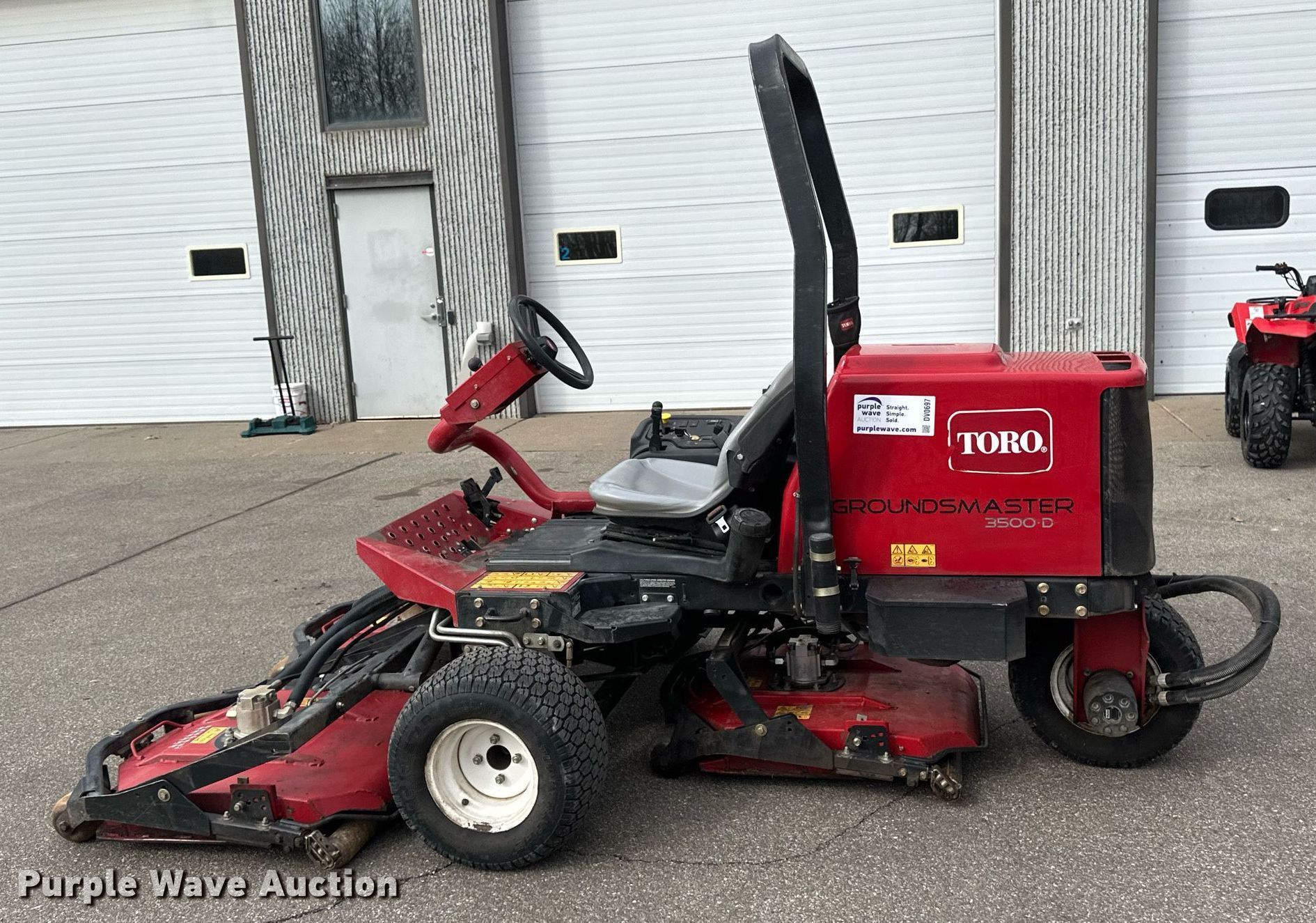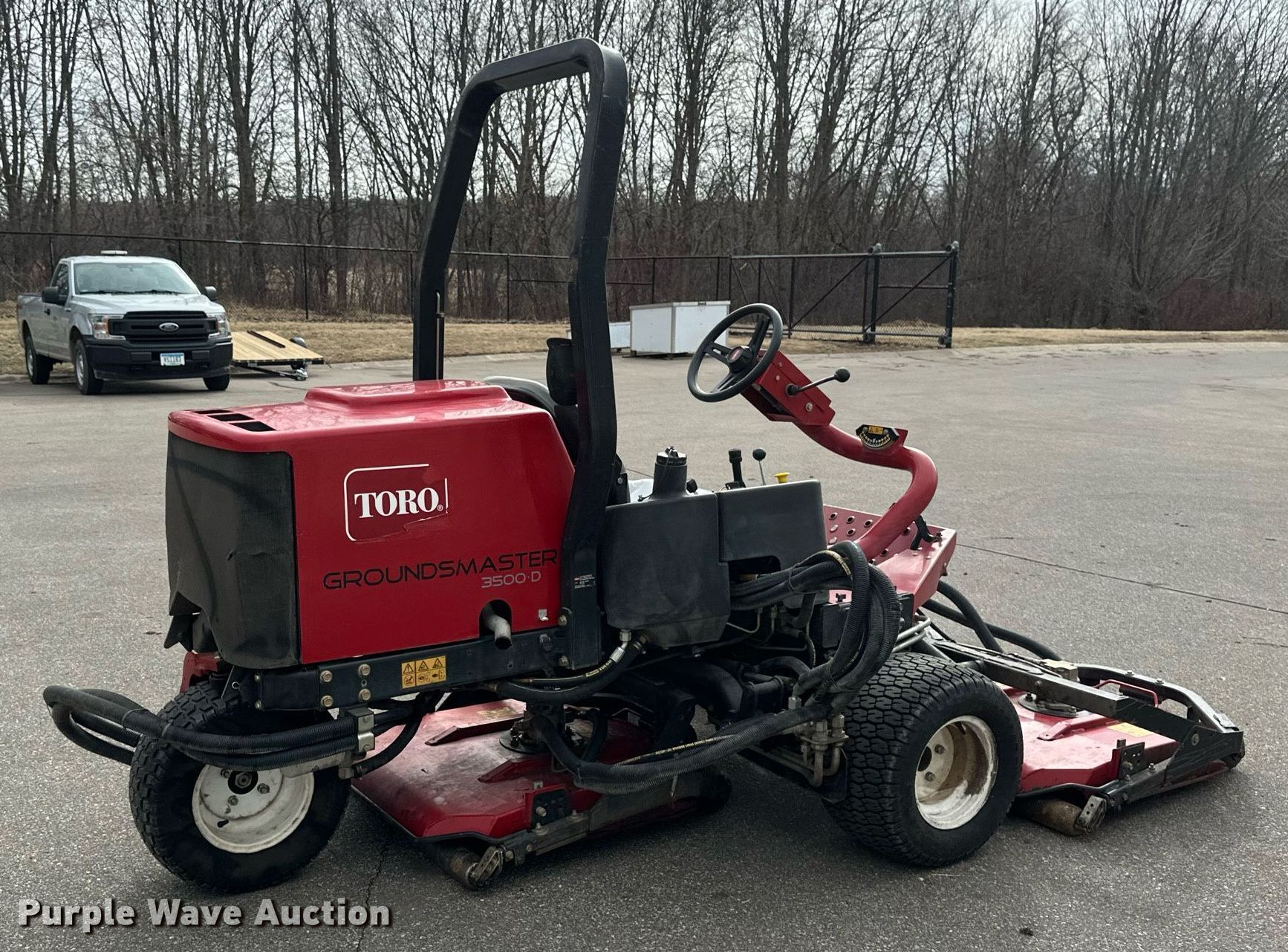 Purple Wave is selling a used Commercial Turf Mower in Minnesota. This item is a Toro Groundsmaster 3500D Sidewinder lawn mower with the following: Hours: 3,589 on meter, Cutting width: 68", Serial: 401375961