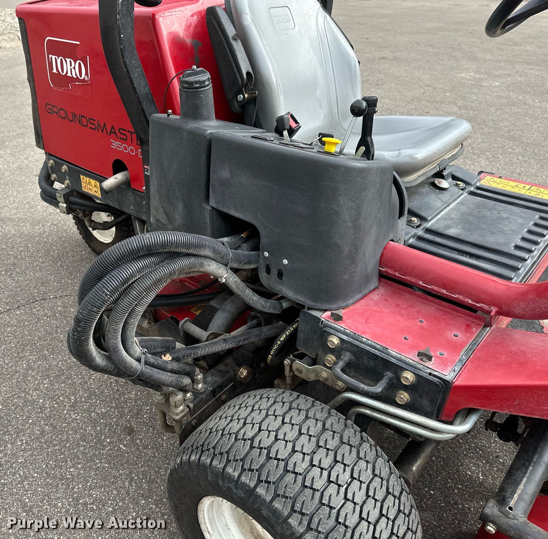 Toro Groundsmaster 3500D Sidewinder lawn mower. Hours: 3,589 on meter, Cutting width: 68", Serial: 401375961. Engine Kubota D1105, Cylinders: 3, Fuel type: Diesel. Transmission Hydrostatic. Features Hydraulic front deck lift. Tires Front: 305/40-10, Rear: 20x10.00-10. Three Rivers Parks. Maple Plain, MN 55359