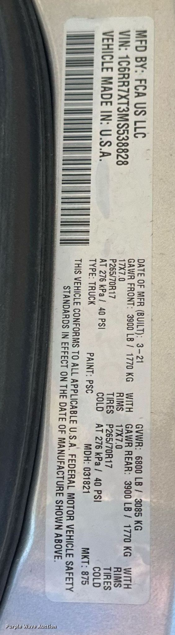 - VIN: 1C6RR7XT3MS538828