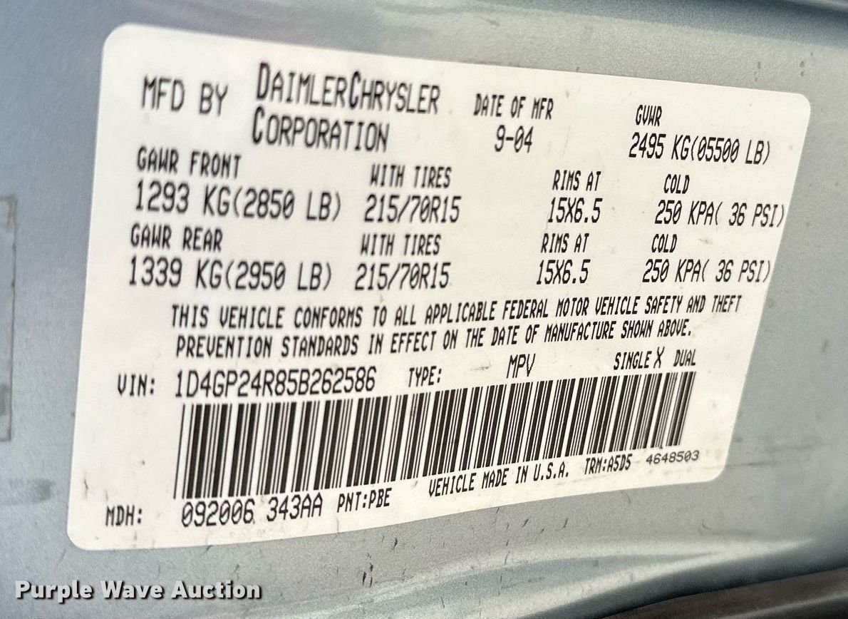 Purple Wave is selling a used Passenger Vehicle in Kansas. This item is a 2005 Dodge Grand Caravan van with the following: Miles: 191,608 on odometer, VIN: 1D4GP24R85B262586