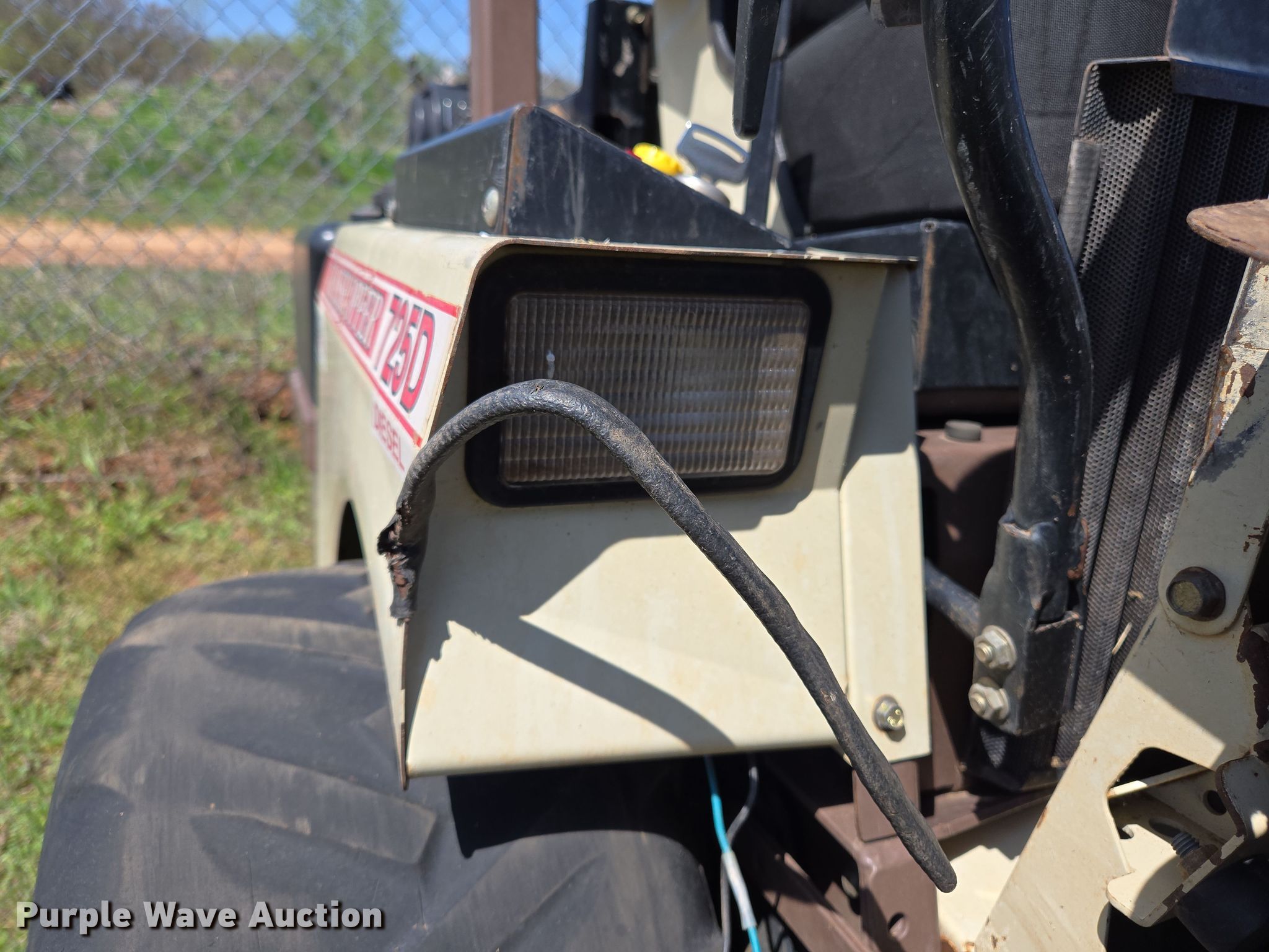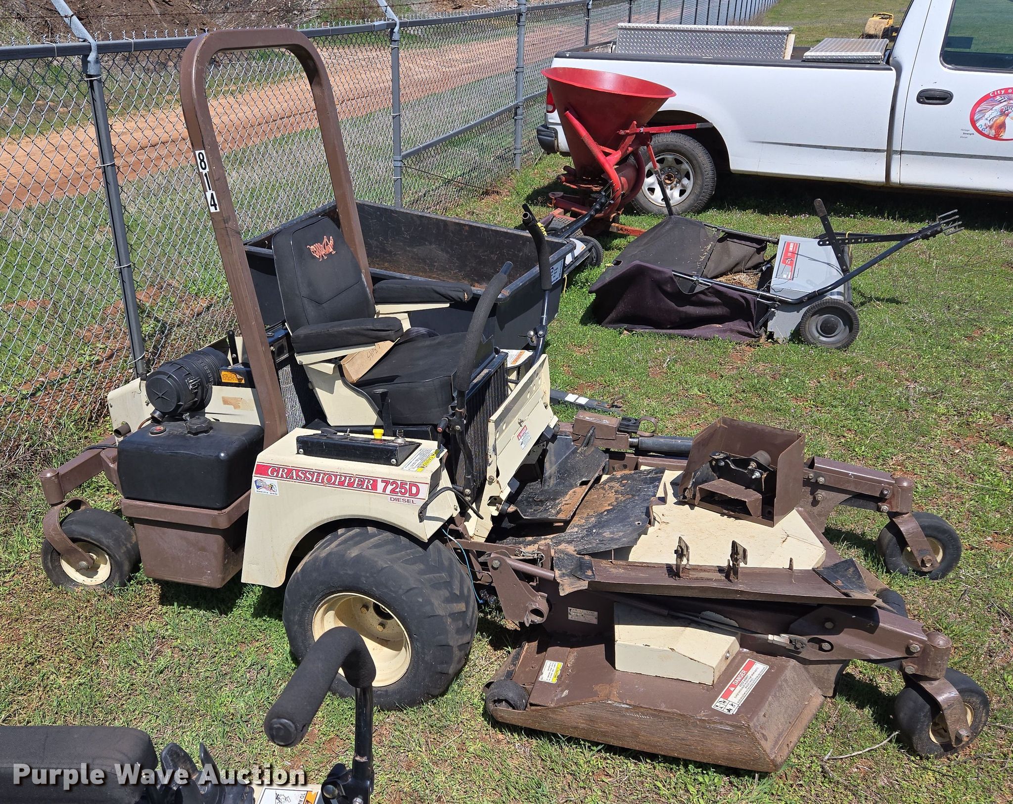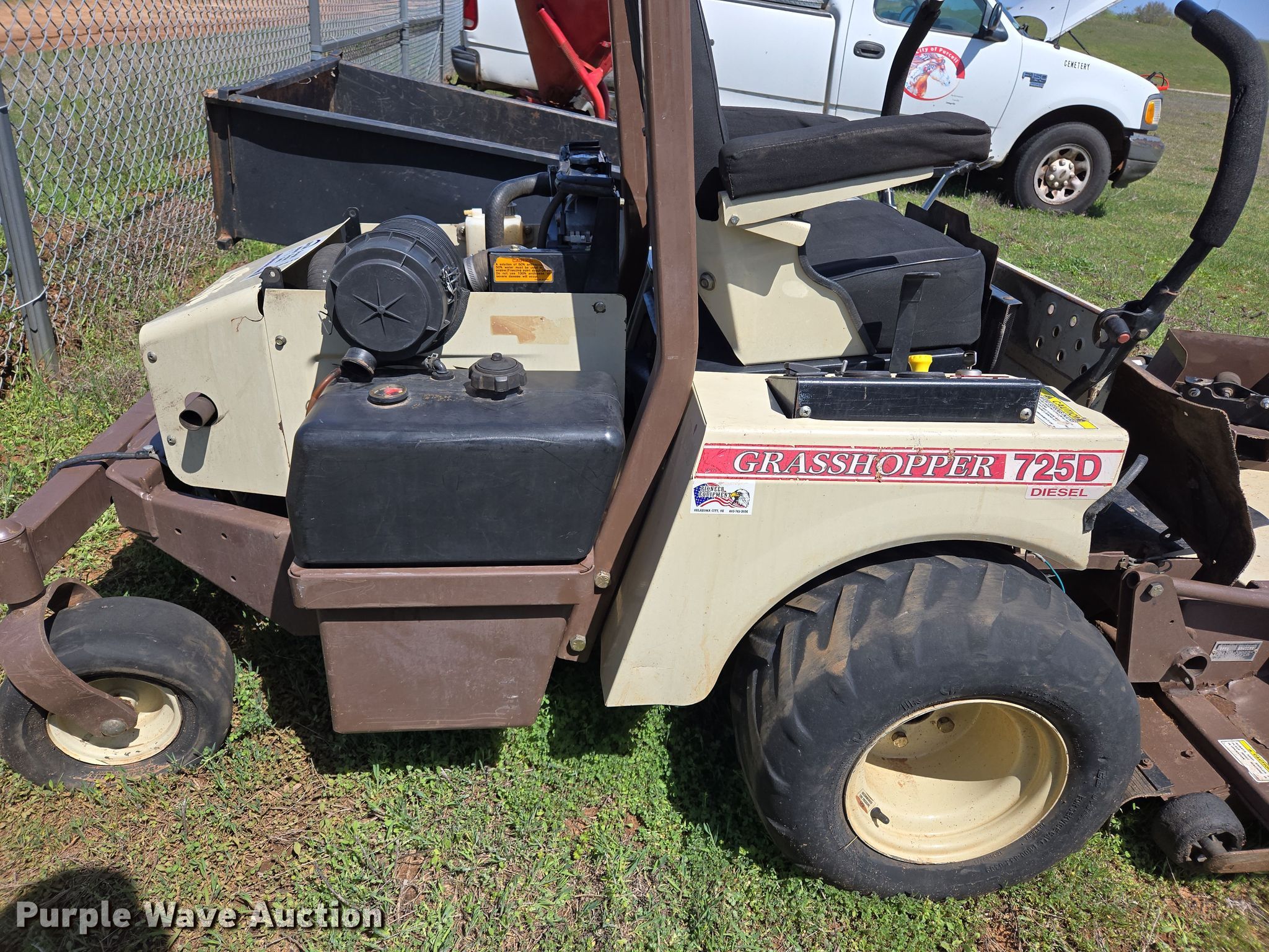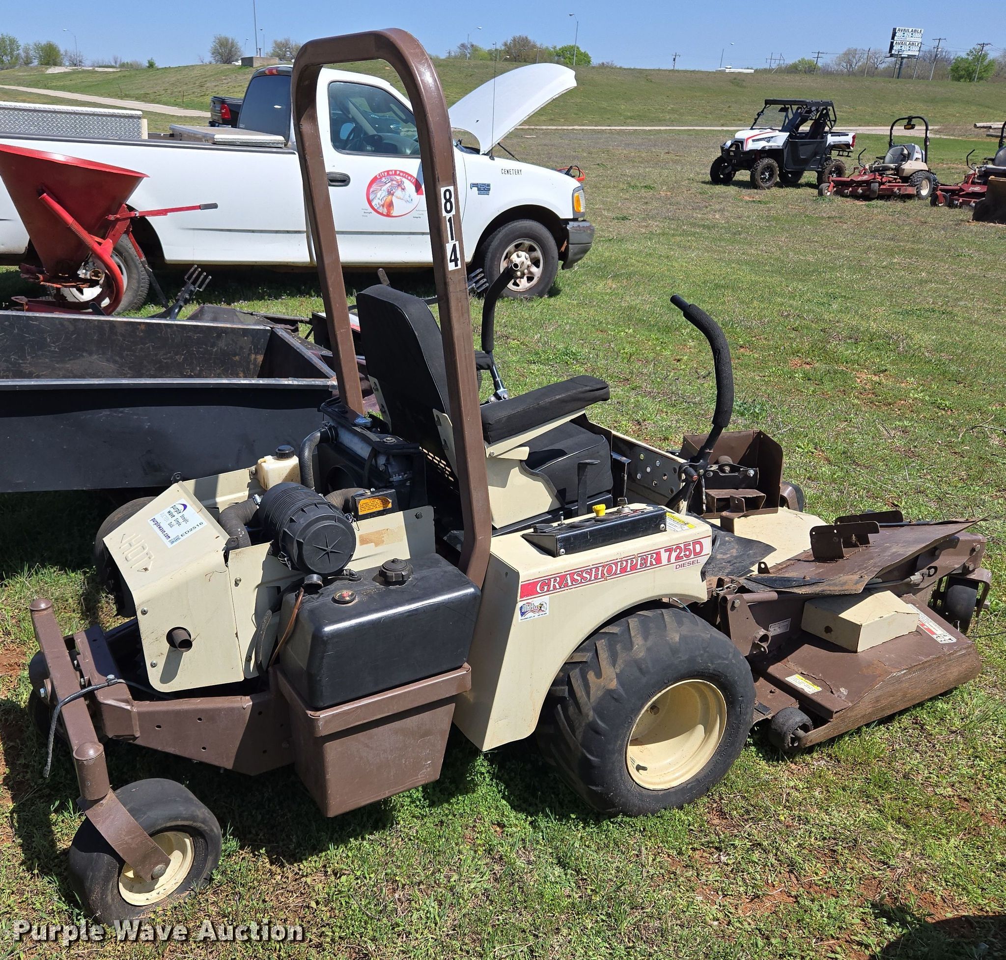 2013 Grasshopper 725D ZTR lawn mower. Hours: 2,653 on meter, Cutting width: 52", Serial: 6340055. Engine Kubota D902, Displacement:.898L, Cylinders: 3, Fuel type: Diesel, kW: 18.5. Transmission Hydrostatic. Features Hydraulic front deck lift. Tires Front: 9x3.5-4/2.25, Rear: 22x9-10. Notes Non-operational unit. City of Purcell. Purcell, OK 73080