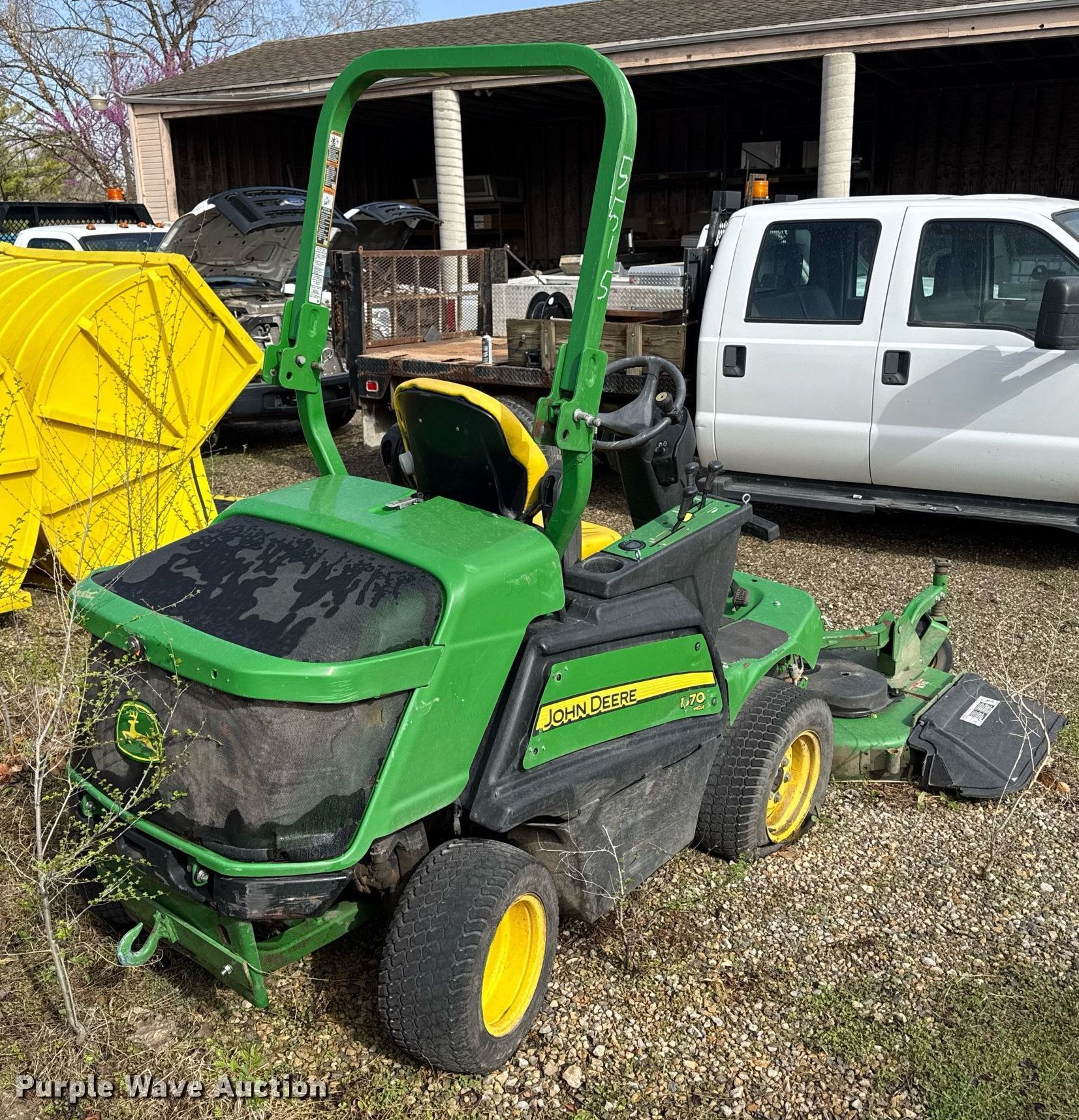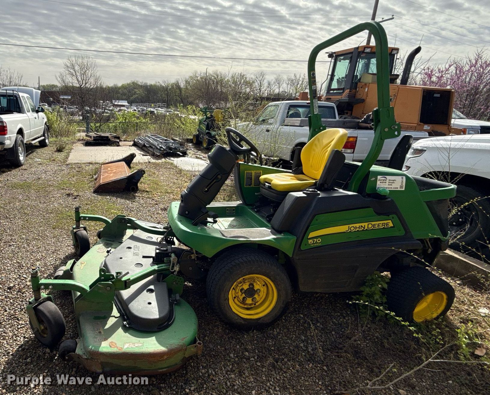 John Deere 1570 ZTR lawn mower. Hours: Unknown, Cutting width: 72". Engine Cylinders: 3, Fuel type: Diesel. Transmission Hydrostatic. Tires Front: 23x10.50-12, Rear: 215/50R10. Notes Dead battery, Non-operational unit. City of Lawrence. Lawrence, KS 66044