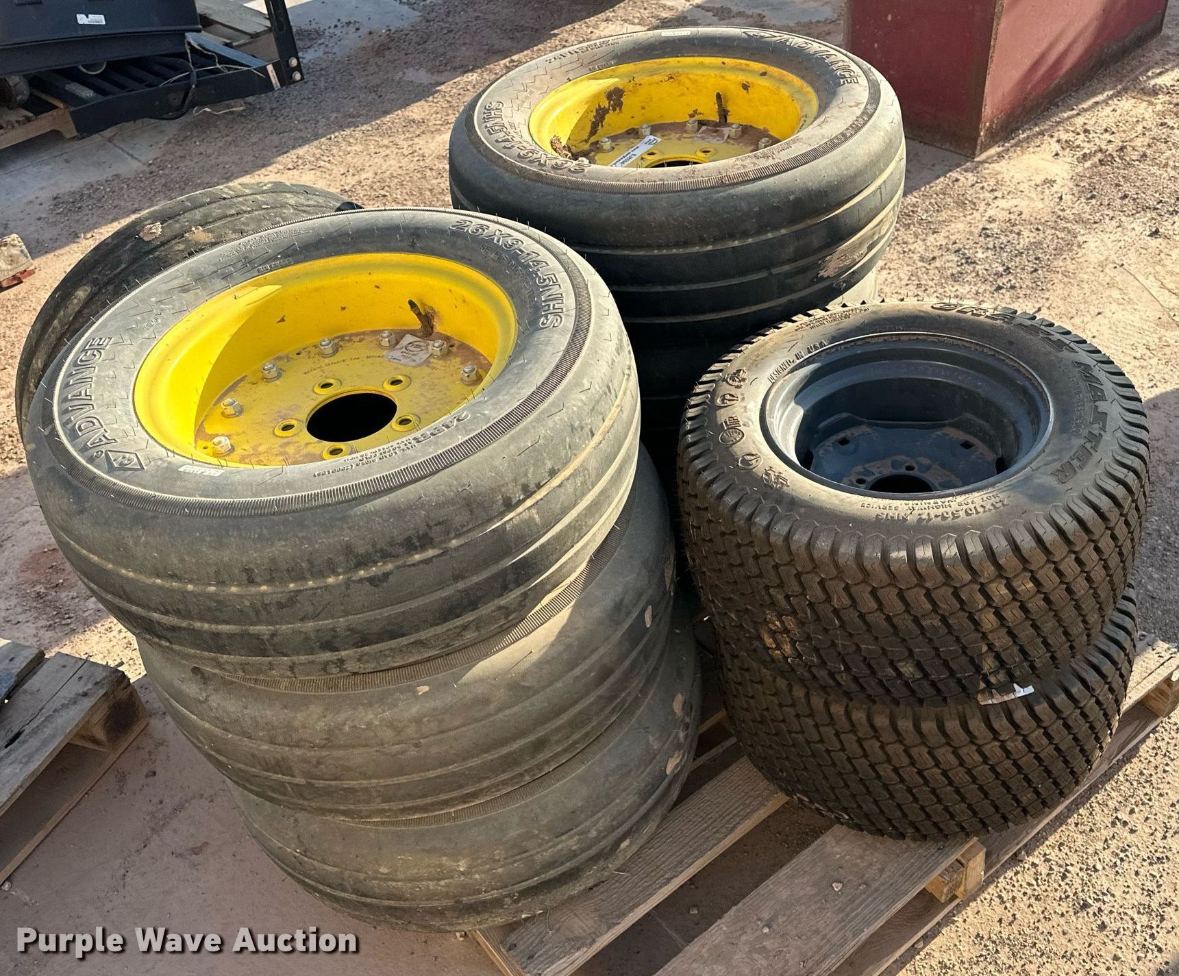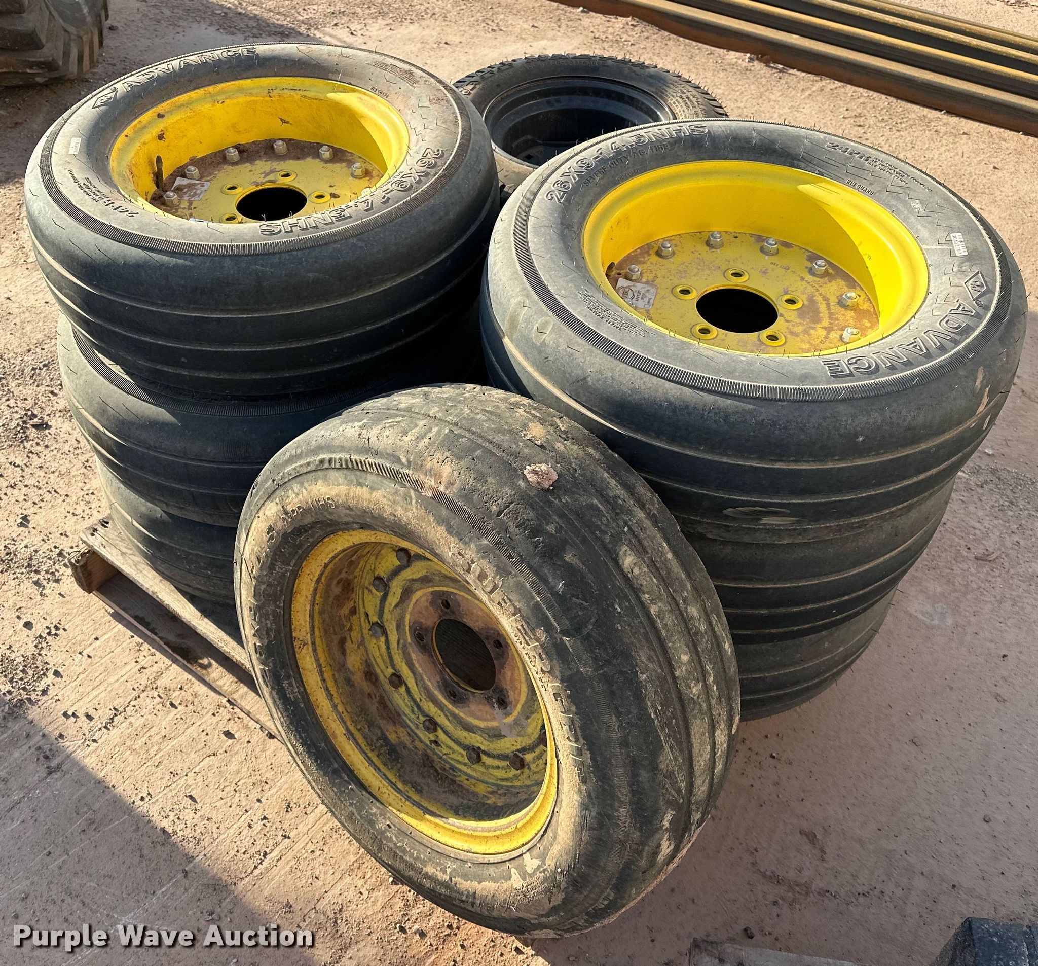 Purple Wave is selling a used Ag Equip. Other in Oklahoma. This item is a (9) tires and wheels with the following: (7) Advance tires and wheels, Size: 26x9-14.5, (2) Grass Master tires and wheels, Size: 23x10.50-12