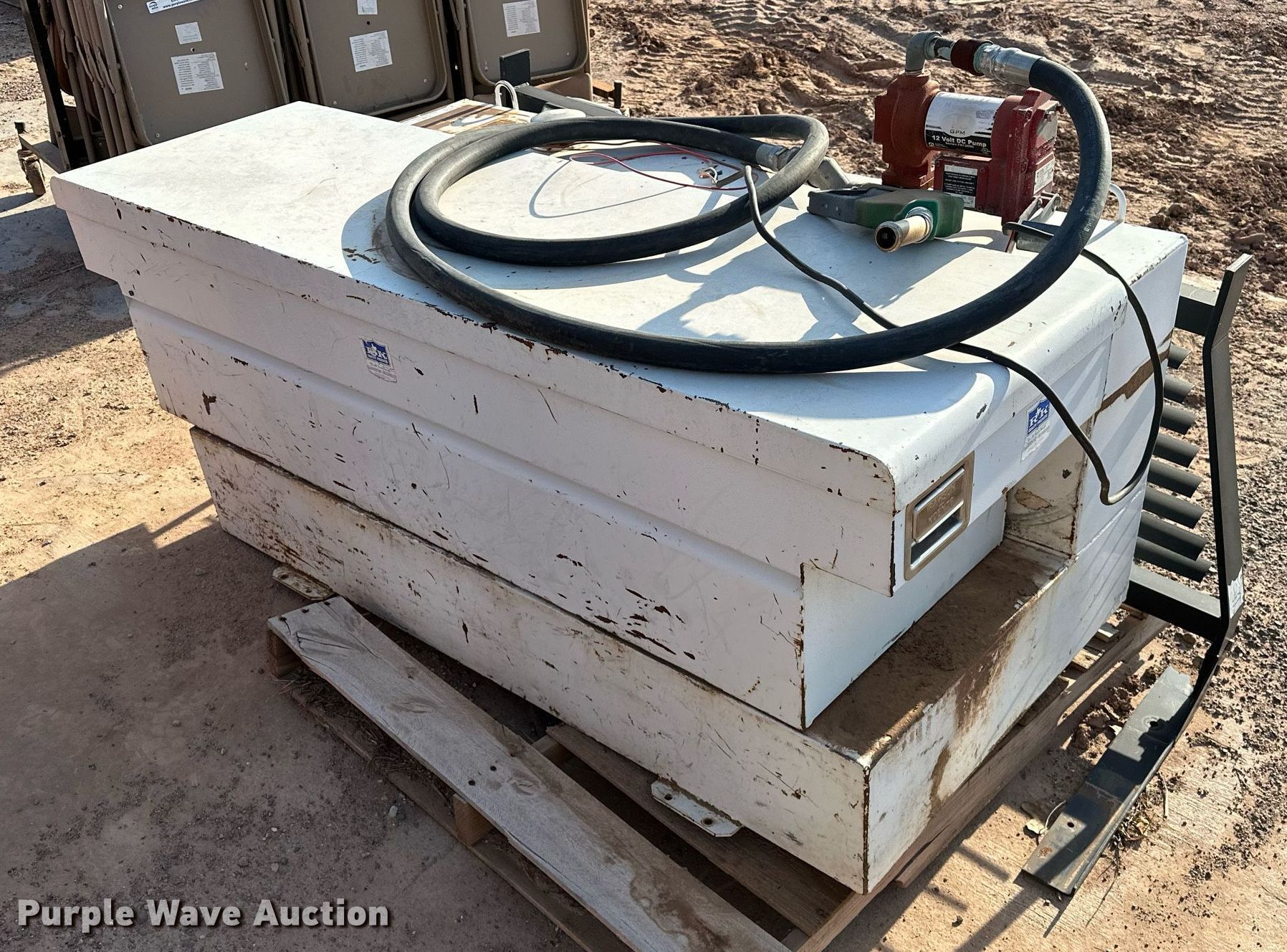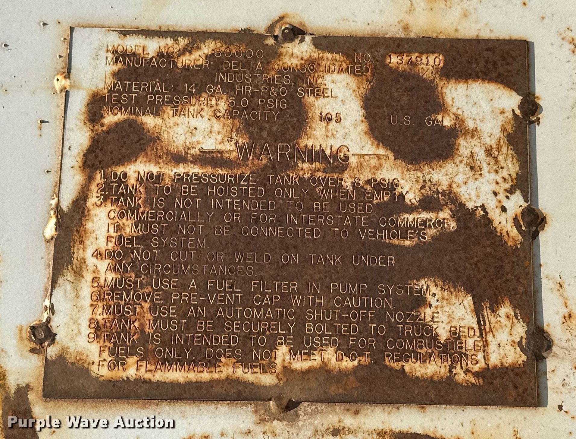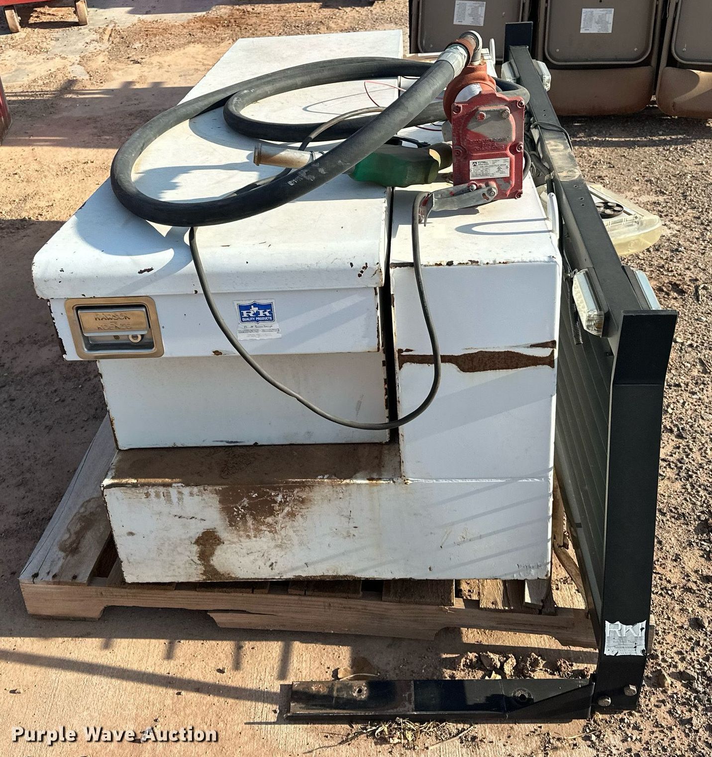 Purple Wave is selling a used Automotive Parts or Acces. in Oklahoma. This item is a Automotive parts with the following: Rawson Koenig toolbox, Rawson Koenig headache rack, Delta Consolidated auxiliary fuel tank, Fill-Rite pump, Capacity: 105 gallons, Volts: 12, Hose, Nozzle