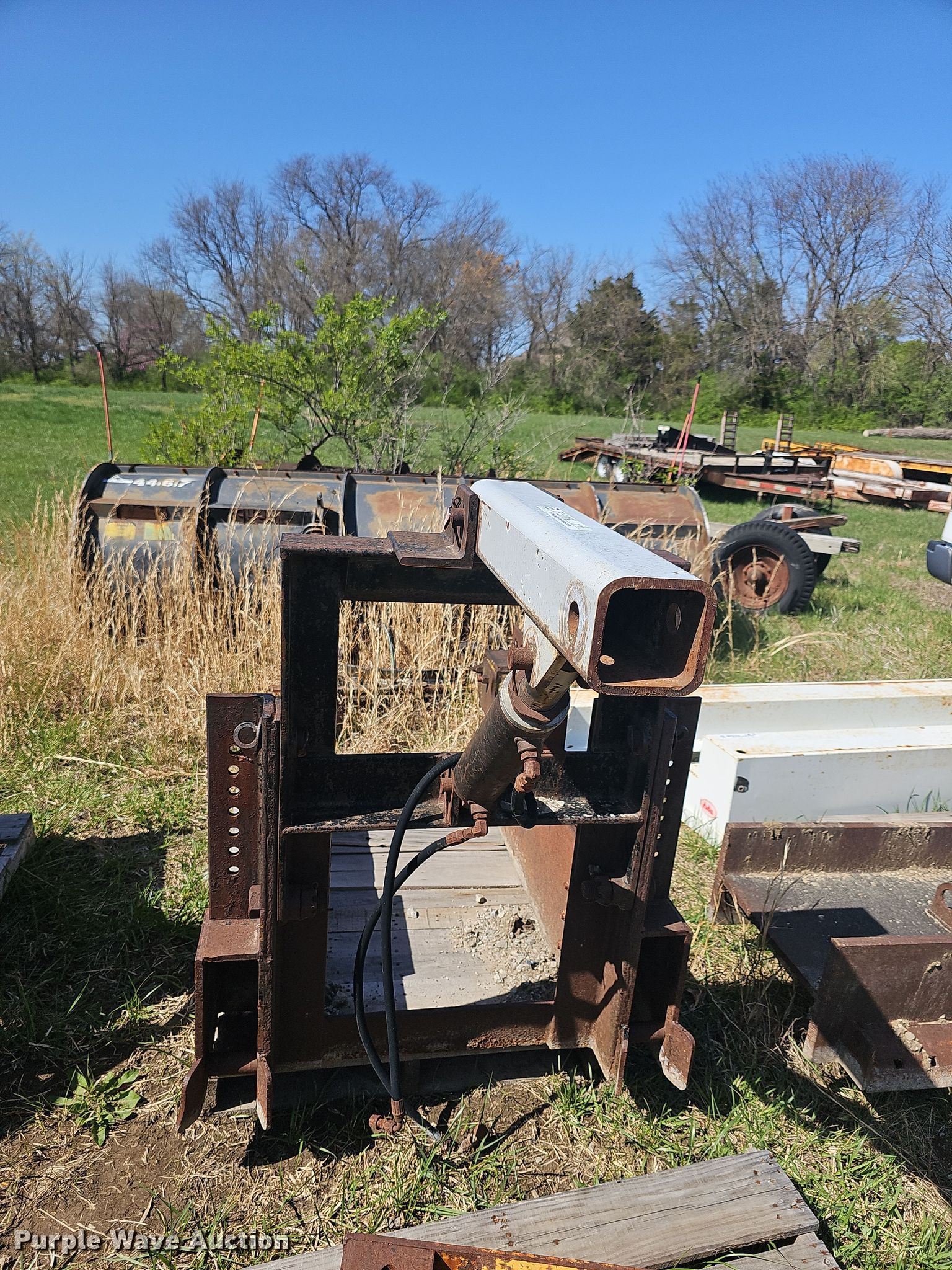 Purple Wave is selling a used Truck Part and Attach. in Kansas. This item is a Truck parts with the following: (2) Snow plows, Width: 11', Running gear trailer, Hitch: Pintle, Tire size: 7.50x16