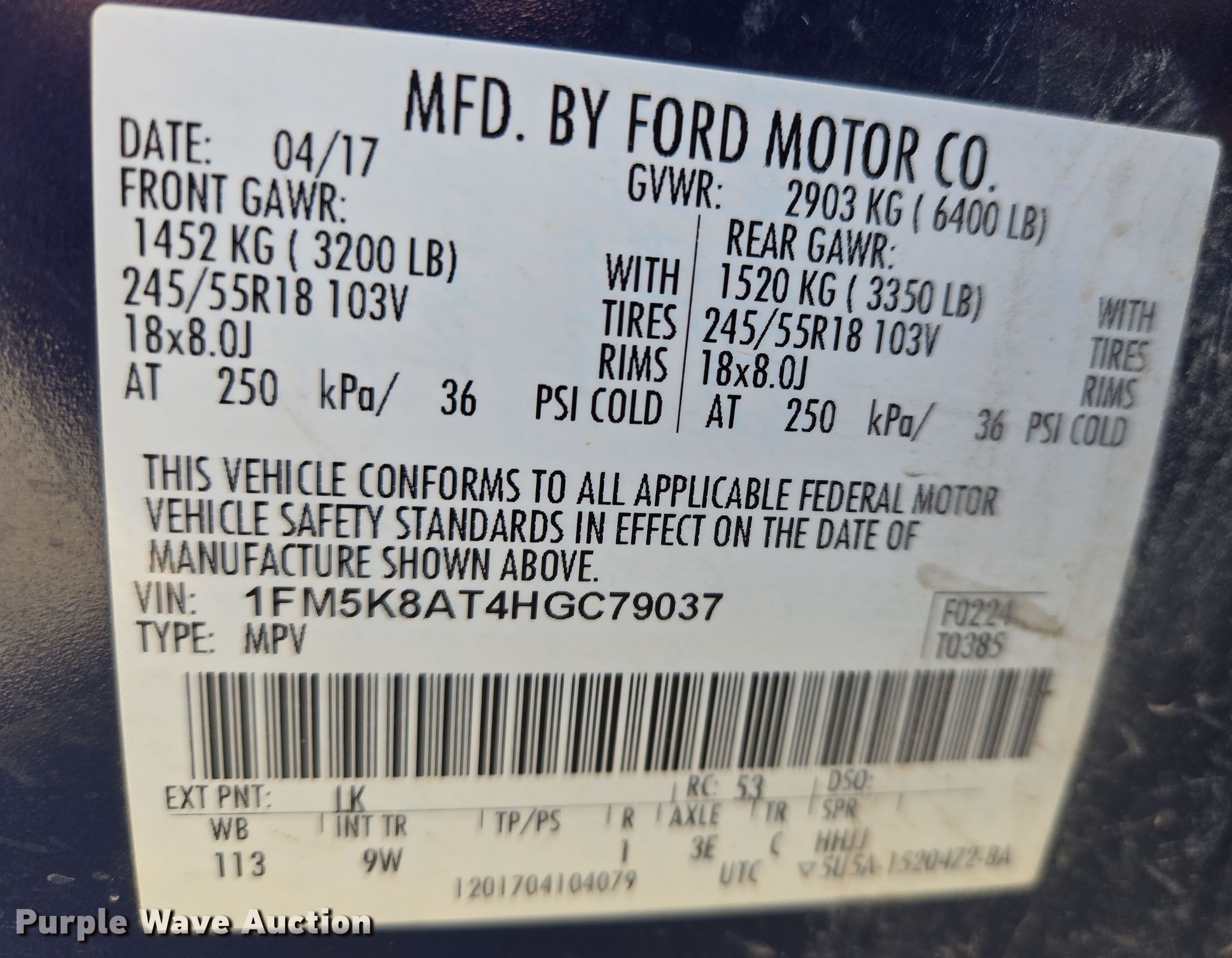 - VIN: 1FM5K8AT4HGC79037