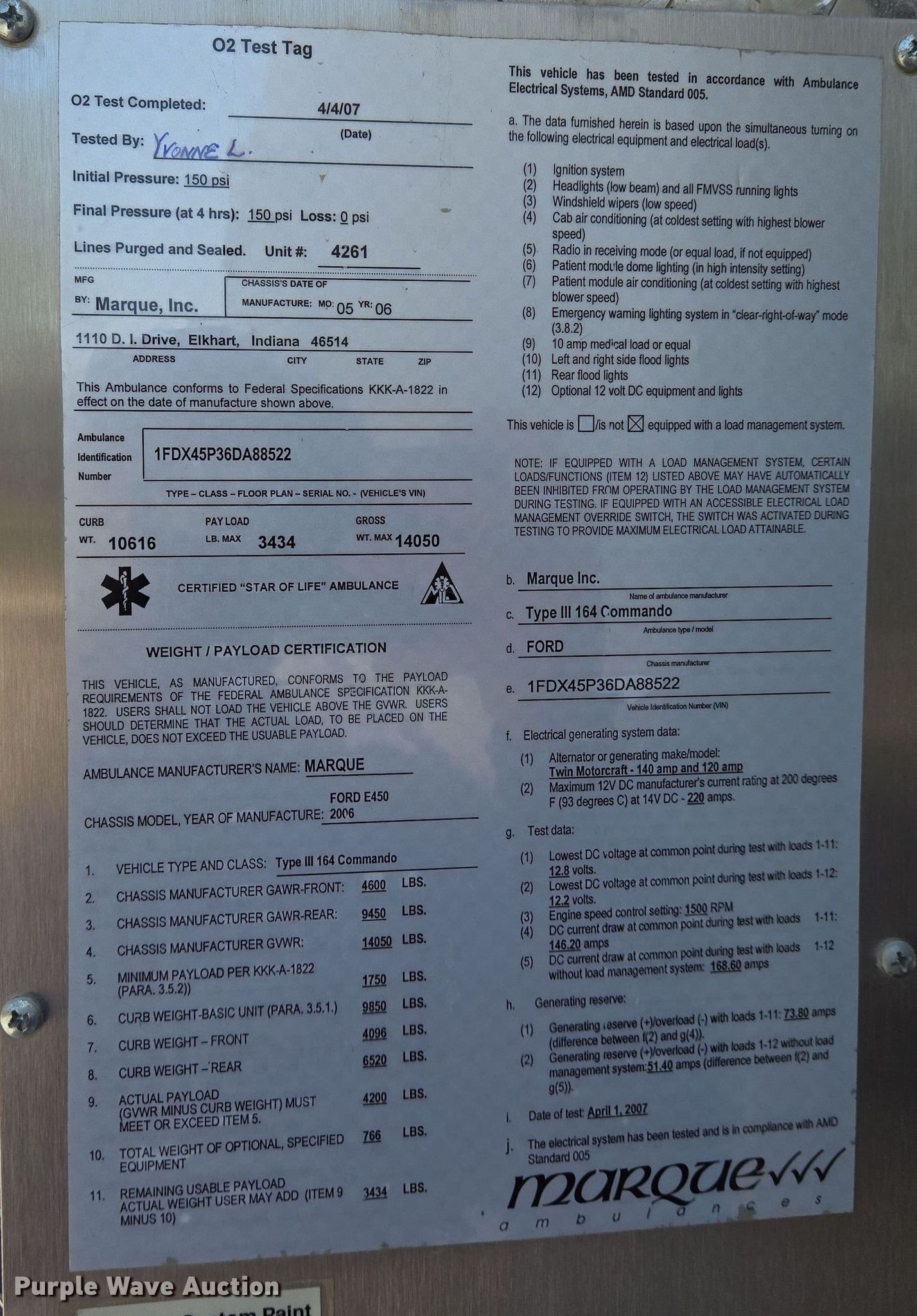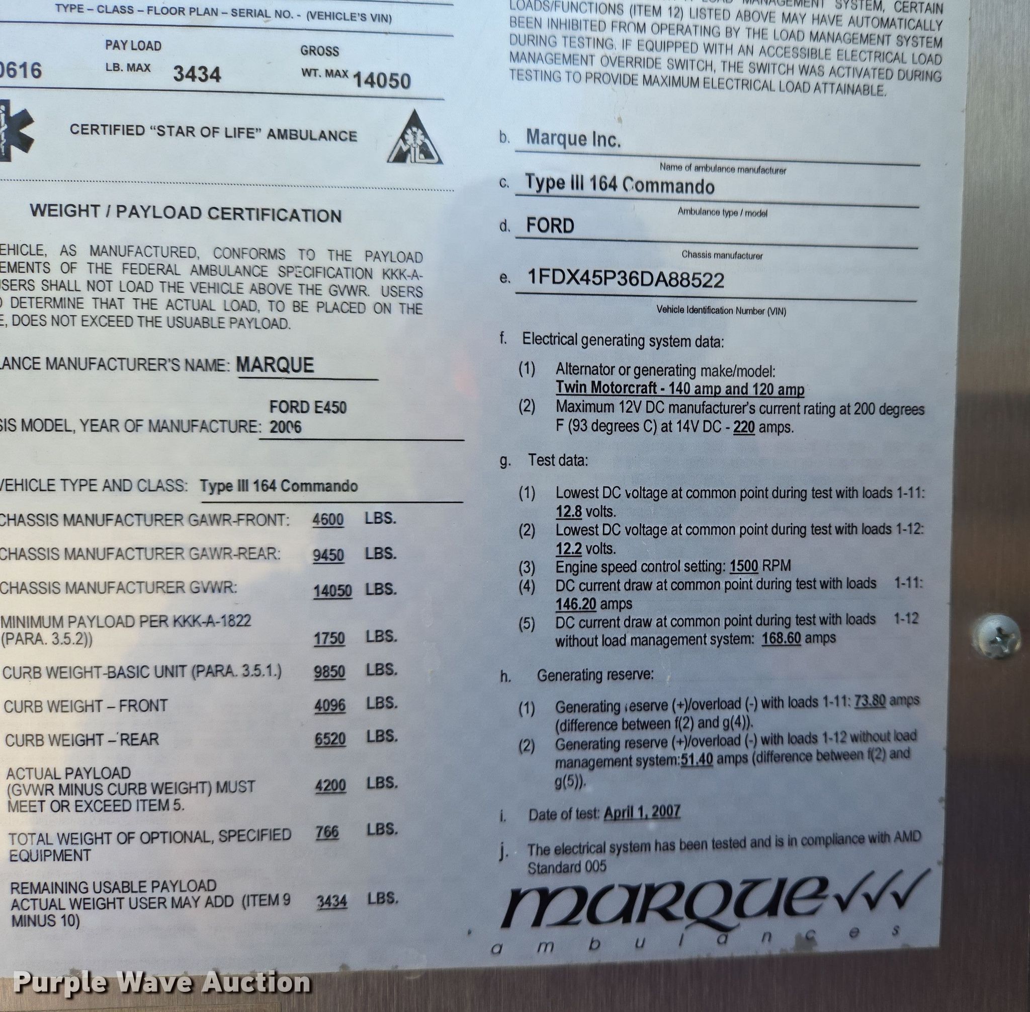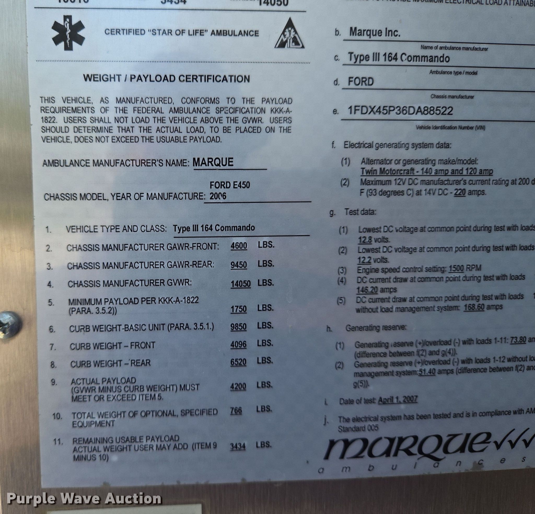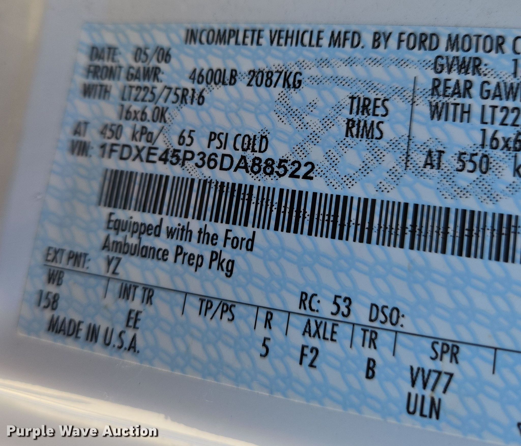 2006 Ford E450 Super Duty ambulance. Miles: 167,026 on odometer, VIN: 1FDXE45P36DA88522. Engine Displacement: 6.0L, Cylinders: 8, Fuel type: Diesel. Transmission Automatic. Chassis Axles: Single, Suspension: Spring, Brakes: Hydraulic, GVWR: 14,050 lbs, Wheelbase: 158". Interior AC, Heat, Power windows, Power locks, Cruise control, Auxiliary controls. Features Ambulance body Marque, PA/ siren controls, Oxygen hookups. Tires Size: 225/75R16. Kansas title. Title distribution may be delayed up to 14 days from verification of funds. Sedan Area EMS. Sedan, KS 67361