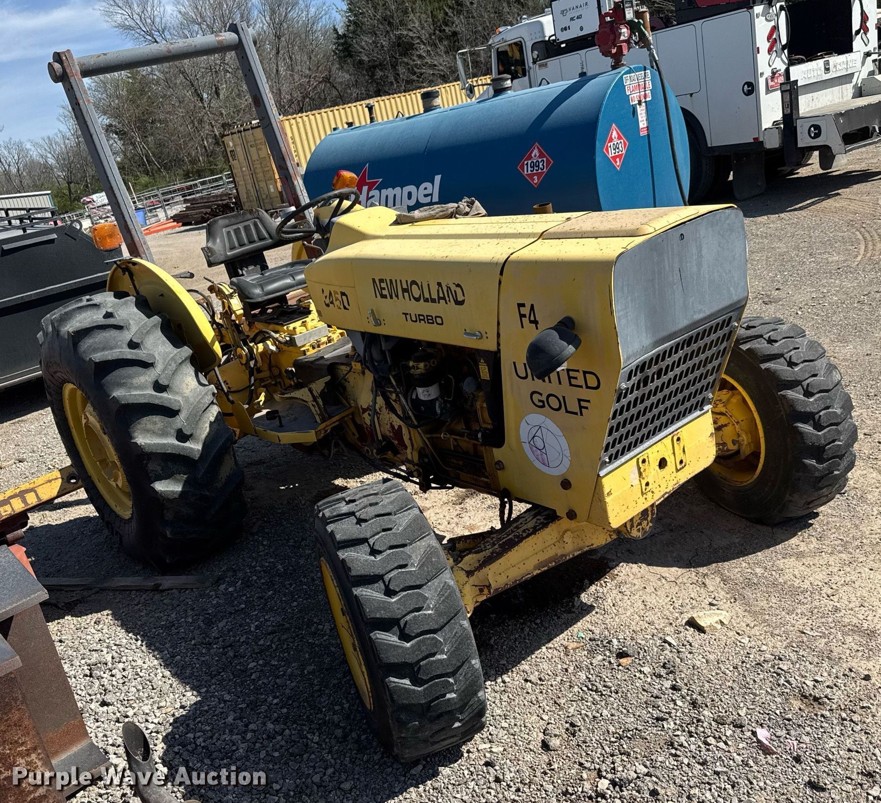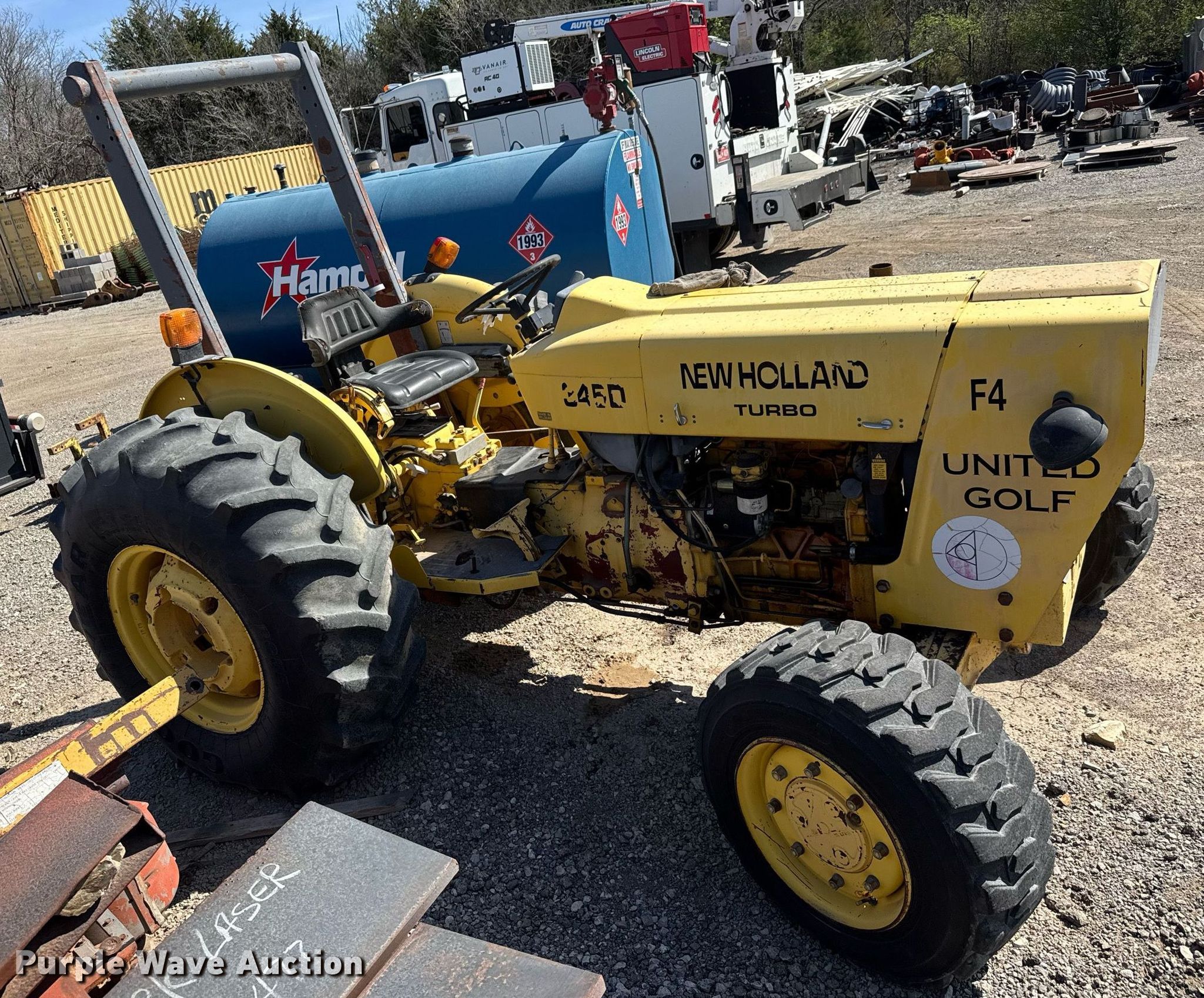 New Holland 345D MFWD tractor. Hours: 4,510 on meter, Serial: A444462, Unit #: F4. Engine Cylinders: 3, Fuel type: Diesel. Transmission Manual, 8F - 8R. Features PTO: 540, Three point Top link. Tires Front: 12-16.5, Rear: 16.9-24, Wheel weights: 2. Notes Dead battery, Non-operational three point, Fuel leak , Unknown operating condition. Paragon Contractors. Tulsa, OK 74116