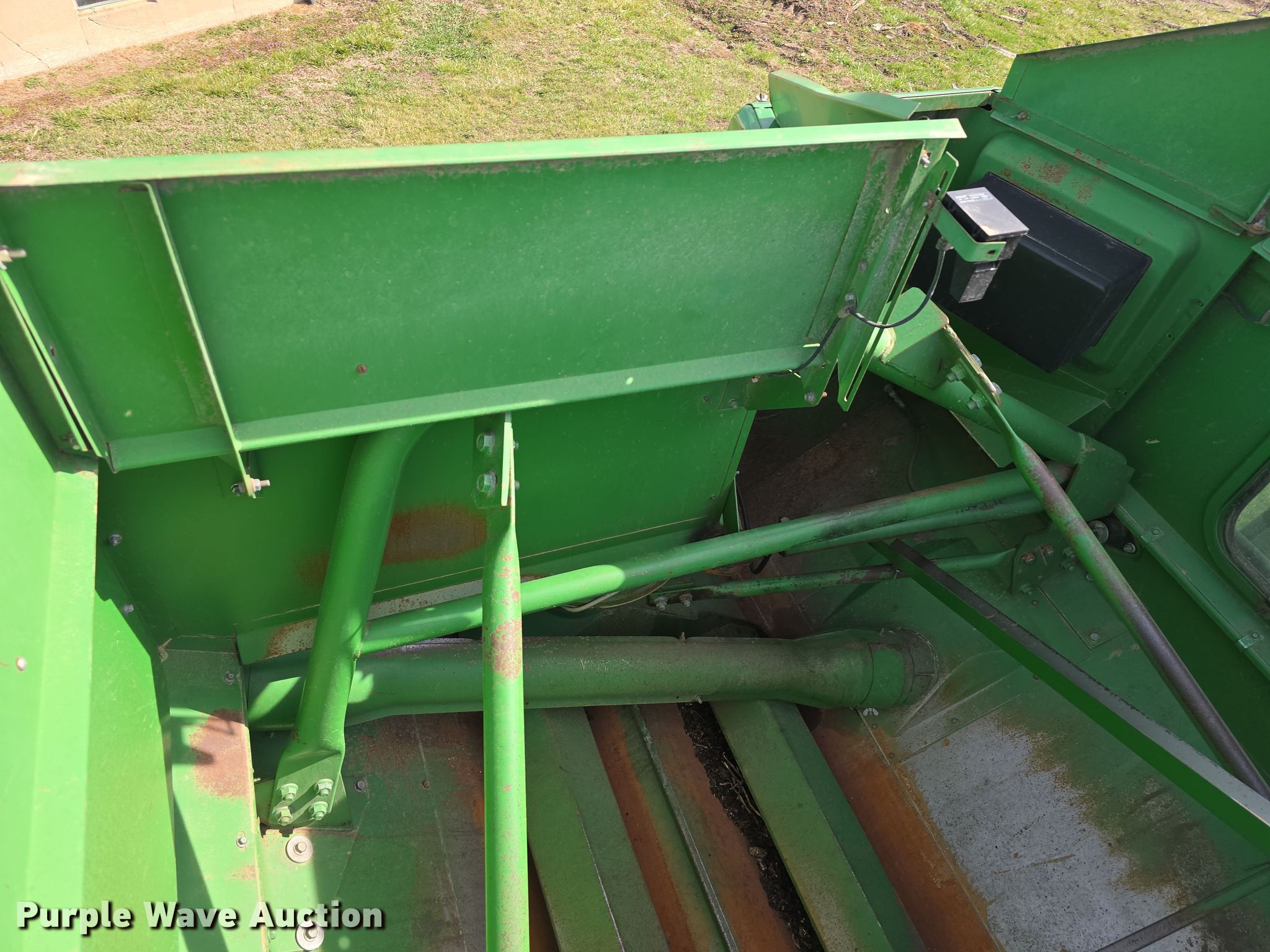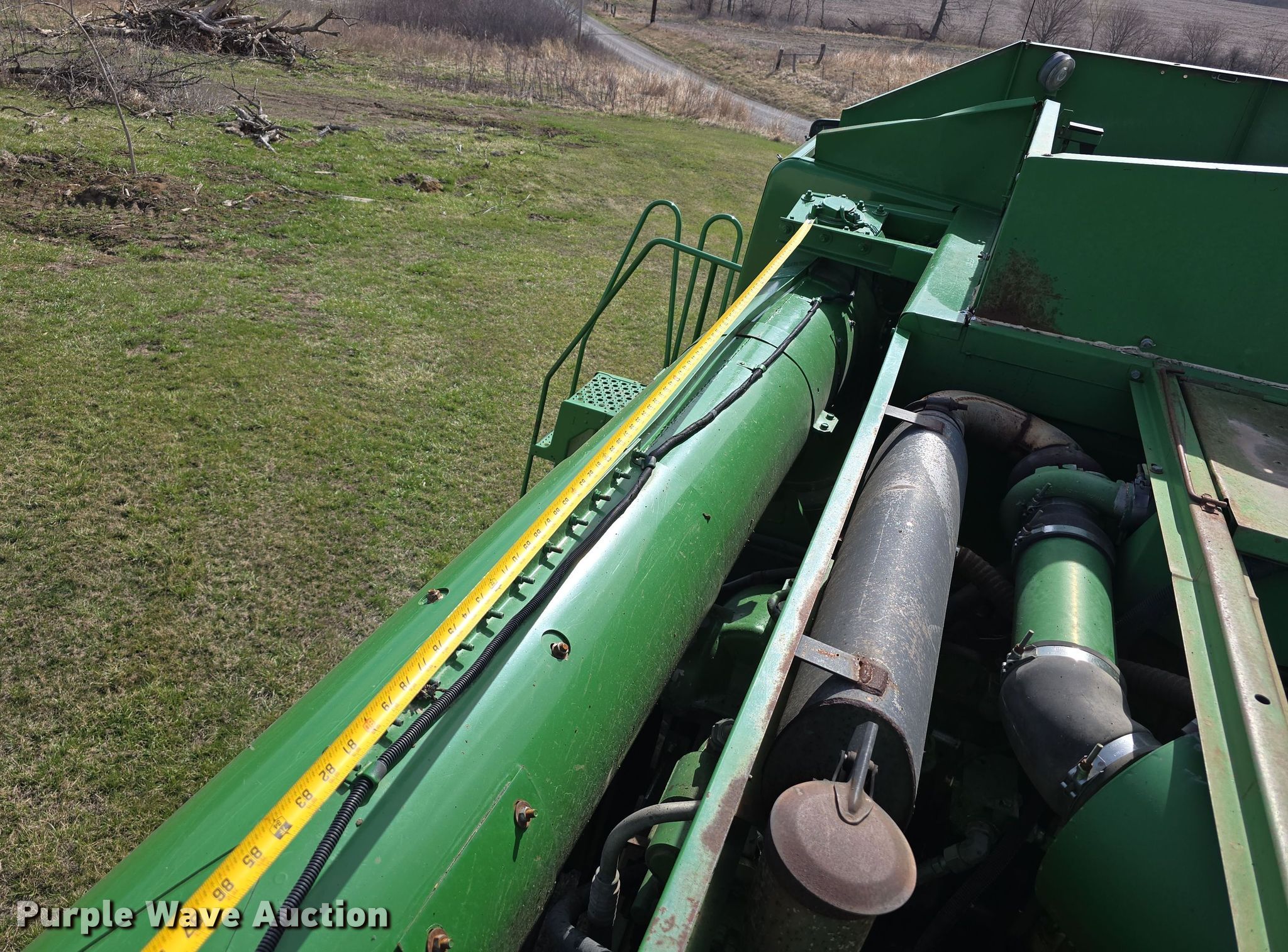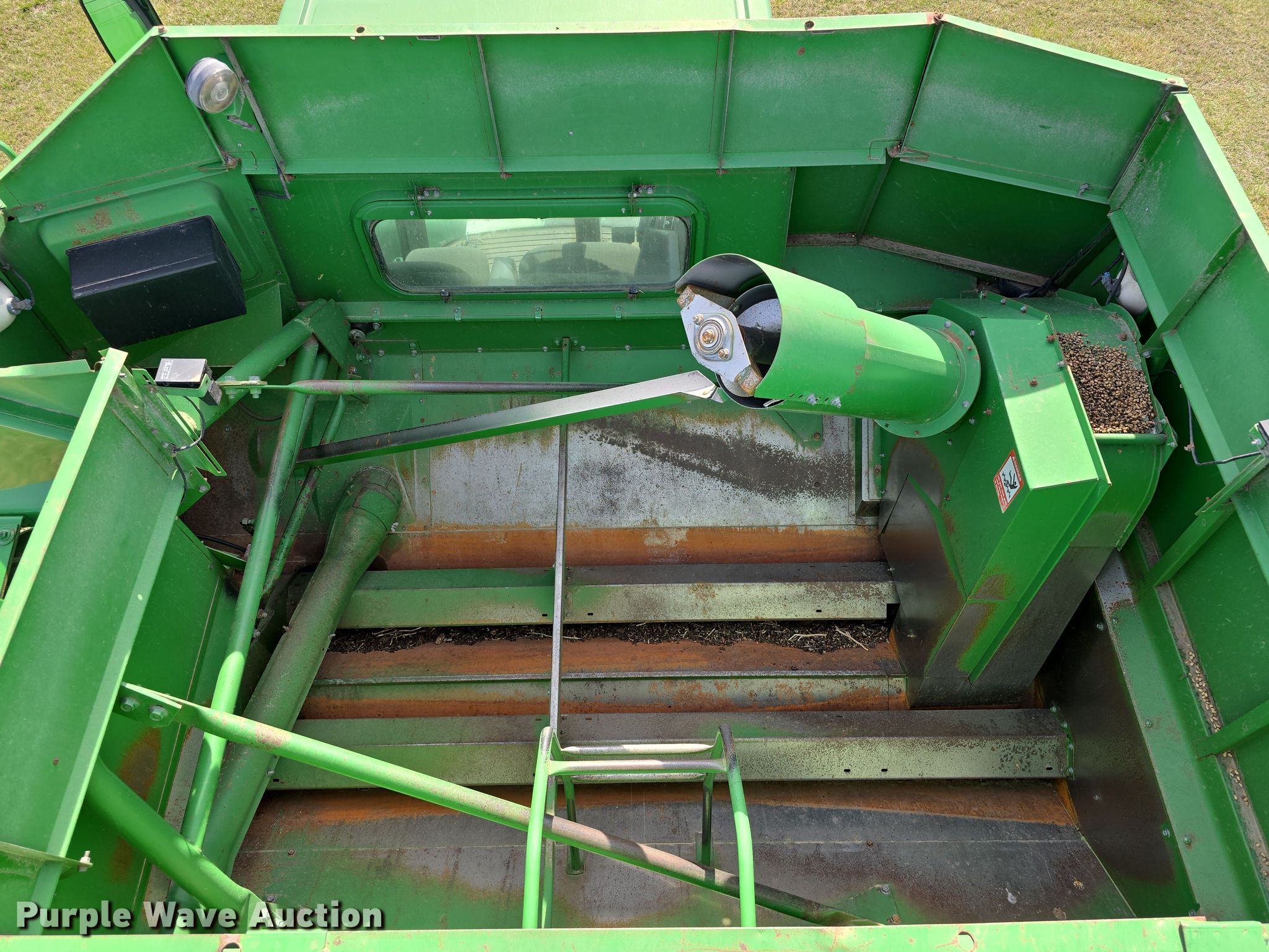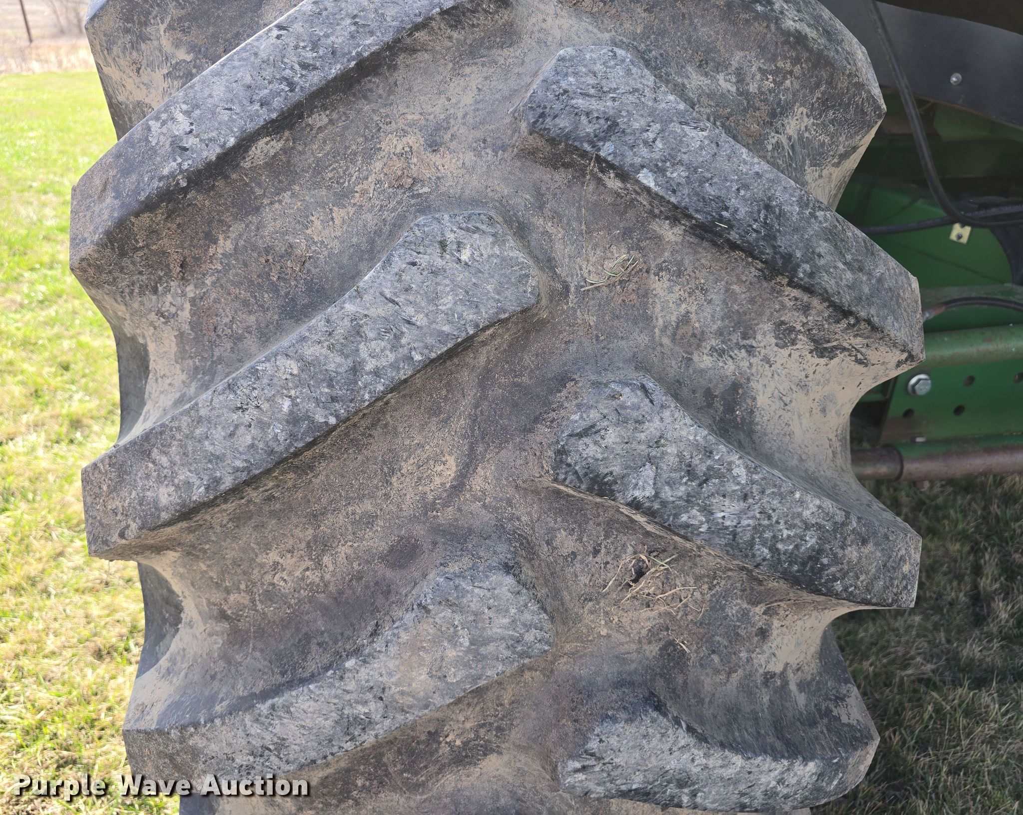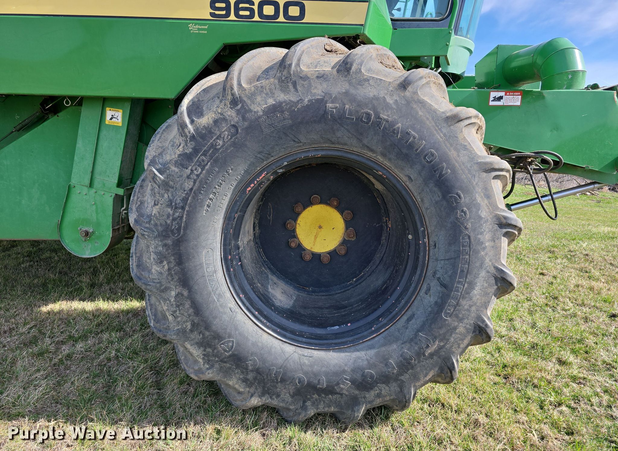 1989 John Deere 9600 RWA combine. Engine hours: 2,936 on meter, Separator hours: 2,072 on meter, Serial: H09600X632469. Engine John Deere, Cylinders: 6, Fuel type: Diesel. Transmission Hydrostatic, 6F - 6R. Operators station AC, Heat. Features Feederhouse: Reverser, Chaff spreader, Straw chopper, Bin: Extensions, Unloading auger length: 20'. Tires Front: 68x50.00-32 Flotation, Rear: 28L-26. King City, MO 64463