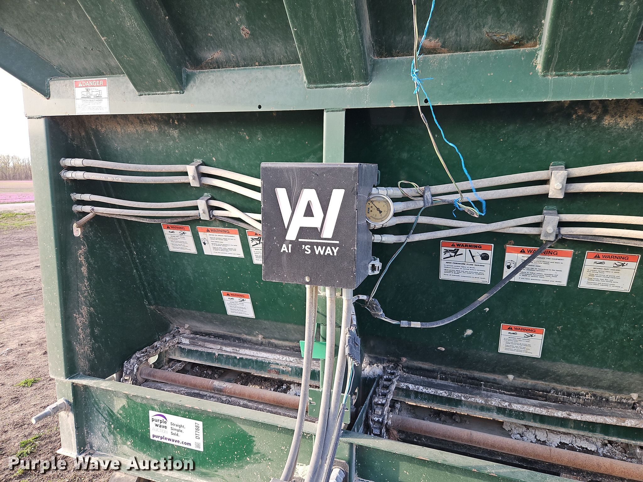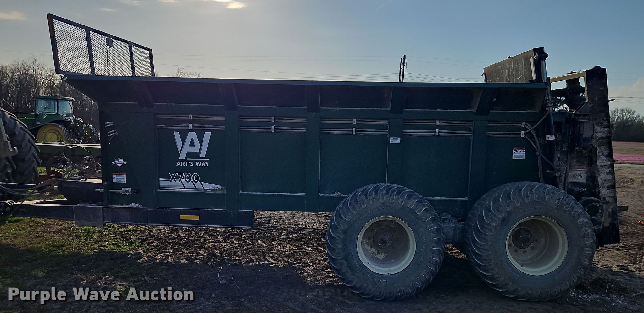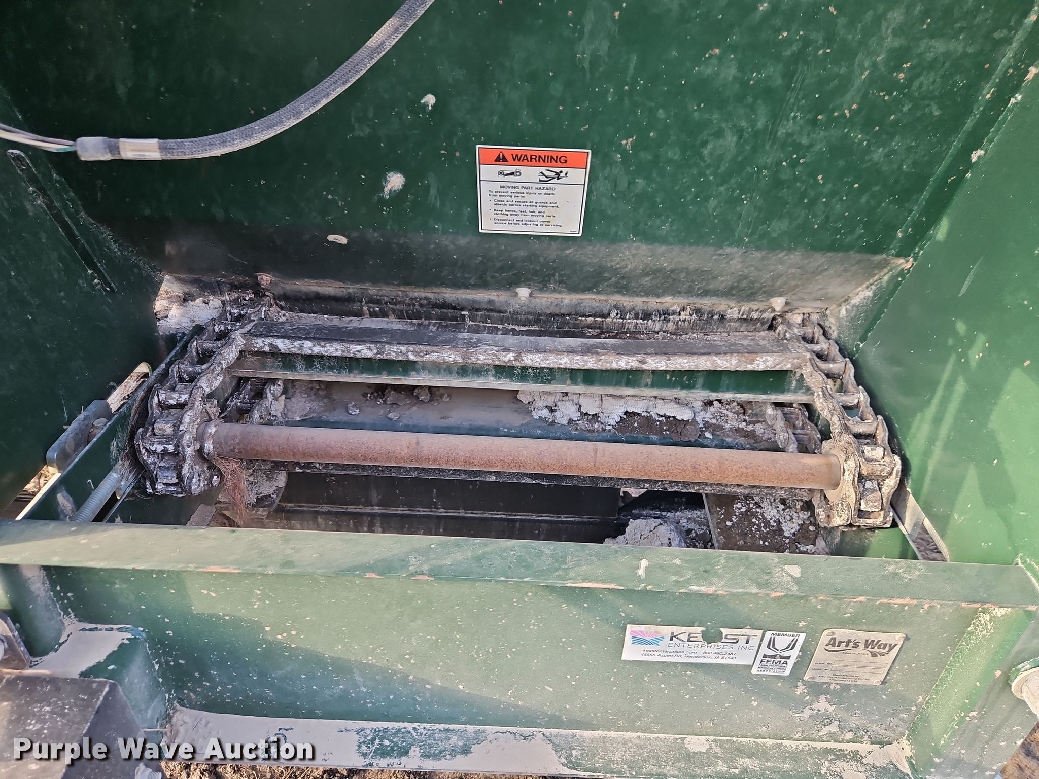 Arts Way 690700 manure spreader. Serial: AWX700001416. Features 26' L x 139" W, Side height: 60", Chain driven floor, Rear beaters: Vertical Quantity: 2, PTO: 1 3/4" 1000. Chassis Suspension: Walking beam, Axles: Tandem. Tires Size: 600/50R22.5. Notes Tractor not included. Butler, MO 64730