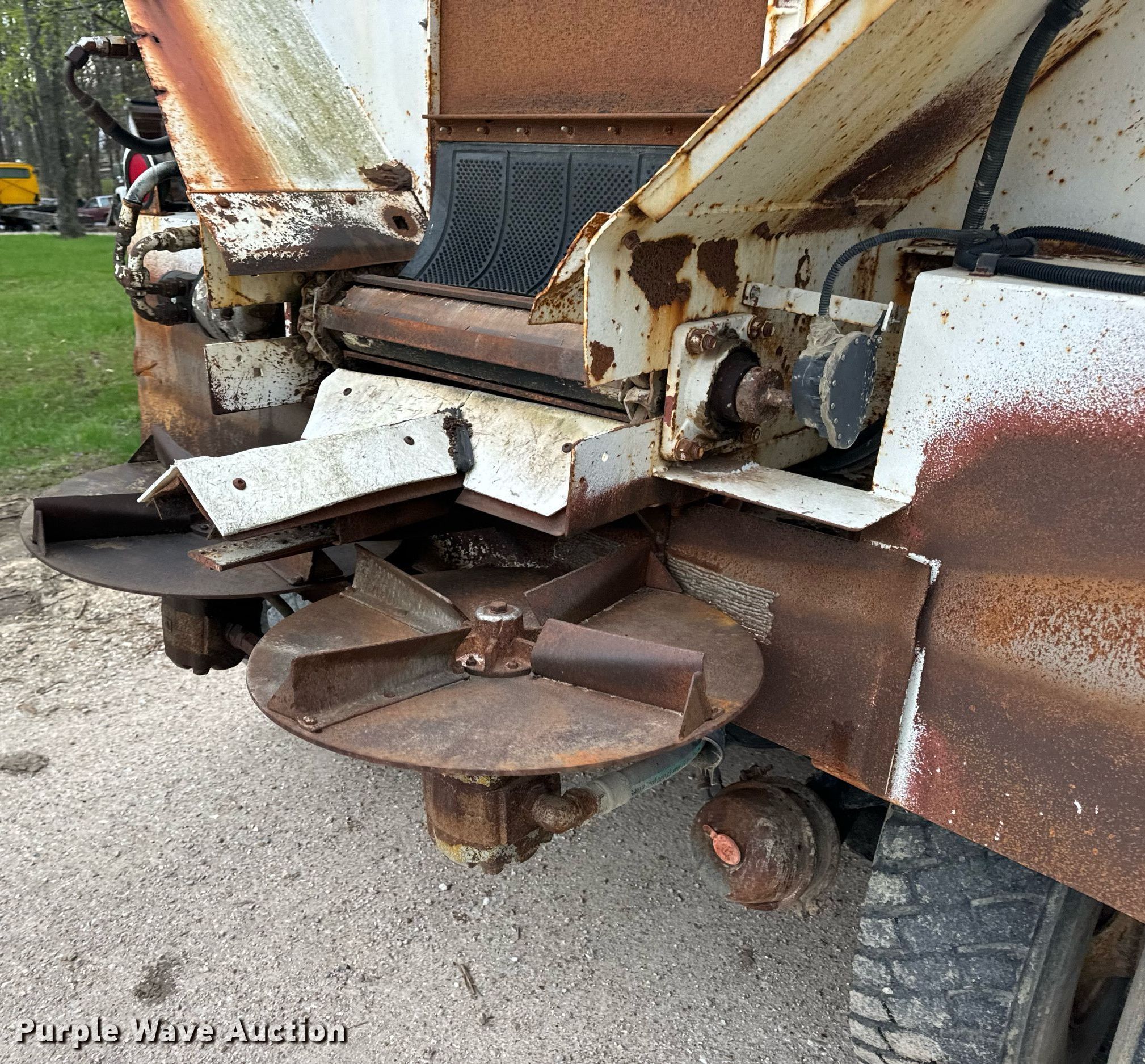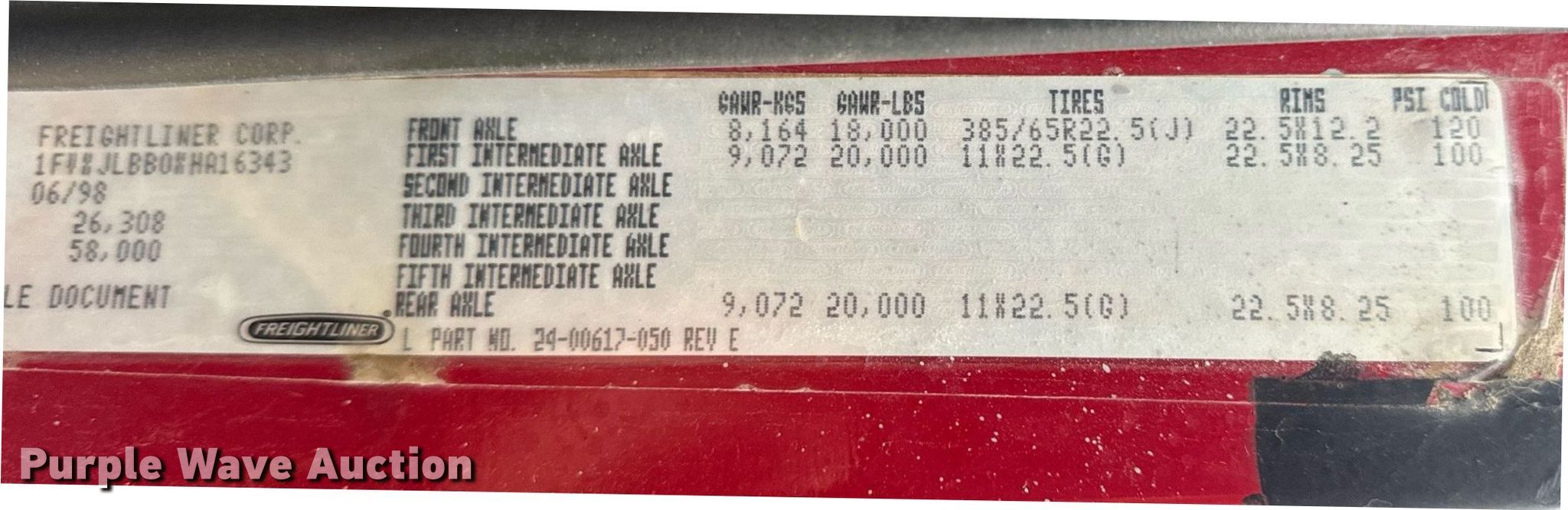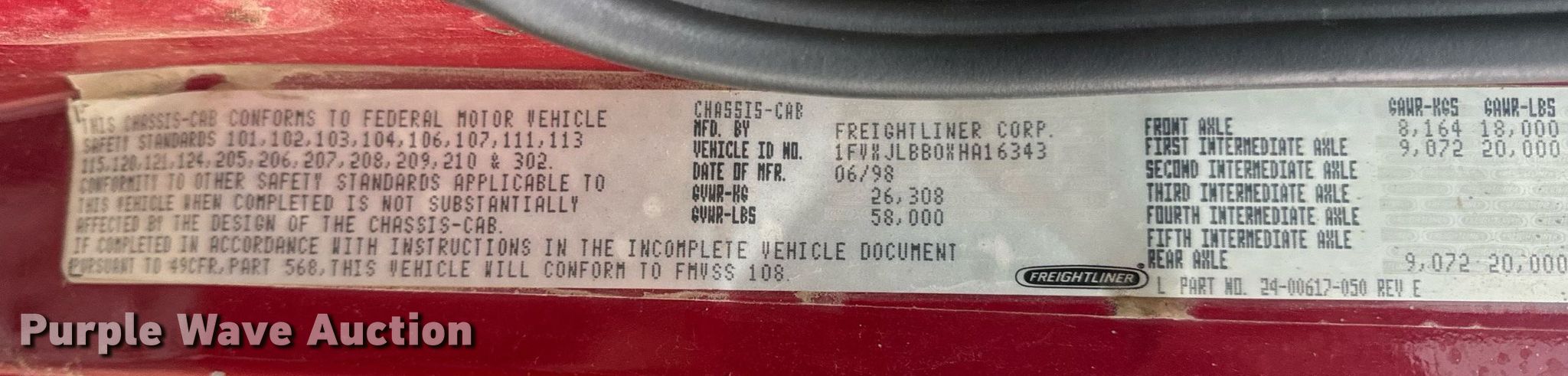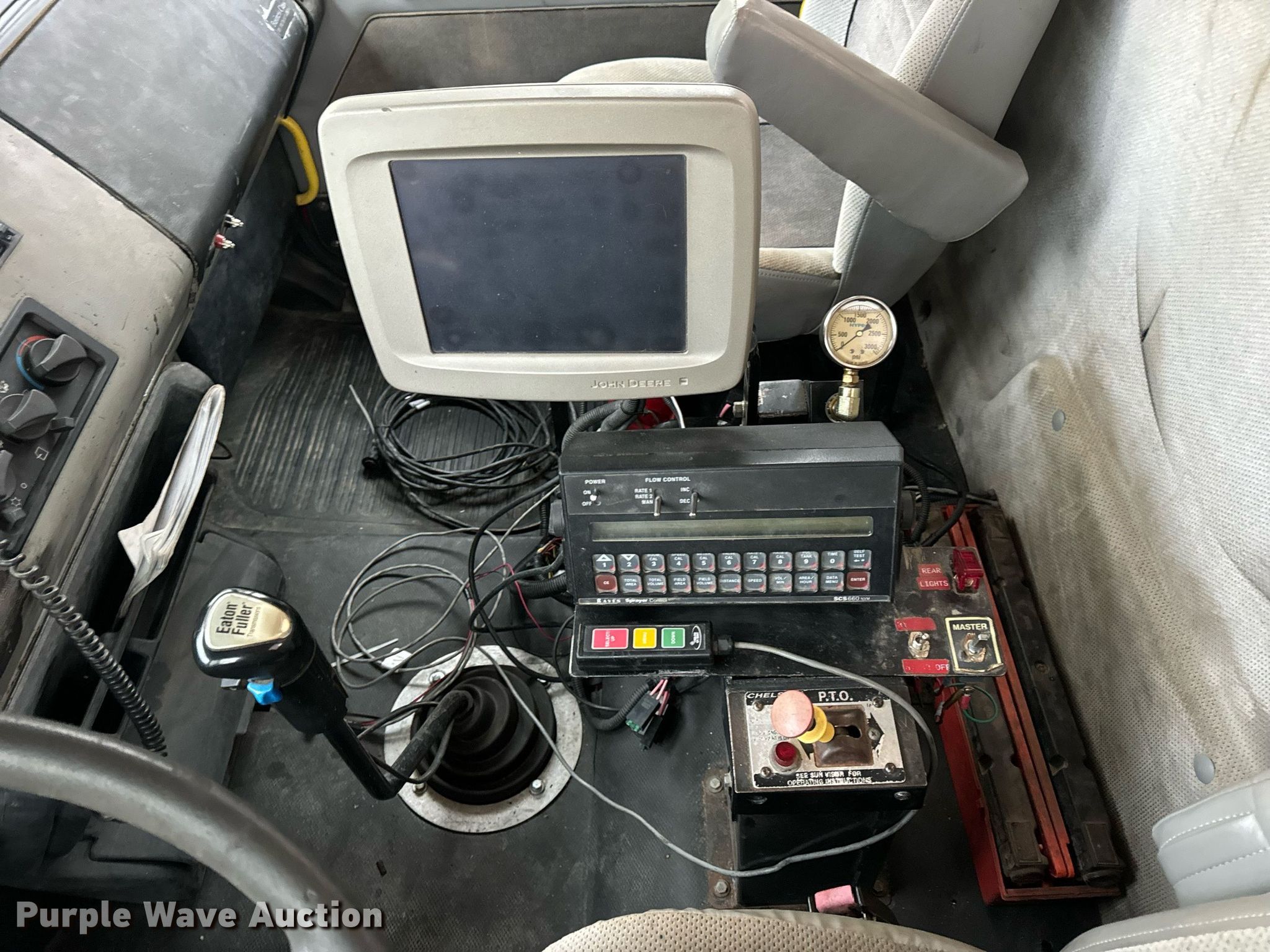 1999 Freightliner FL80 applicator truck. Miles: 43,342 on odometer, Engine hours: 9,441 on meter, VIN: 1FVXJLBB0XHA16343. Engine Cummins, Displacement: 8.3L, Cylinders: 6, Fuel type: Diesel. Transmission Eaton Fuller 8LL, Manual, Speed: 10. Chassis Axles: Tandem, Suspension: Spring over walking beam, Brakes: Air, PTO, GVWR: 58,000 lbs IAWR: 20,000 lbs, RAWR: 20,000 lbs. Operators station AC, Heat. Features Dry fertilizer spreader bed Highway Equipment Company L-3020-15, Serial: 86835, Length: 15', Dual spinners, Conveyor belt Width: 24", Electronics GPS monitor John Deere, GPS receiver John Deere StarFire ITC, Spray controls Raven SCS660NVM.. Tires Front: 425/65R22.5, Rear: 11R22.5. Notes Windshield chipped or cracked, Dash warning indicator: Check Engine, AC issues, needs charged, Bed issues, rust, Rear tire issues, damaged. Missouri title. Title distribution may be delayed up to 14 days from verification of funds. Eldon, MO 65026
