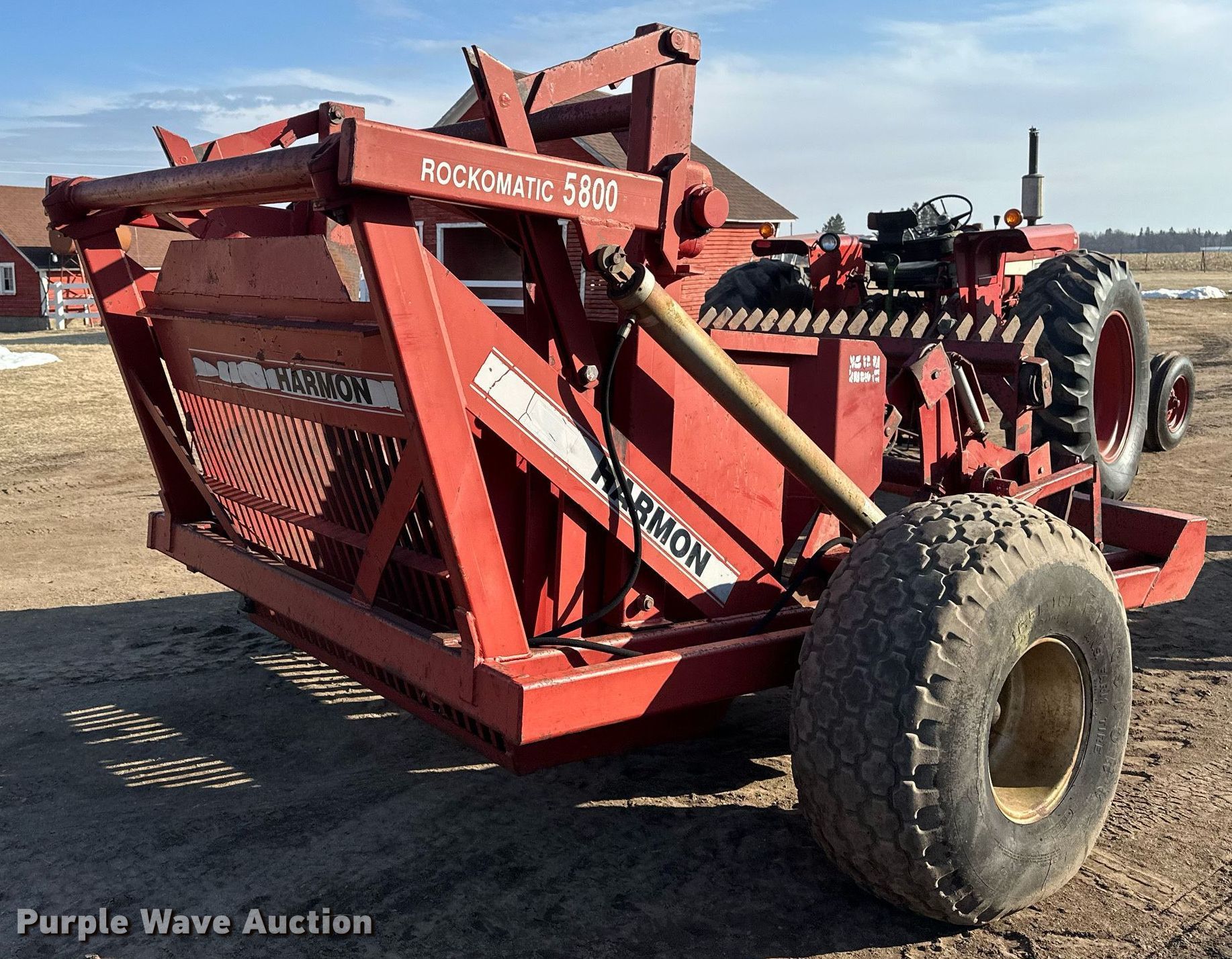 1990 Harmon Rockomatic 5800 rock picker. Serial: A-01065. Features PTO: 540, Working width: 60", Adjustable hitch, Hydraulic dump. Tires Size: 15.5L-16.1. Notes Tractor not included. Kern & Tabery, Inc.. Sebeka, MN 56477