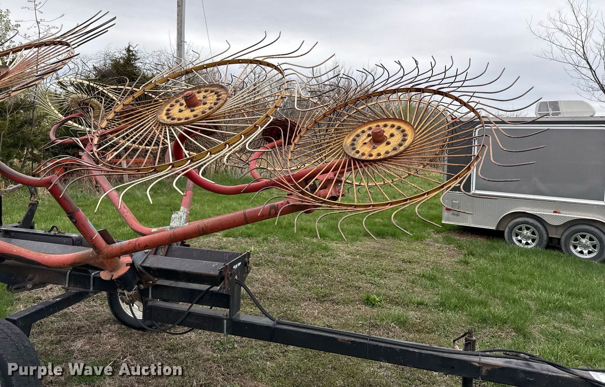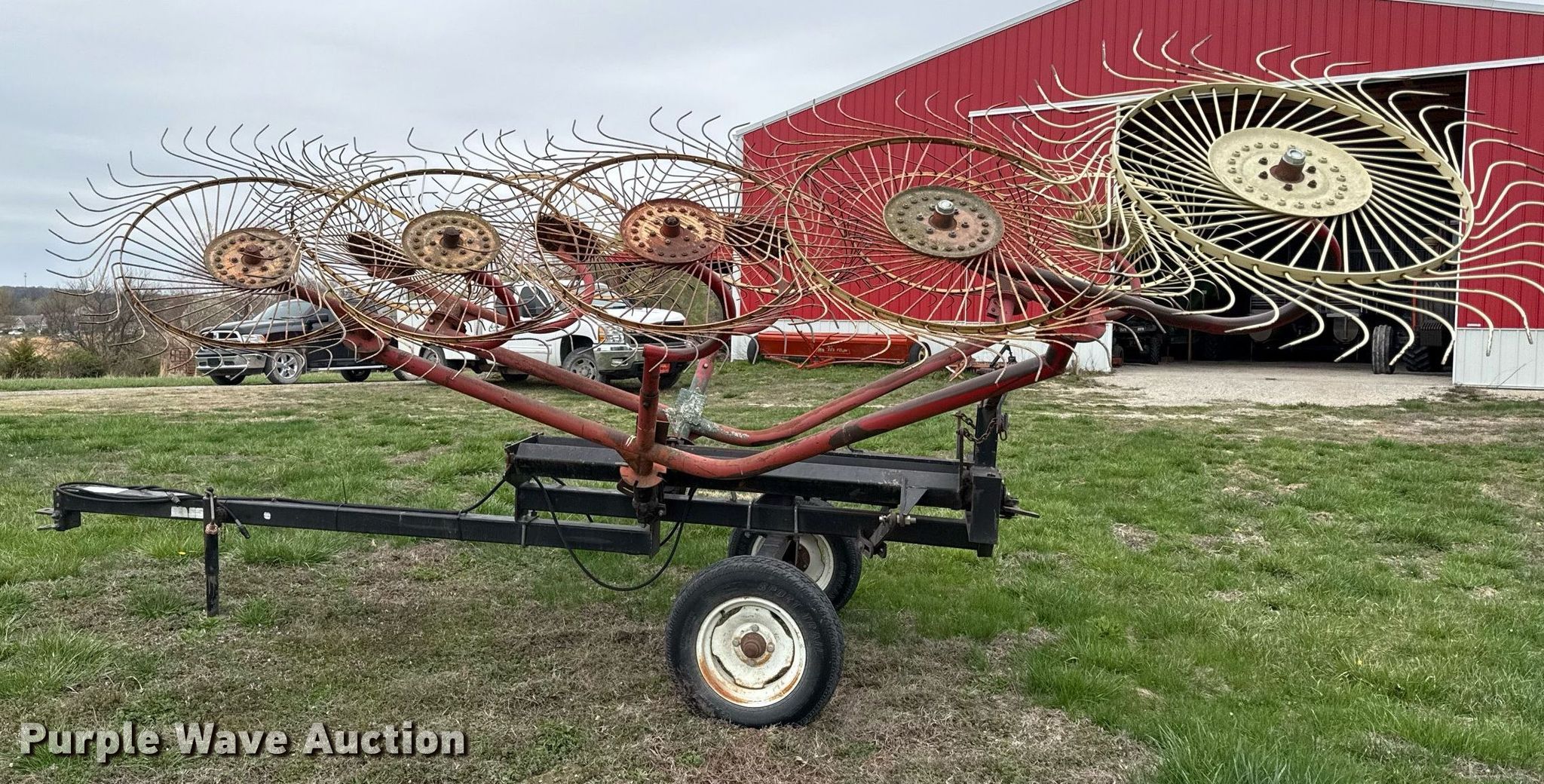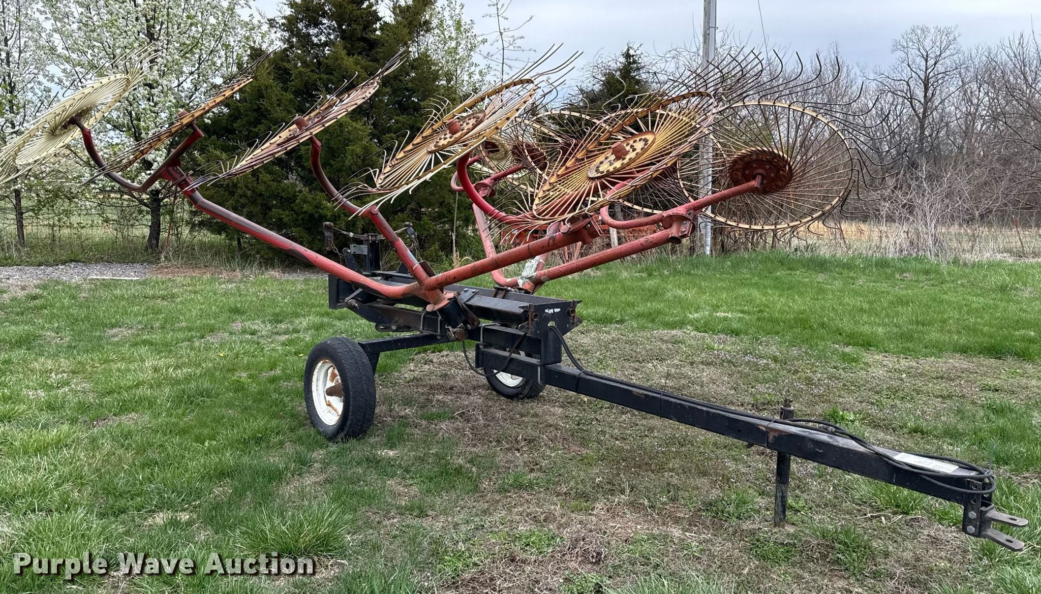 Purple Wave is selling a used Hay Rake in Kansas. This item is a Hay rake with the following: Wheels: 10, Diameter: 27", Hydraulic fold, Ground driven