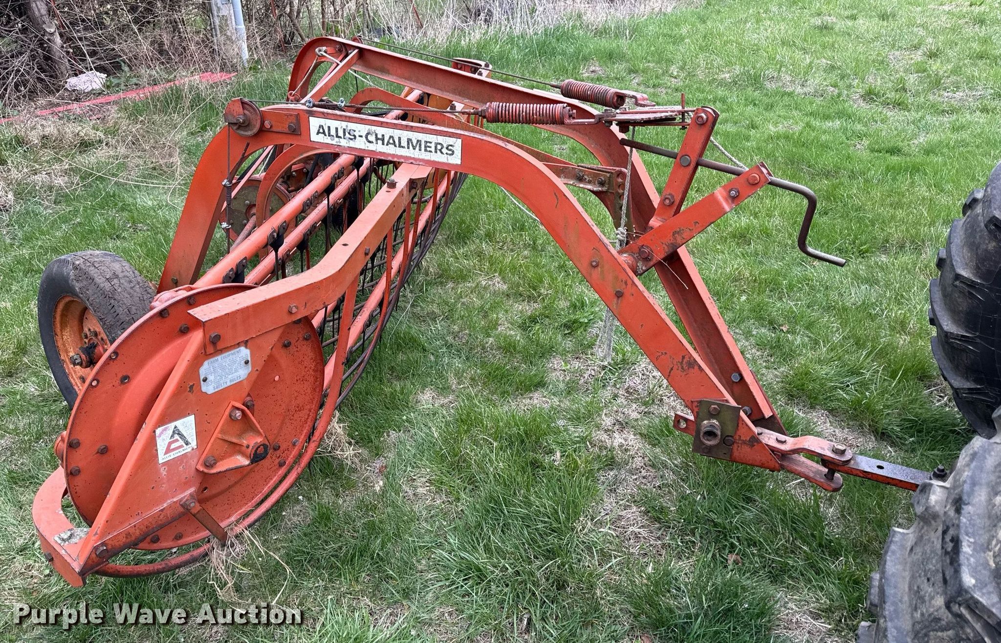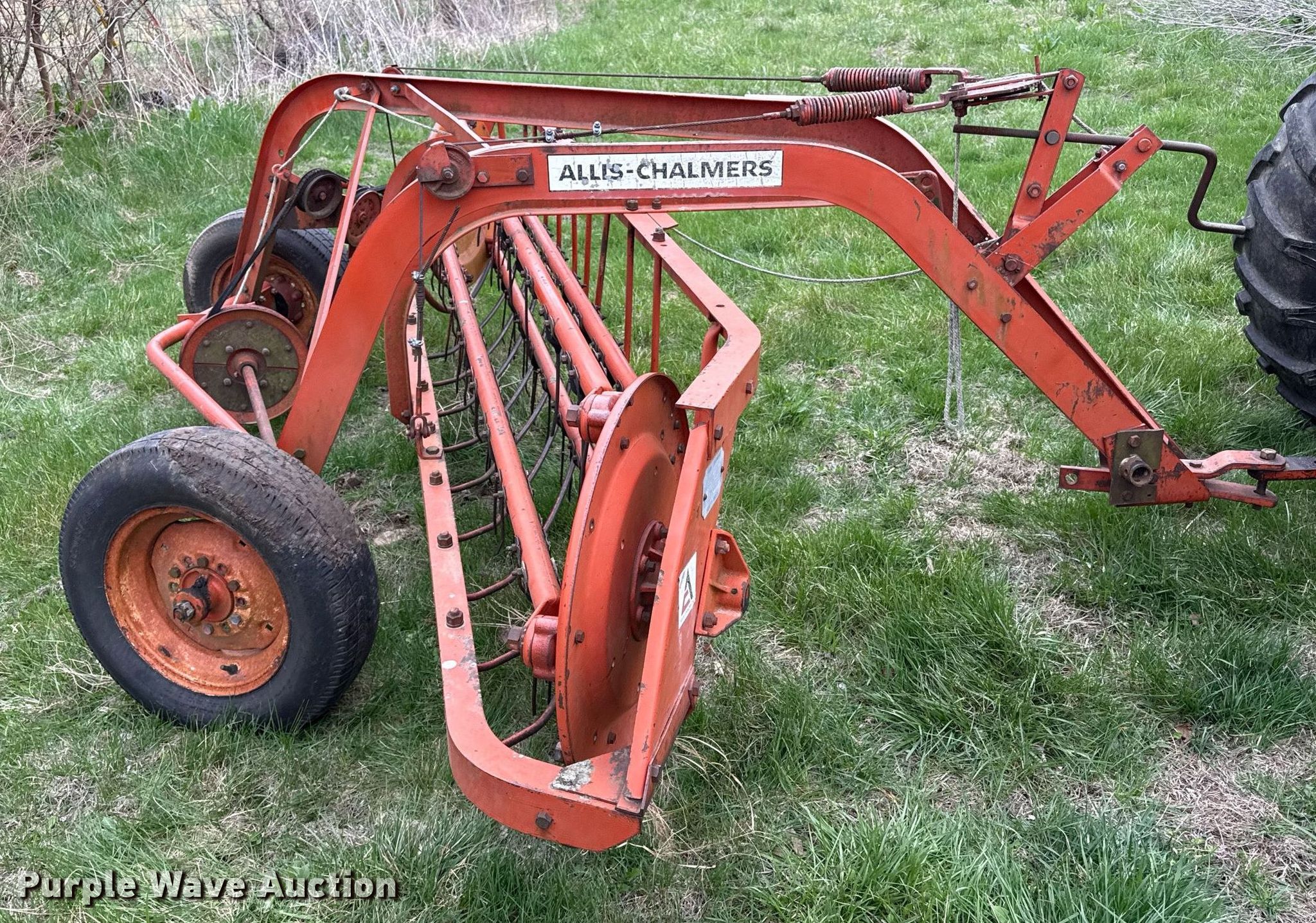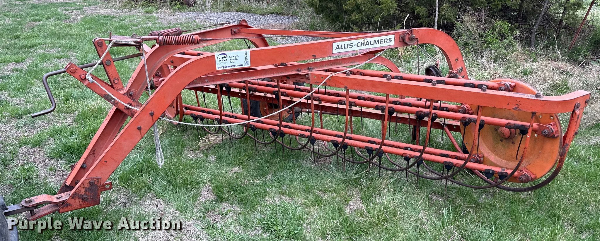 Purple Wave is selling a used Hay Rake in Kansas. This item is a Allis Chalmers hay rake with the following: Width: 8', Ground driven