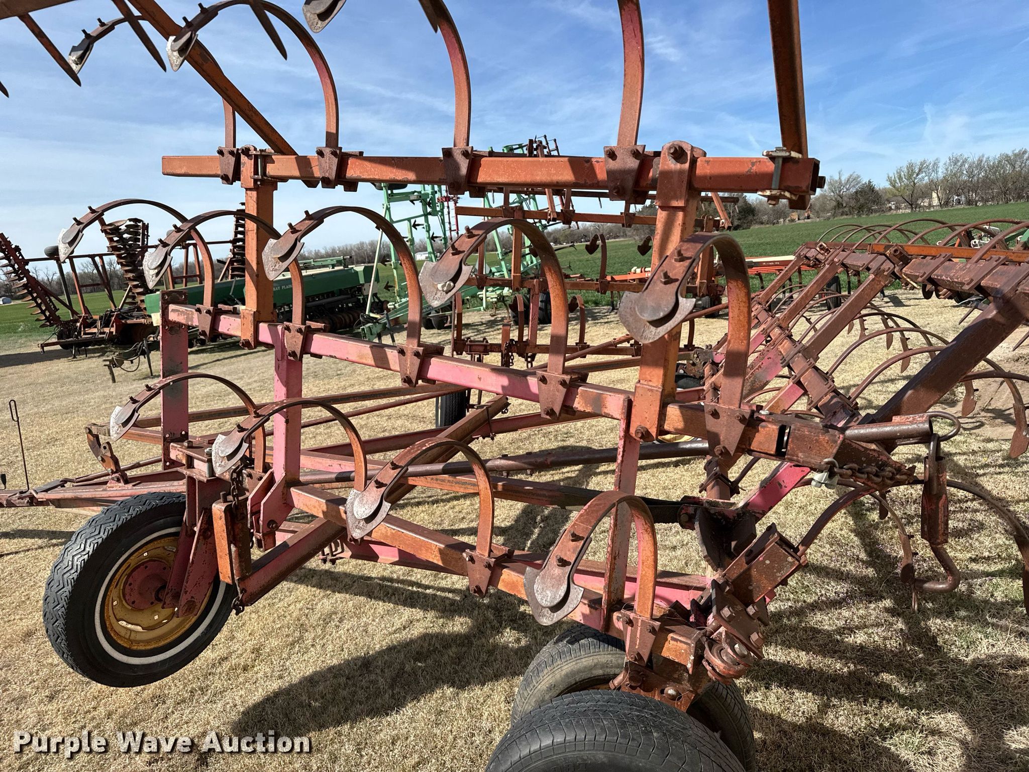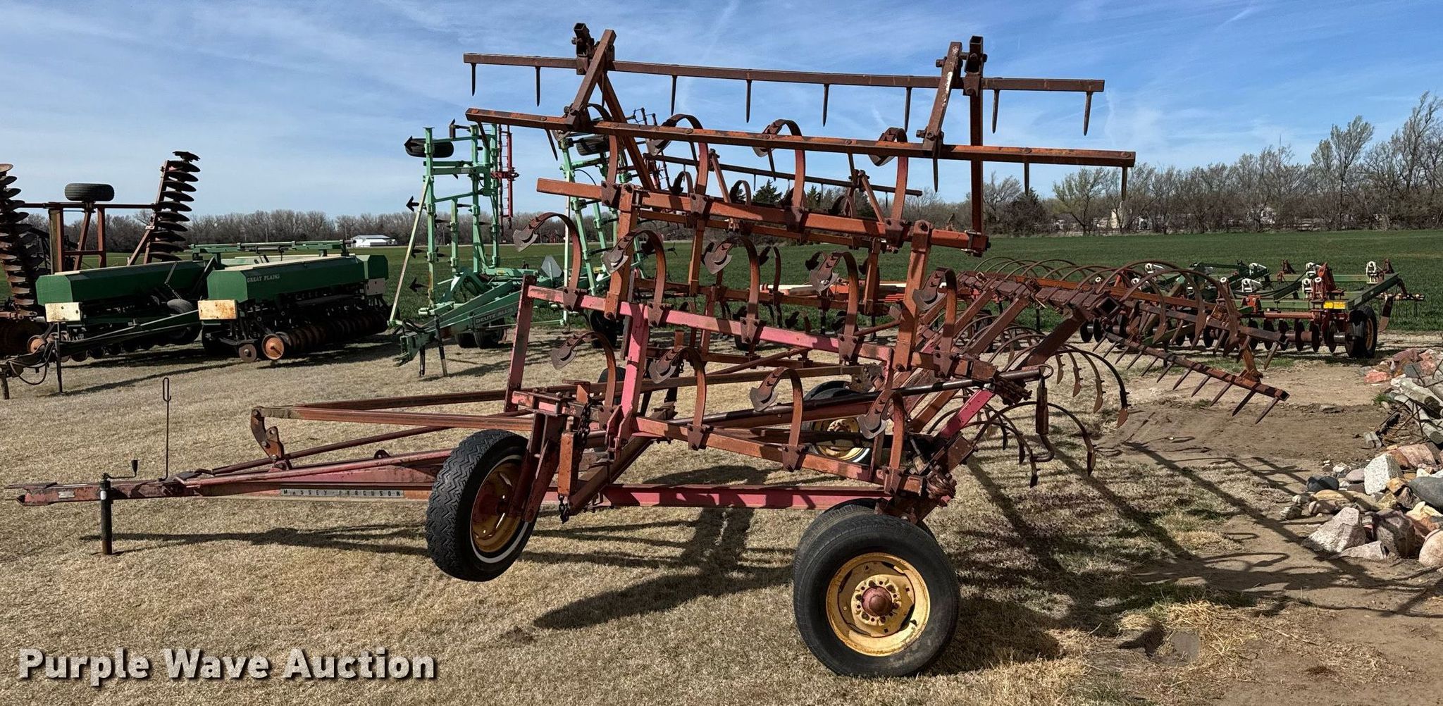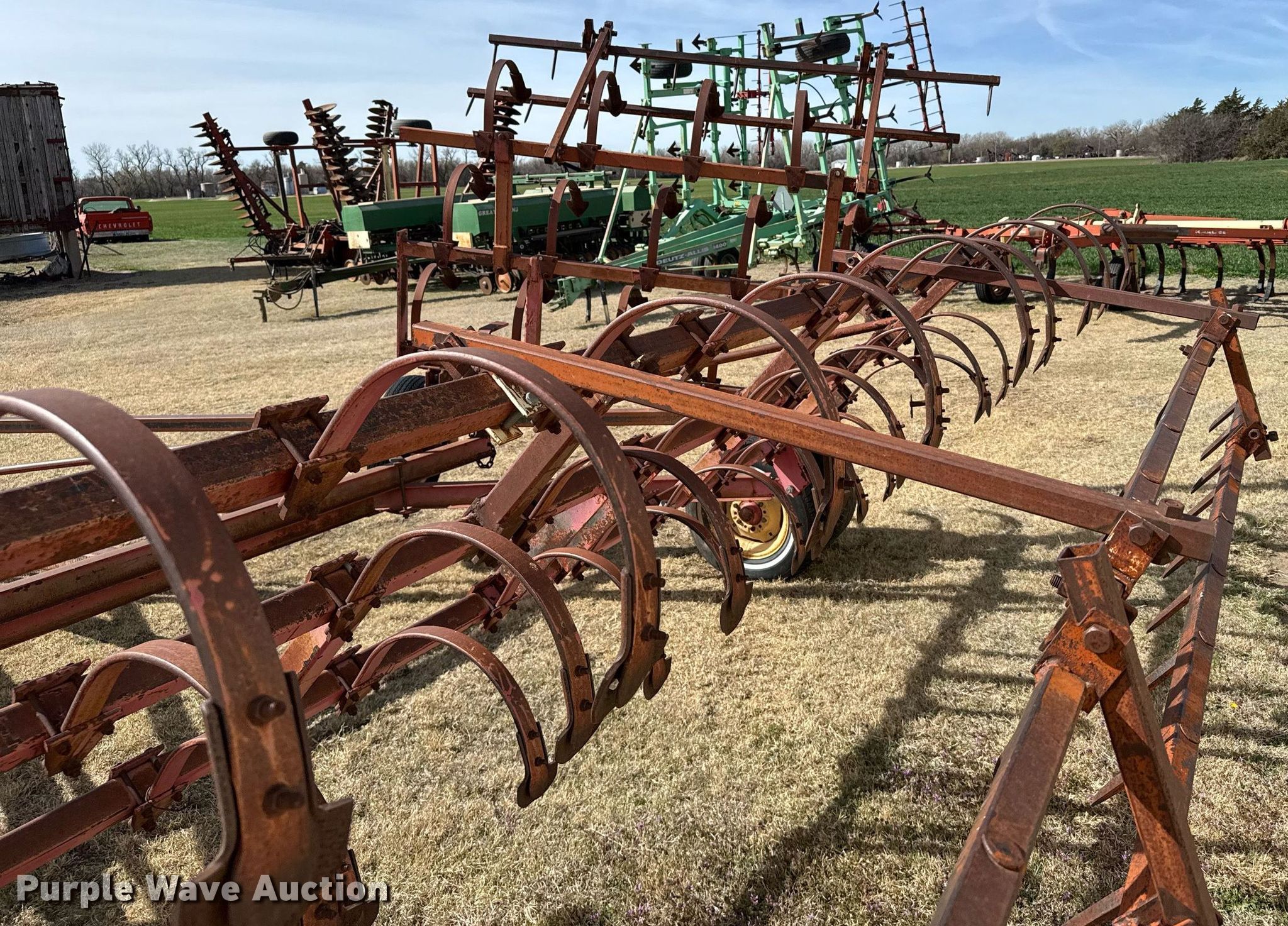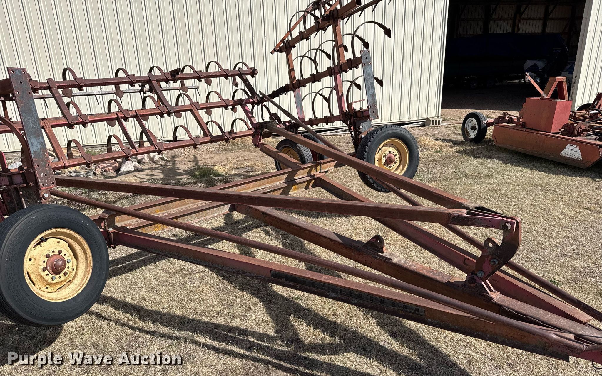 Massey-Ferguson 60 field cultivator. Overall width: 28', Serial: 1720001539. Features Shanks: 52, Sweep width: 4", Attachments Spike tooth harrow Harrow bars: 2.. Tires Tire size: 205/70R15, Gauge wheels. Knop Farms. Ellinwood, KS 67526