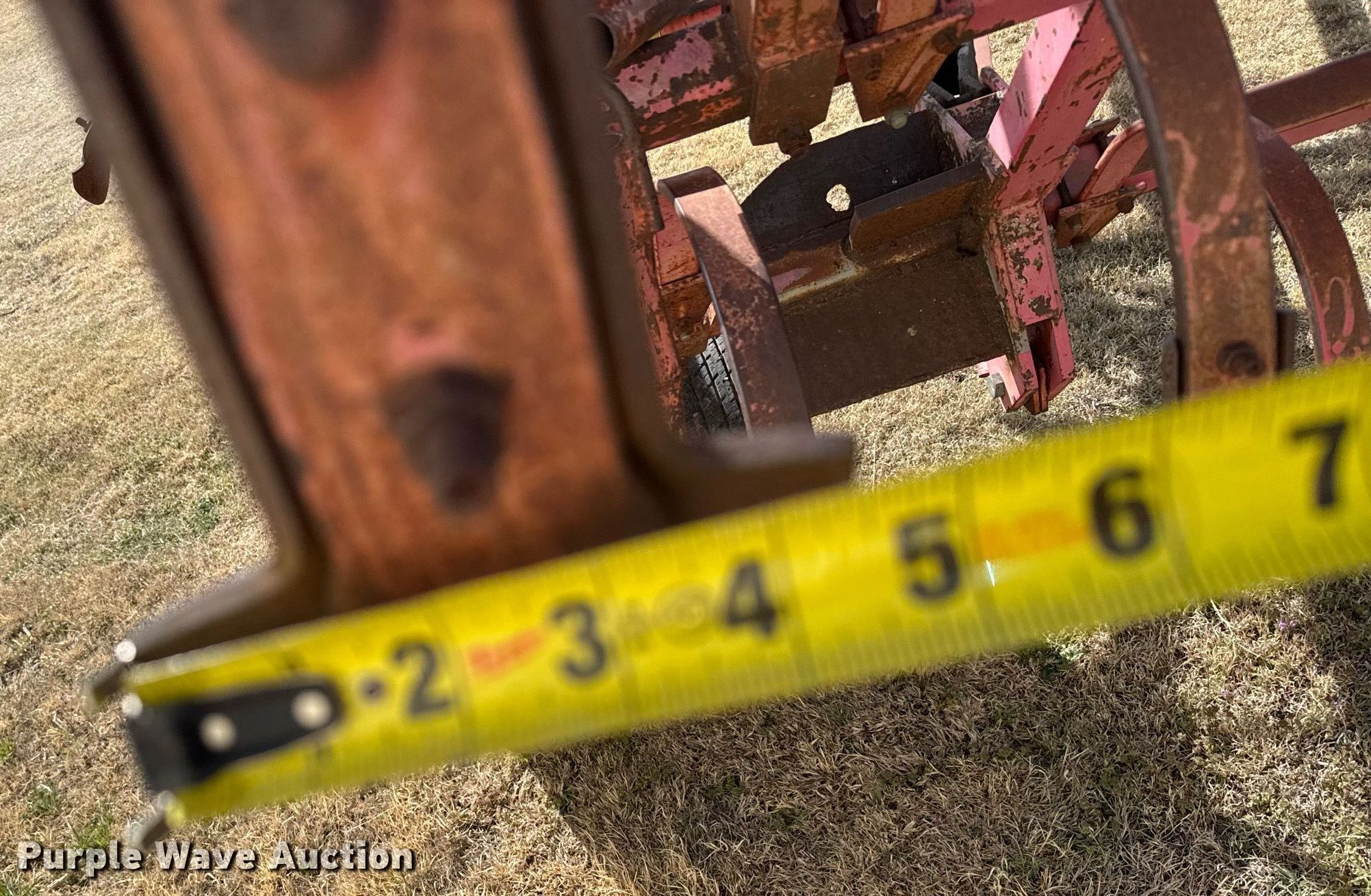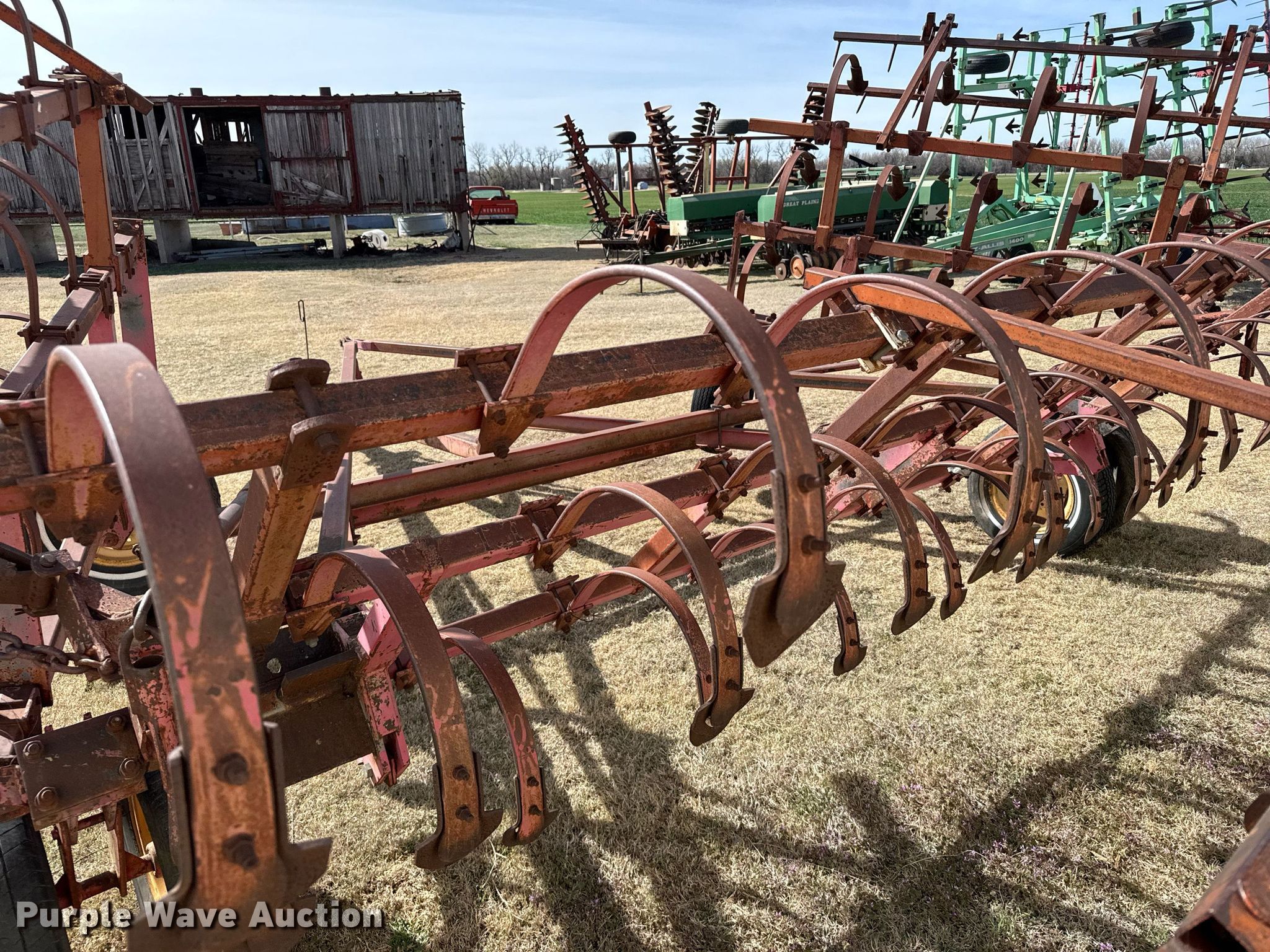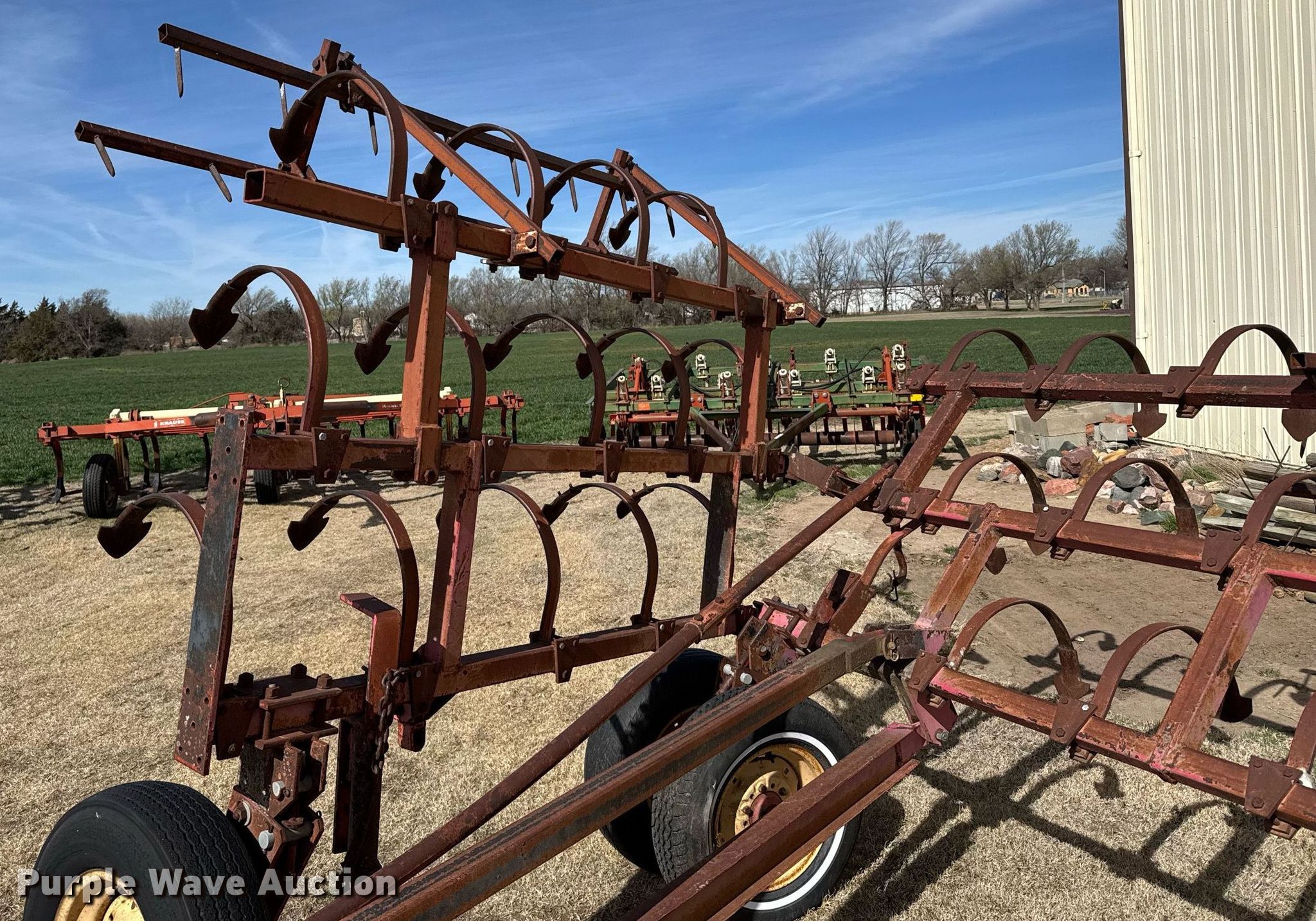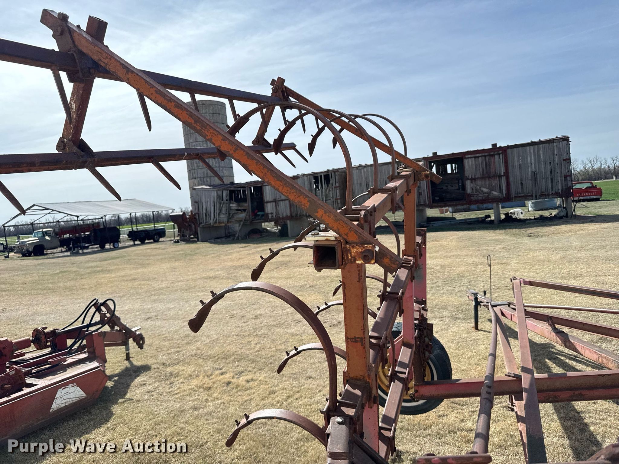 Massey-Ferguson 60 field cultivator. Overall width: 28', Serial: 1720001539. Features Shanks: 52, Sweep width: 4", Attachments Spike tooth harrow Harrow bars: 2.. Tires Tire size: 205/70R15, Gauge wheels. Knop Farms. Ellinwood, KS 67526