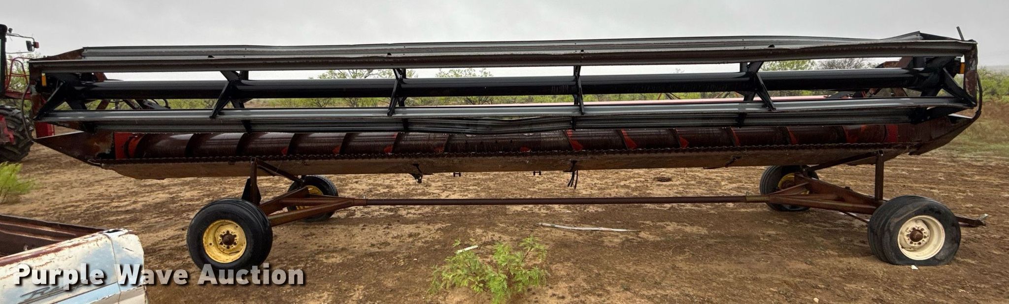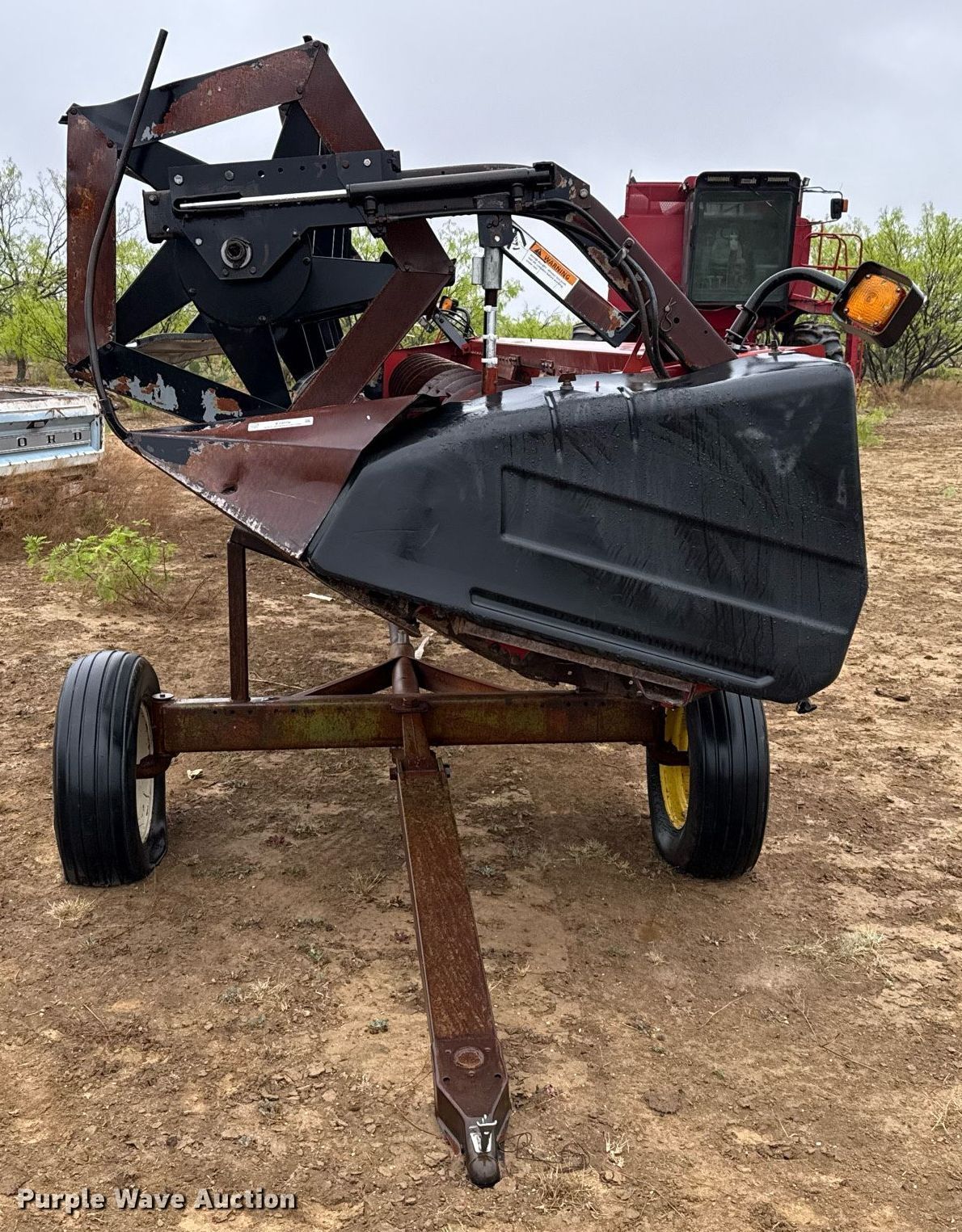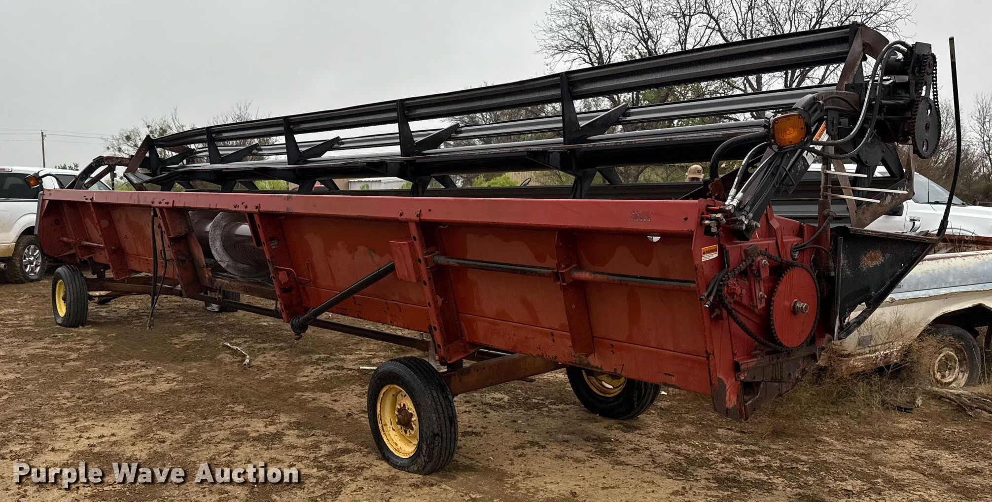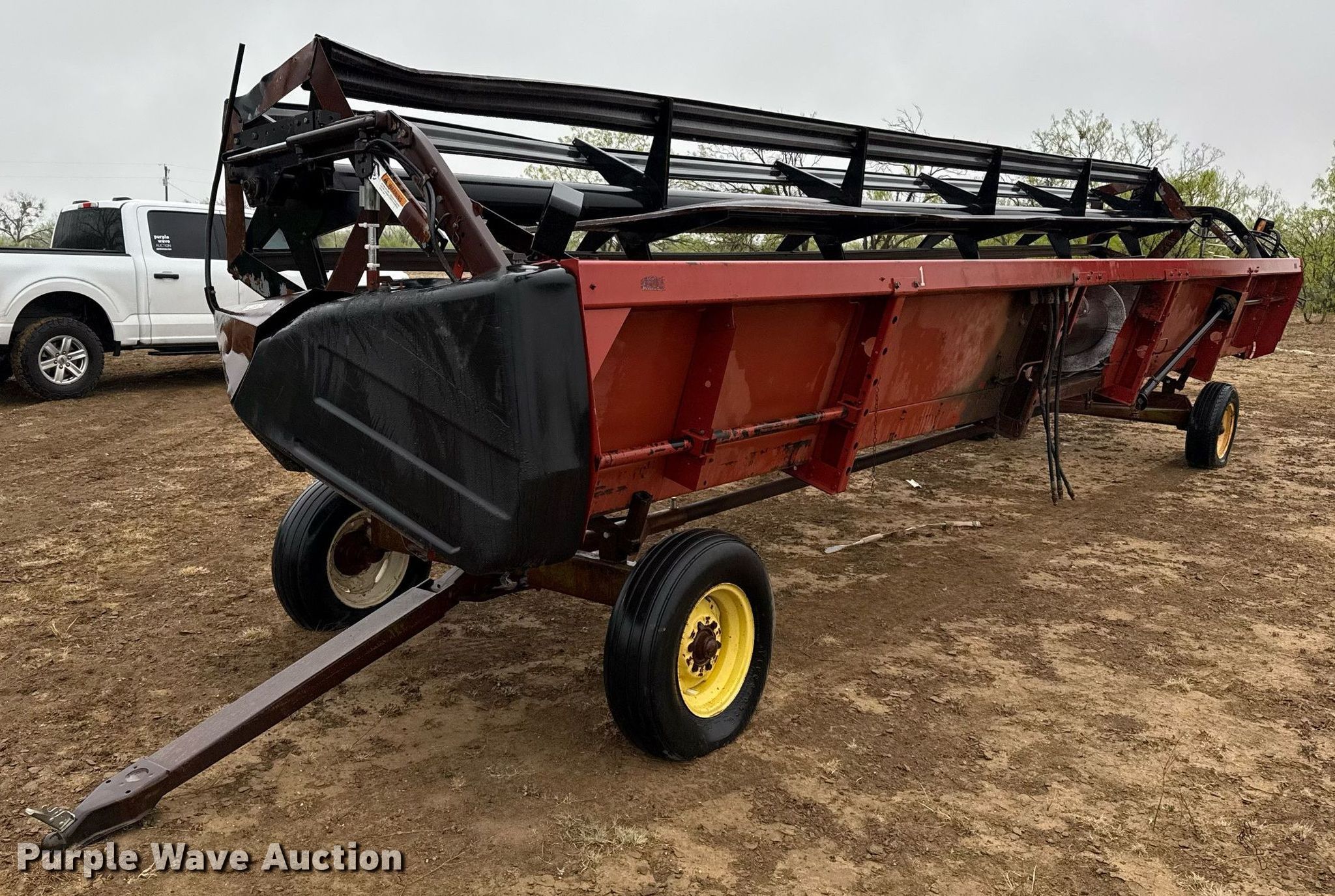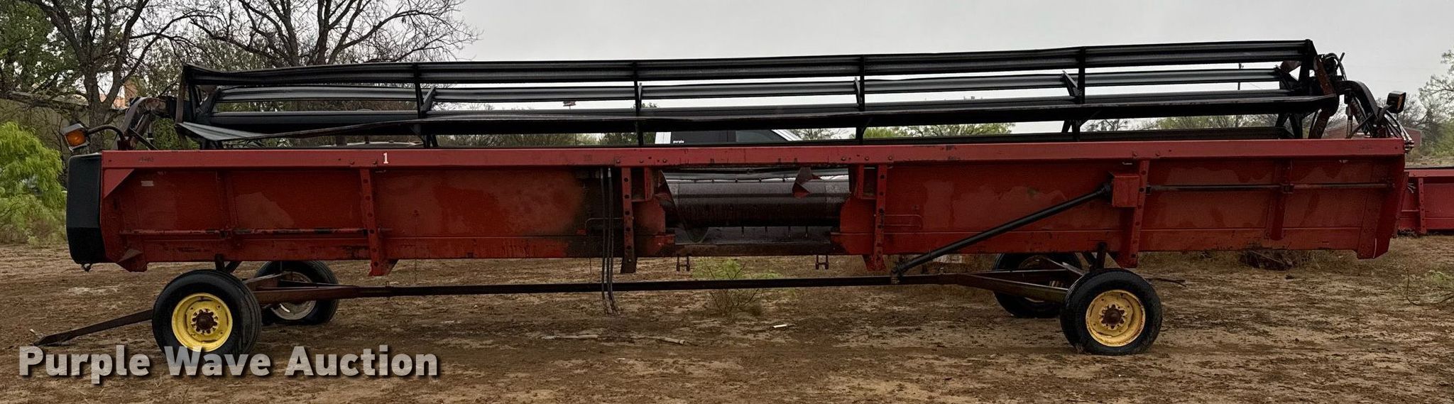1995 Case 1010 rigid head. Serial: JJC0200903. Features Width: 30', Reel: Bat Hydraulic fore/aft, Hydraulic reel height control, Skid plates: Steel, Drivelines: Dual. Trailer 26' 9" L x 79" W, Ball hitch size: 2". Tires Size: (3) 9.5L-15, 205/75R15. Notes Driveline removed, but included. Gouldbusk, TX 76845