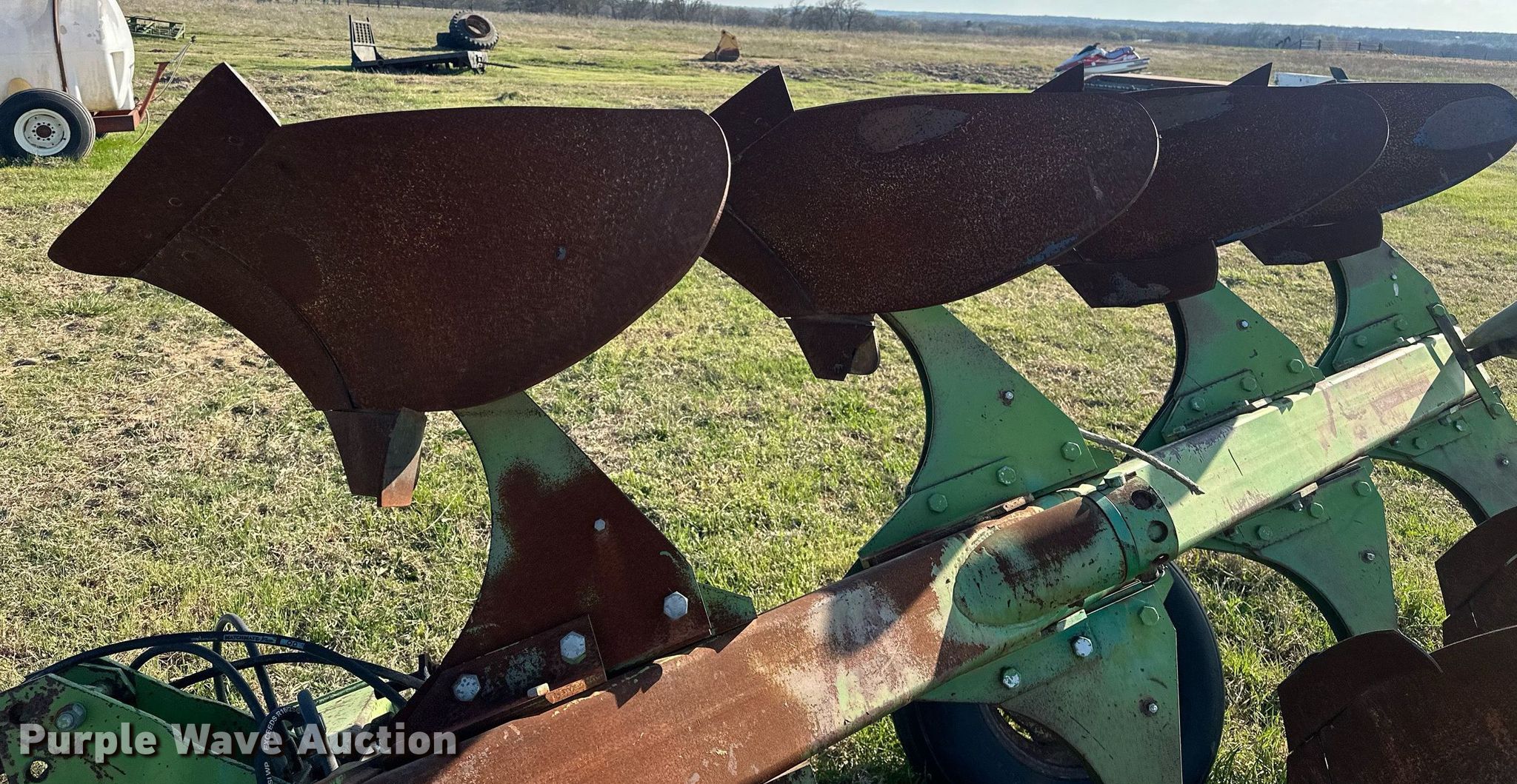 Purple Wave is selling a used Plow in Oklahoma. This item is a John Deere E-8350 eight bottom two-way plow with the following: Overall width: 6', Hydraulic fold, Tire size: 11L-15